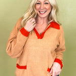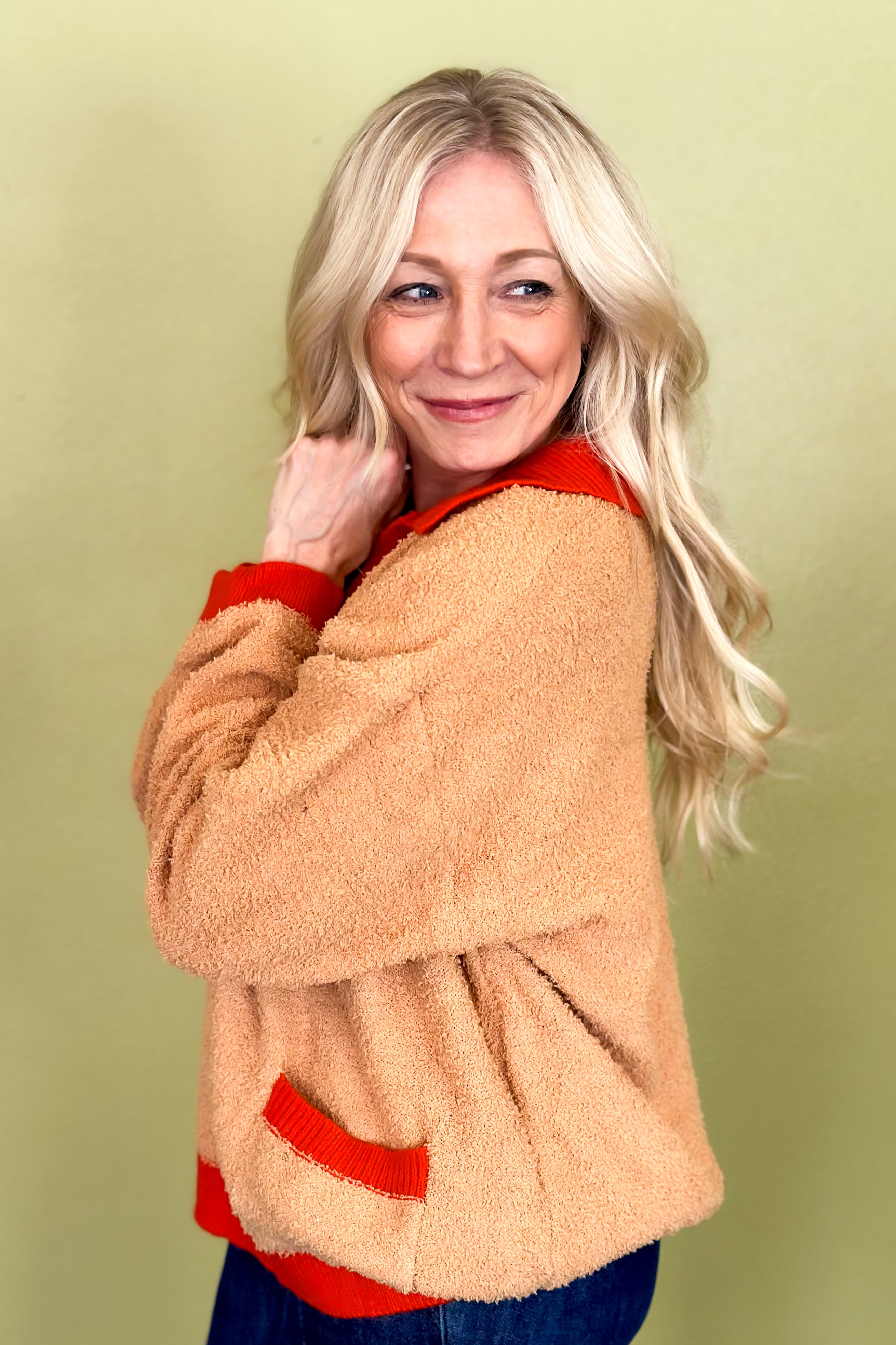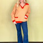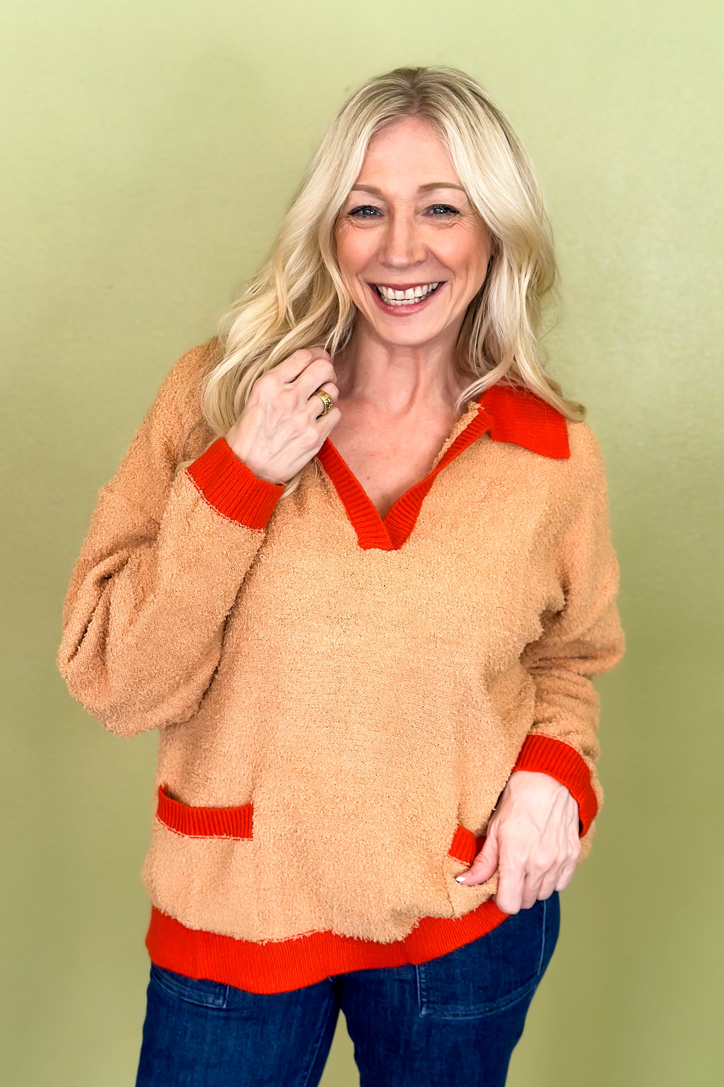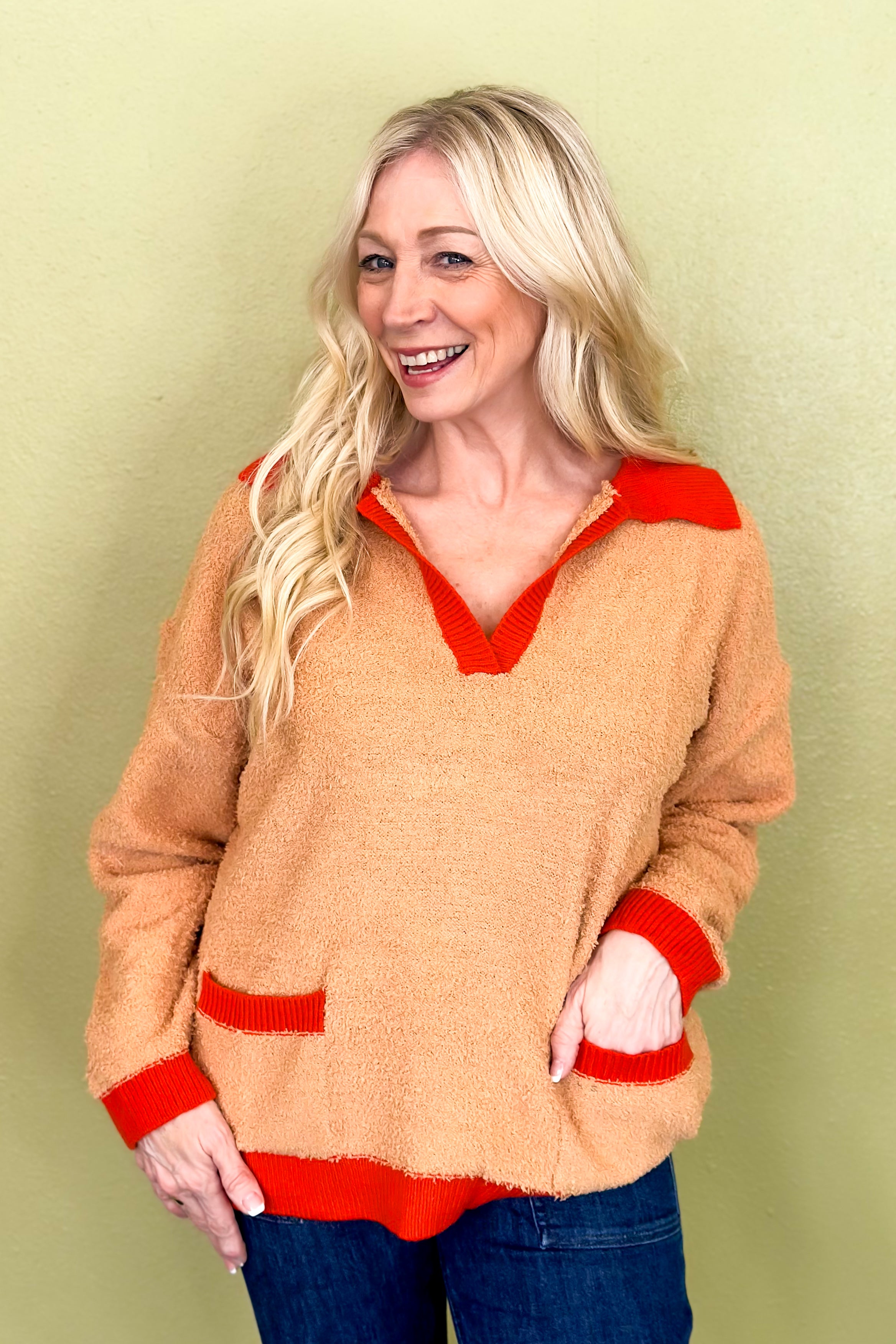 Meet "A Little Honey Sweater" bringing a dreamy blend of camel and orange in a bold two-tone design. Featuring front pockets, a collar neckline, and a relaxed, loose fit, this statement knit brings effortless warmth and style. Perfect for cozy days, layered looks, or adding a pop of color to your winter lineup.