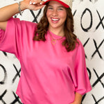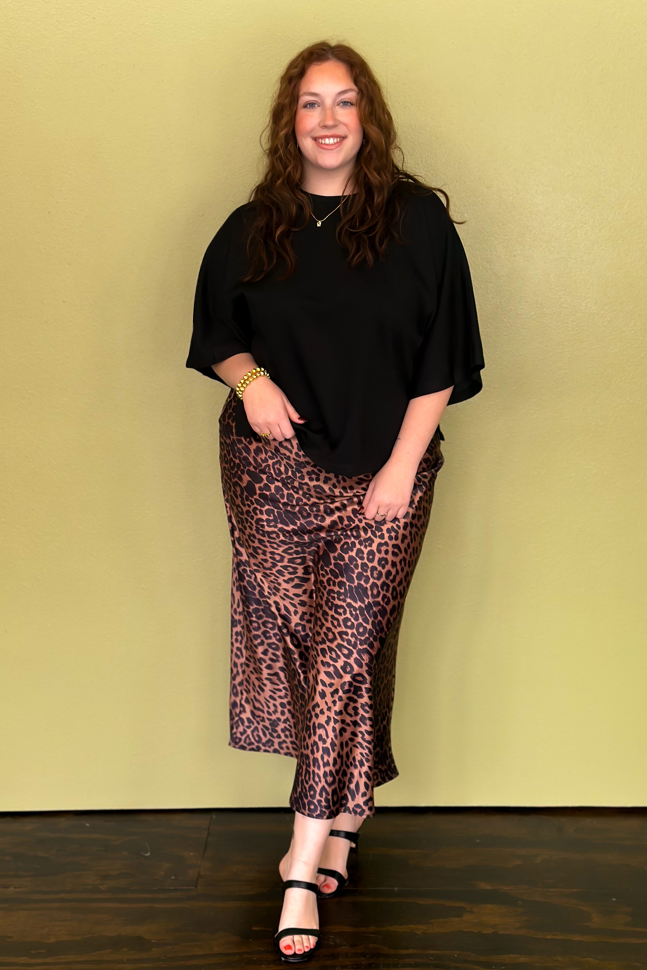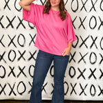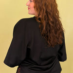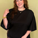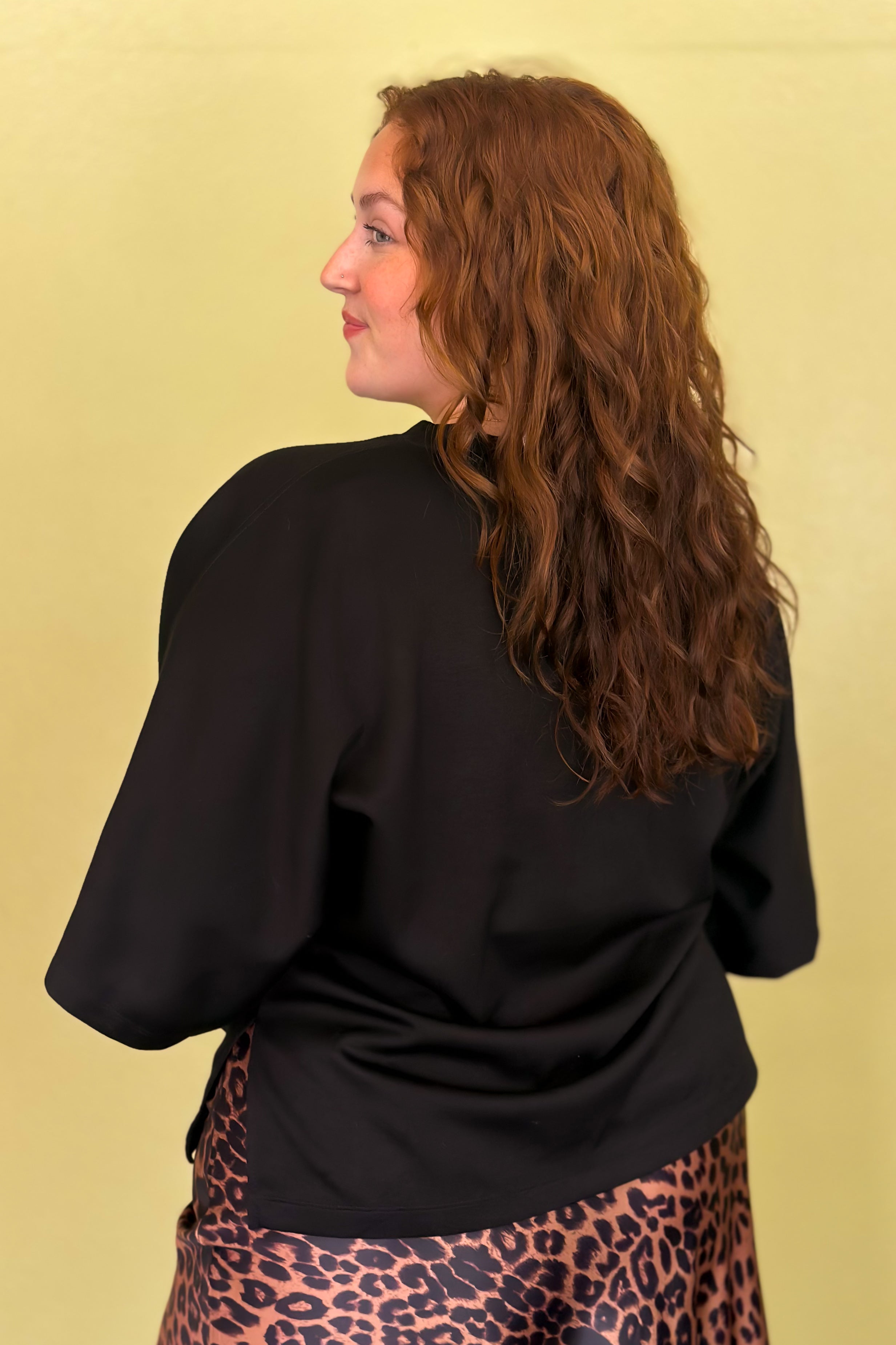 We see this chic black top with a relaxed shoulder as a top that you can really glam up. So, stop looking for the black top that goes with everything cause you have it in this one. The soft scuba feel fabric will make this great for pairing with denim or layering under jackets, it’s a go-to piece for everyday comfort with a modern touch.