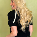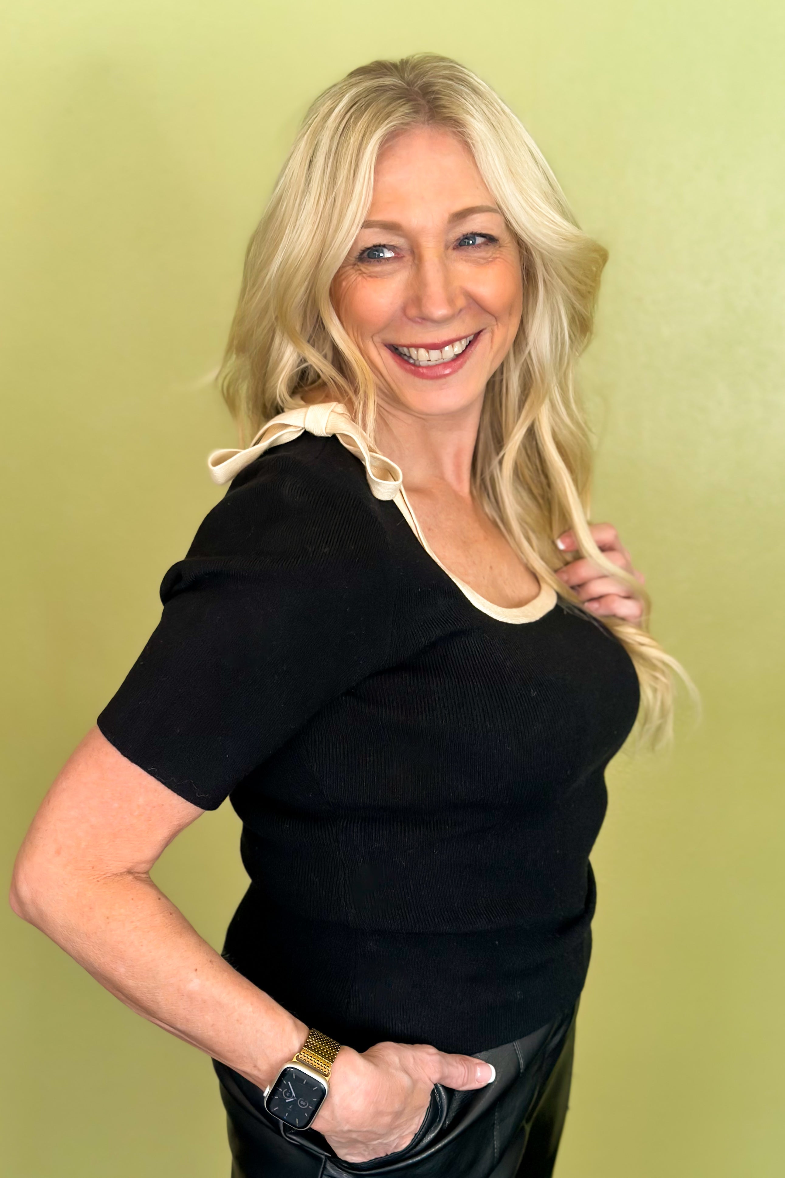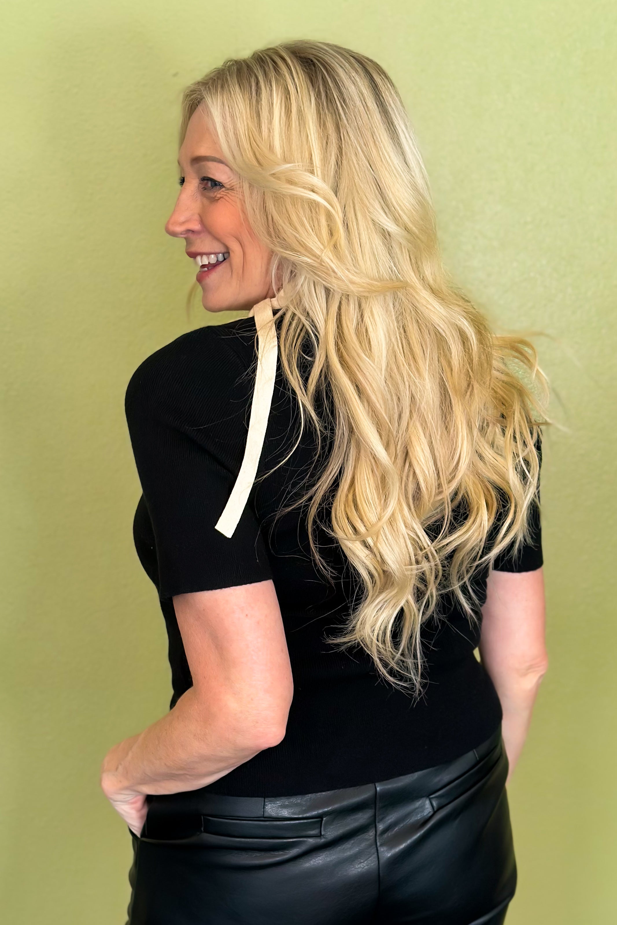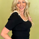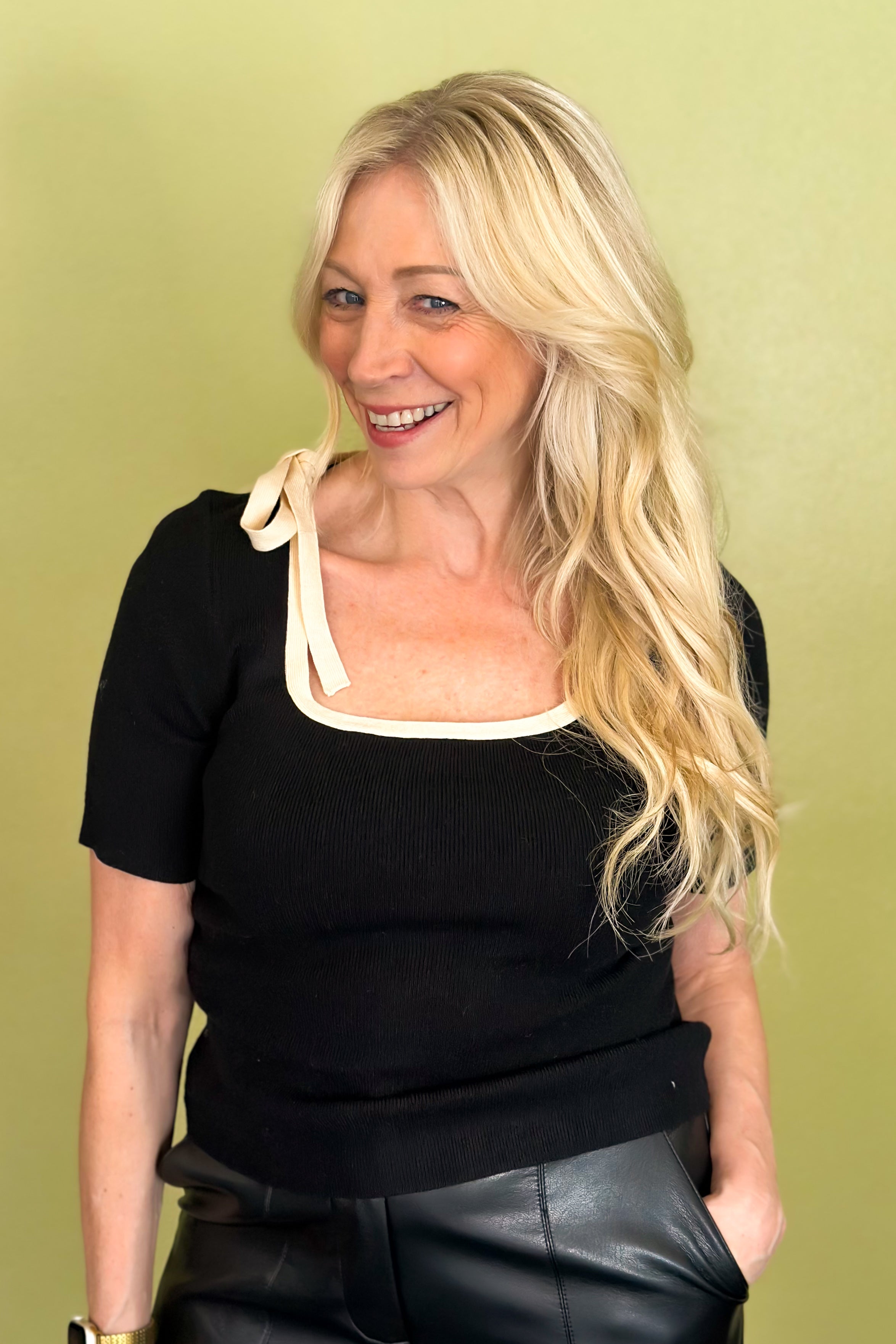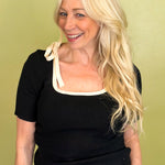 Take your style to the place that makes you feel most yourself with this black and cream square neck sweater. The square neck is one of our favorite necklines framing out your beautiful face with the contrast trim and ties at the shoulder. The sleek fit of this knit short sleeve top makes it a great pairing for jeans or your favorite skirt for work.