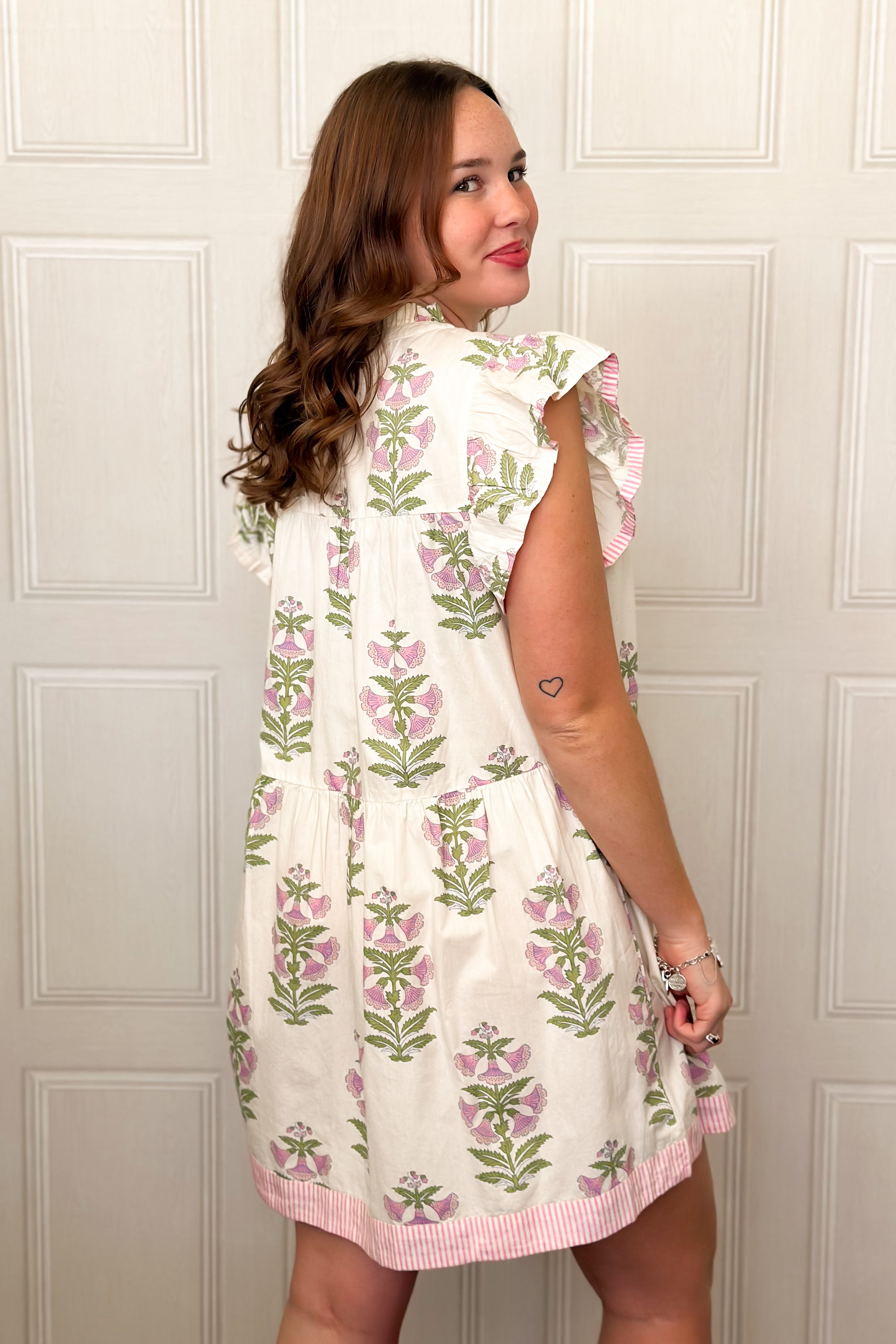 Some of our favorite dress are the ones that have the sweet florals that emote such a feeling of the beauty around us. This poplin tiered dress features a contrast bottom hem, with darling flutter sleeves and ruffle neckline. This is the perfect spring or Easter dress that sandals or your cowboy boots for family pictures.