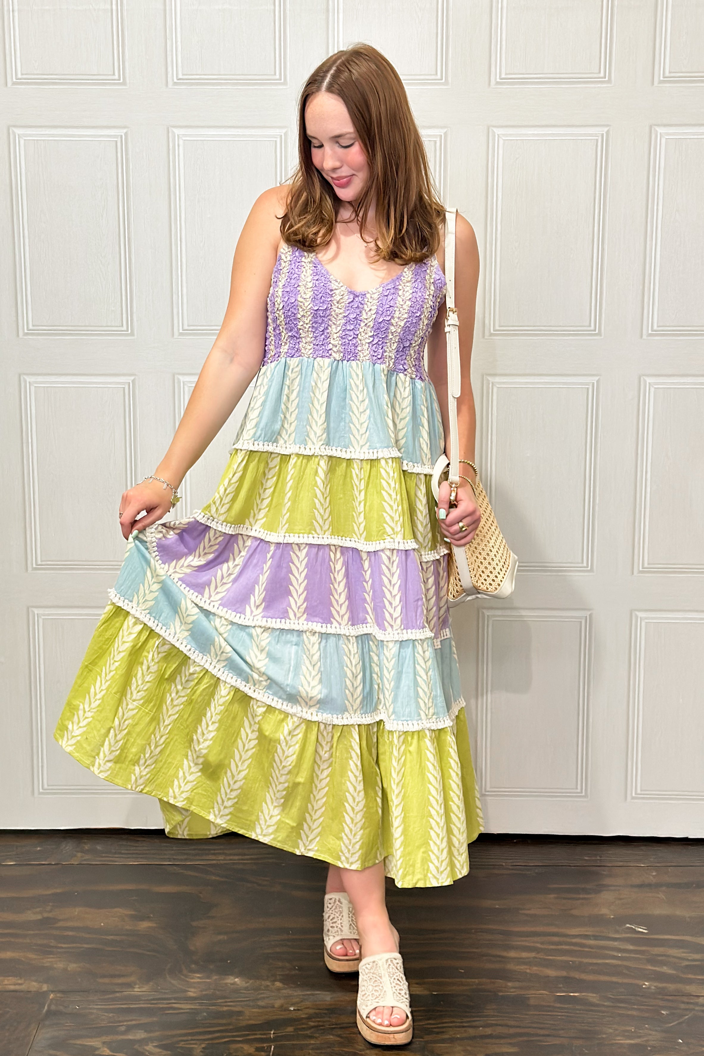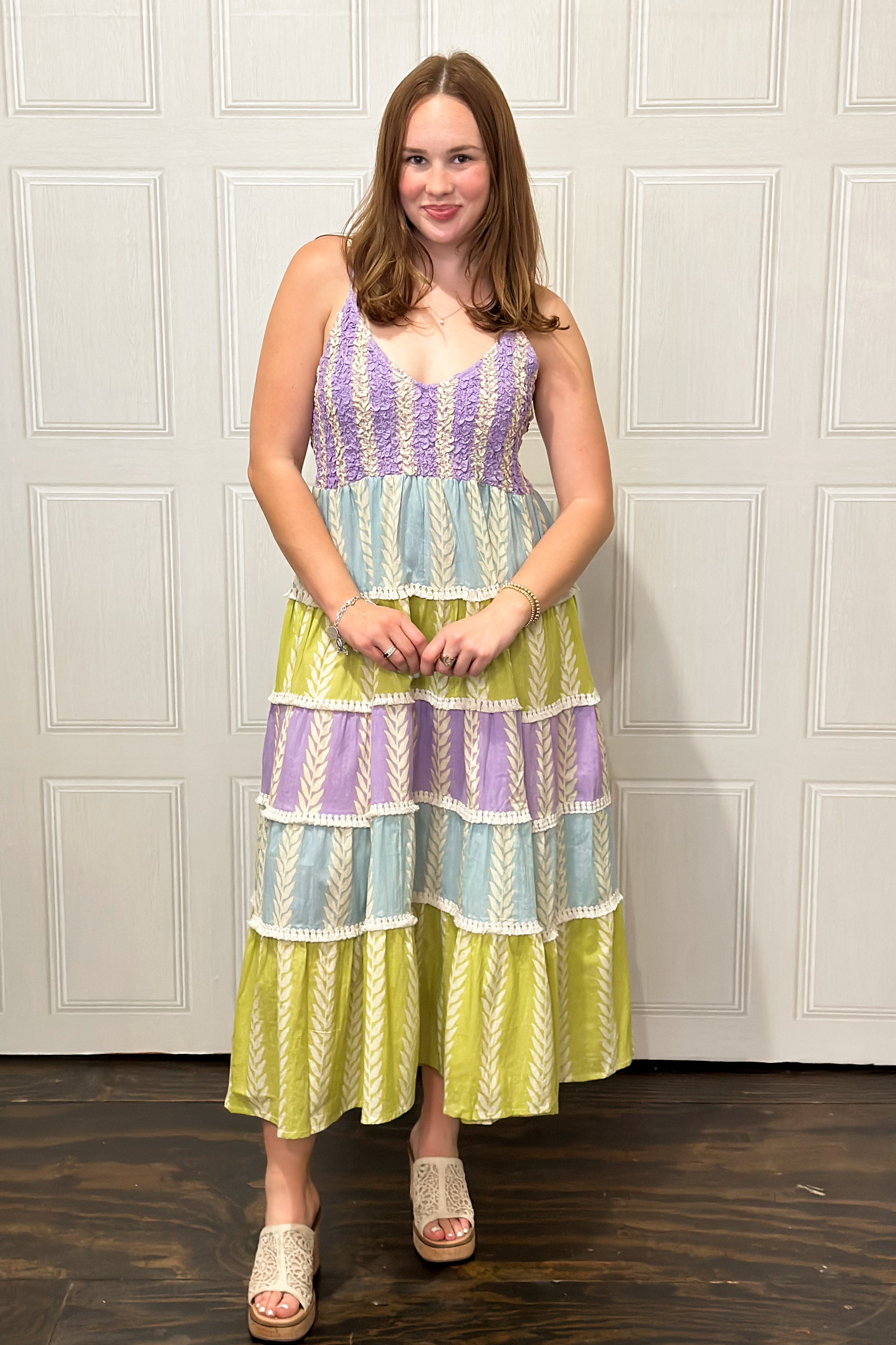 Effortless and full of movement, this V-neck sleeveless dress features a relaxed, roomy fit with tiered layers that flow beautifully. Crafted in a lightweight printed woven, it’s finished with smocking details, soft fringe trim, and delicate shirred ruffle accents for a touch of texture and charm. Easy to dress up or down, this is the kind of throw-on-and-go piece that still feels special—perfect for warm days, vacations, or casual gatherings.