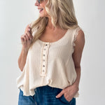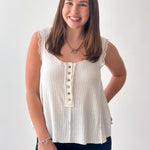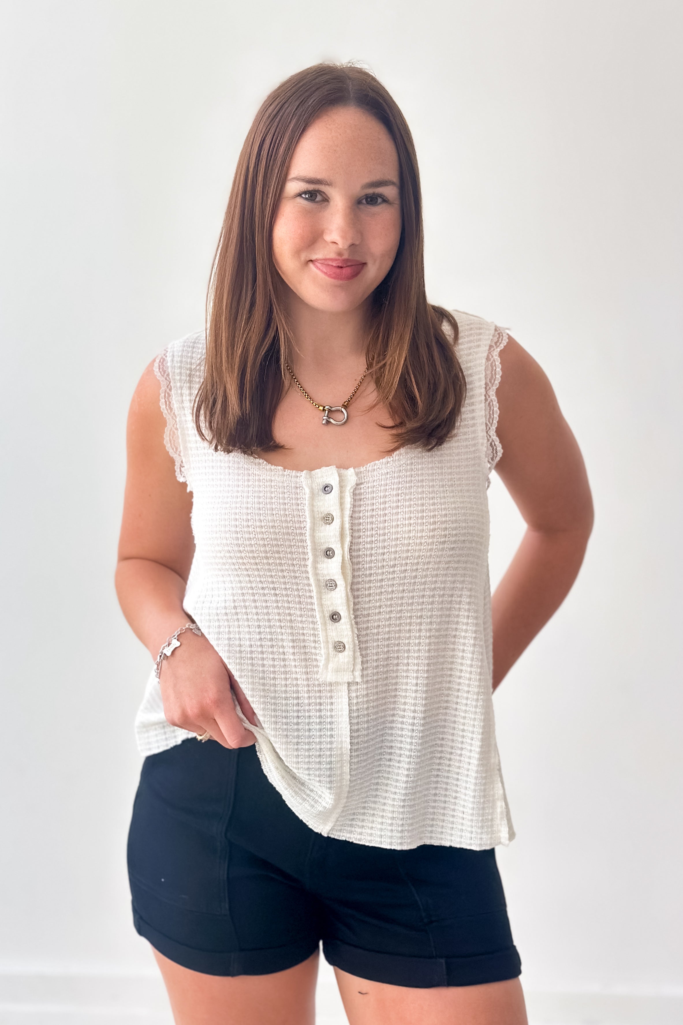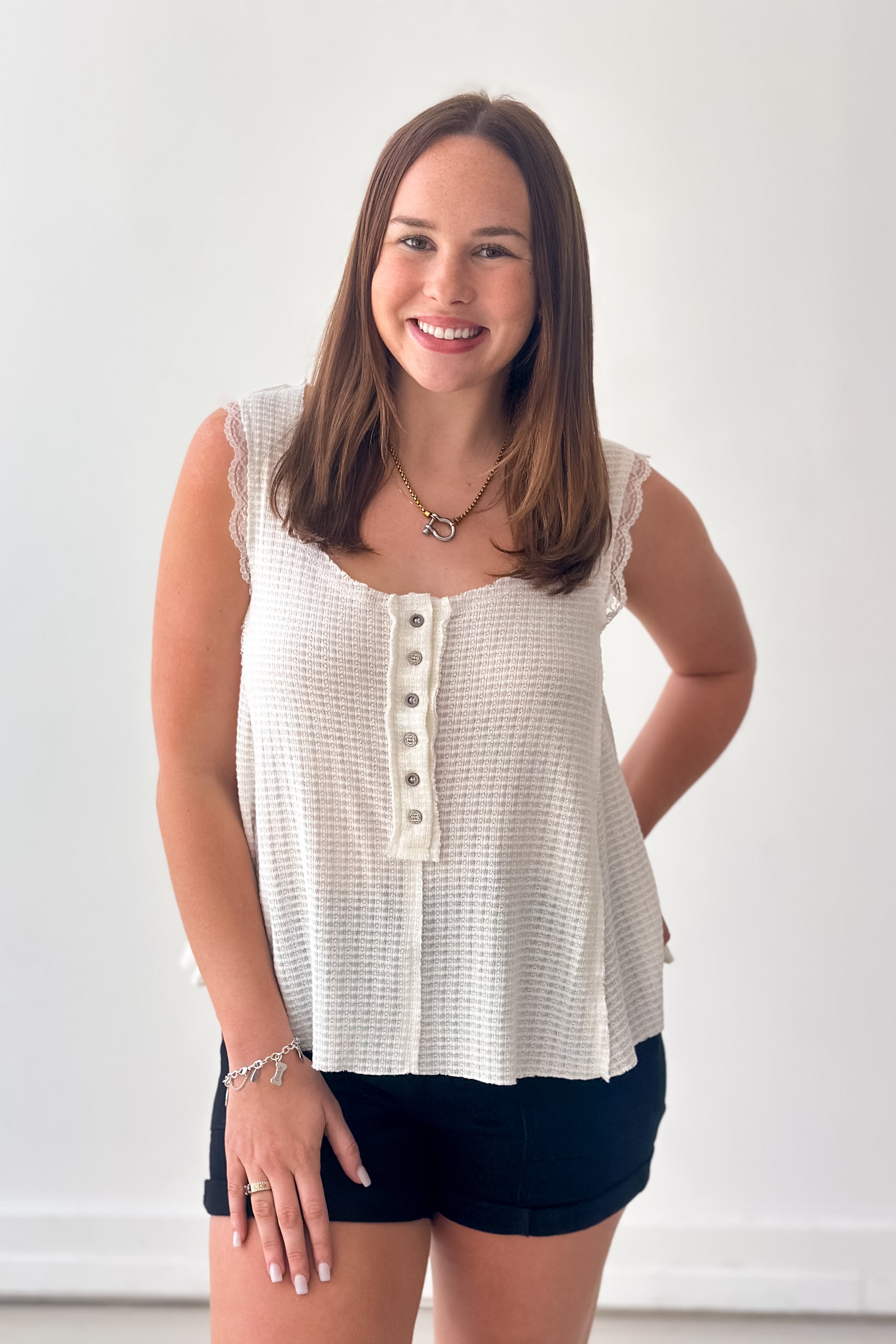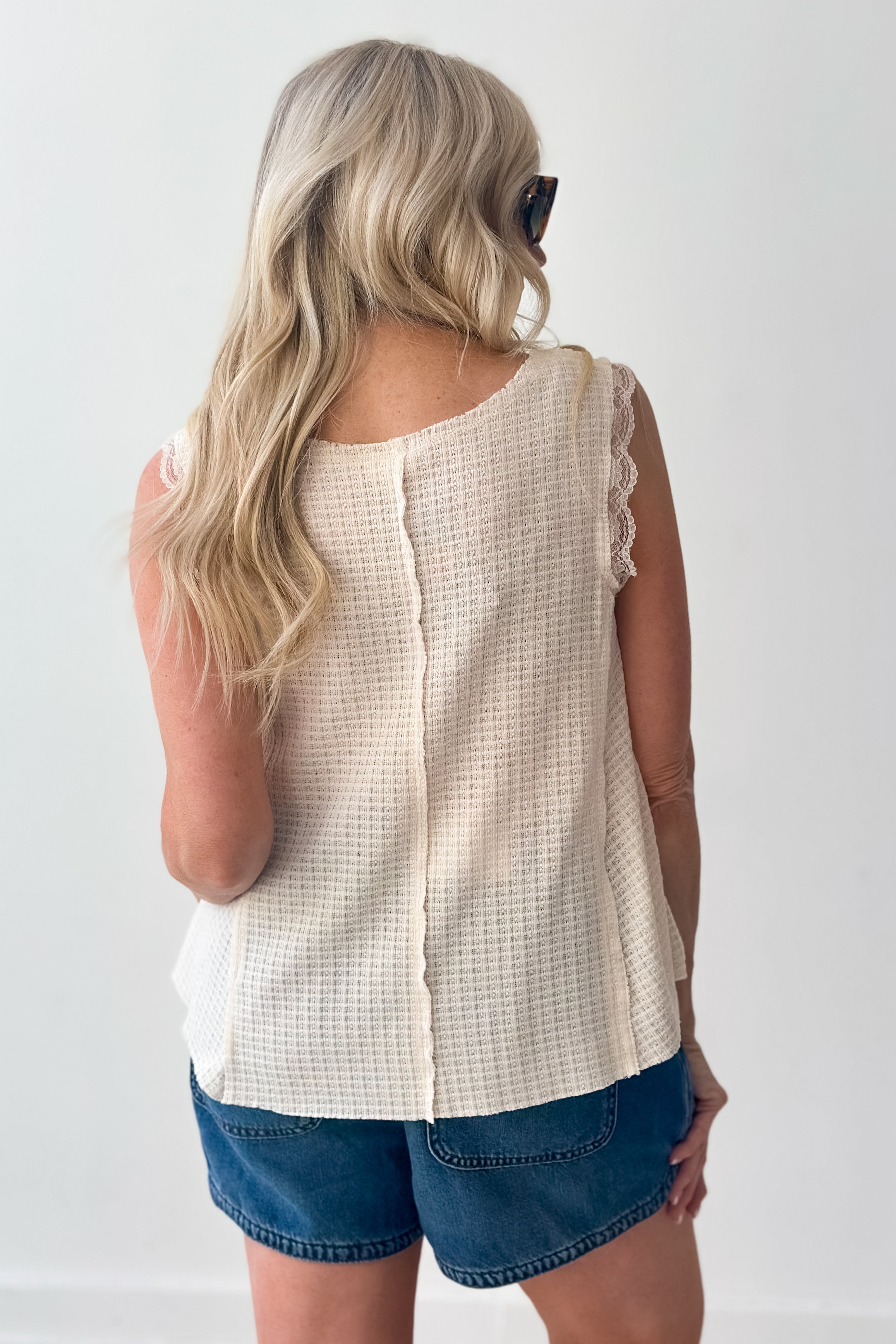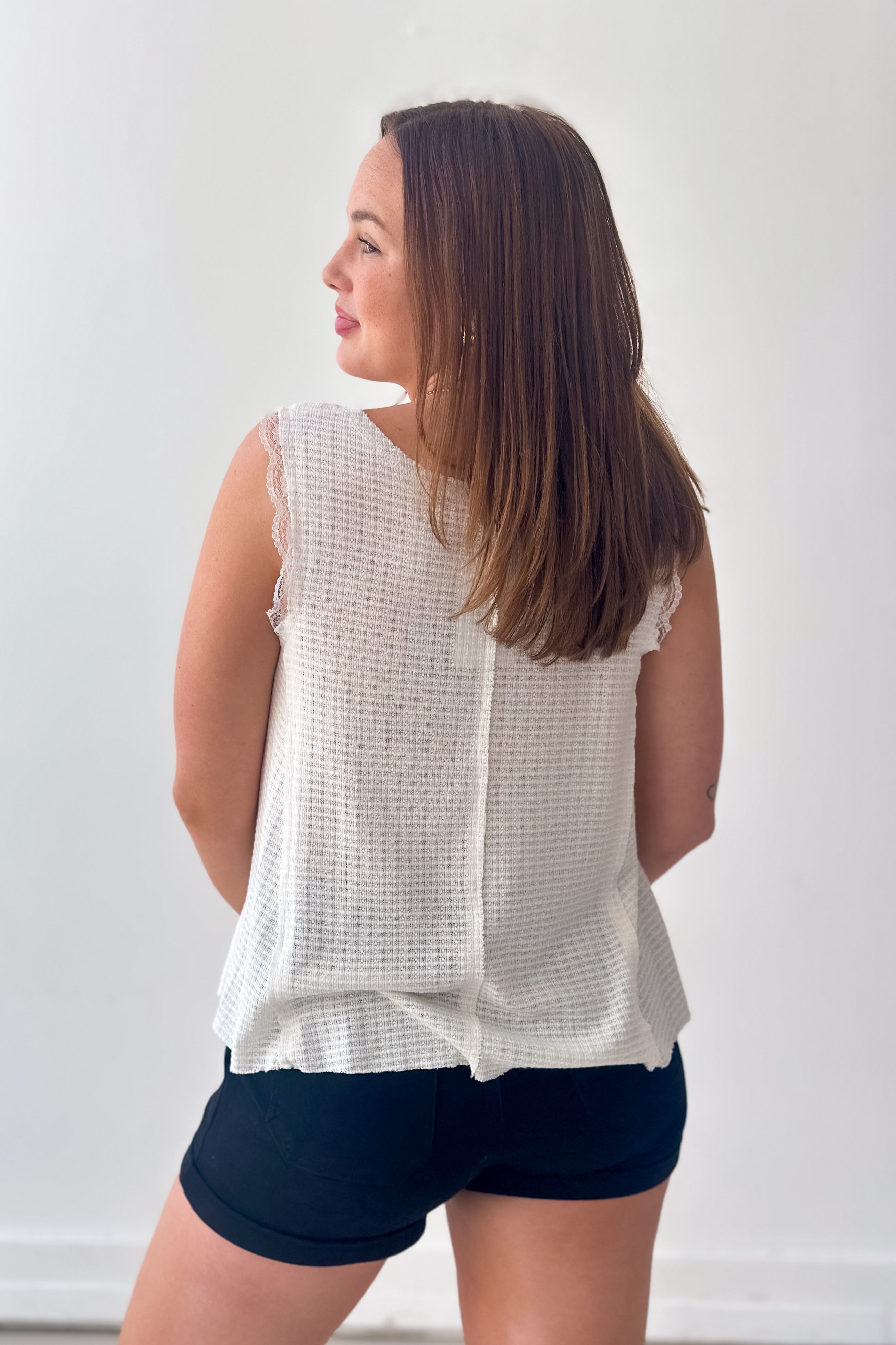 Light, airy, and full on casual, this sleeveless top has a delicate lace trim for a feminine touch. The dreamy soft, waffle knit texture offers a relaxed fit, perfect for the hot summer days. It is a great top for dressing up denim or pairing with relaxed trousers when you want easy.