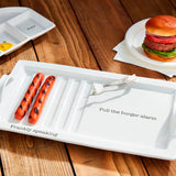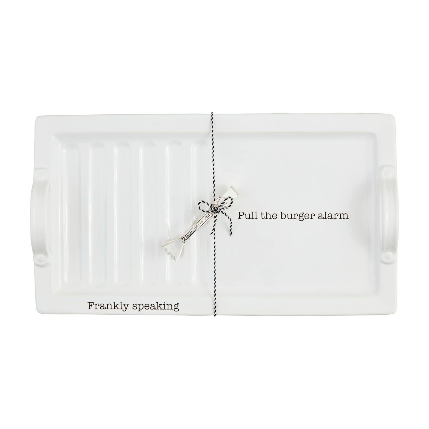 The Burger Hot Dog Platter Set is a versatile 2-piece set designed for serving up your favorite BBQ grill foods. The platter has specialized grooves to display/hold your hot dogs and a flat lay area for burgers. This set includes a stamped silverplate tong.