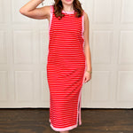 When you combine two of our favorite pops of color in a dress, we have hearts in our eyes. This sleeveless striped dress with contrast ending is such a cute spring piece. With the slits at the hem and the arm inserts (yes, no bra peeking out), the quality and timeless look in this dress is exceptional.