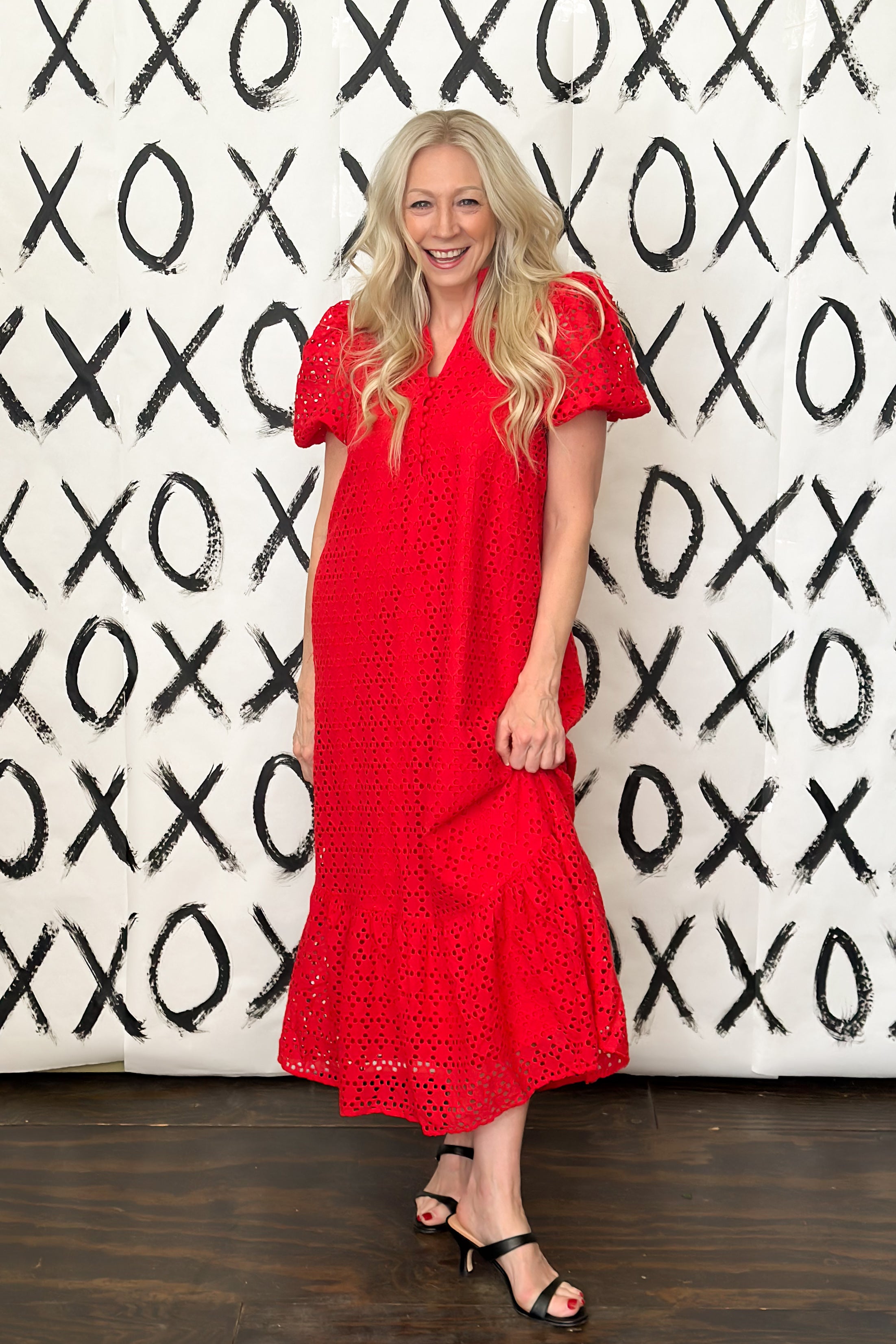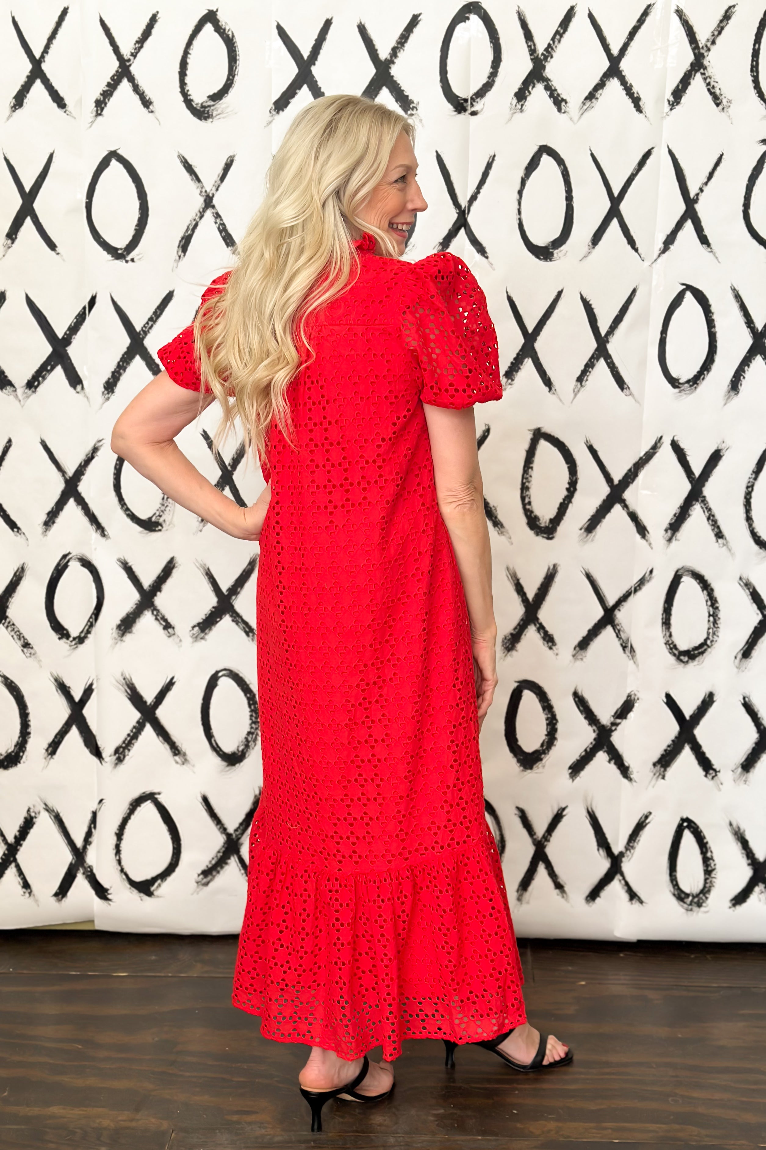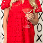 All eyes will be on you in this green eyelet midi dress. This feminine, and beautifully detailed dress is a true spring standout with delicate eyelet fabric, a sweet ruffle collar, soft puff sleeves. The flattering V-neck with button accents bring elegance with an old world feel. This is the perfect dress for spring events, sunny days, and every moment you want to feel effortlessly stunning.