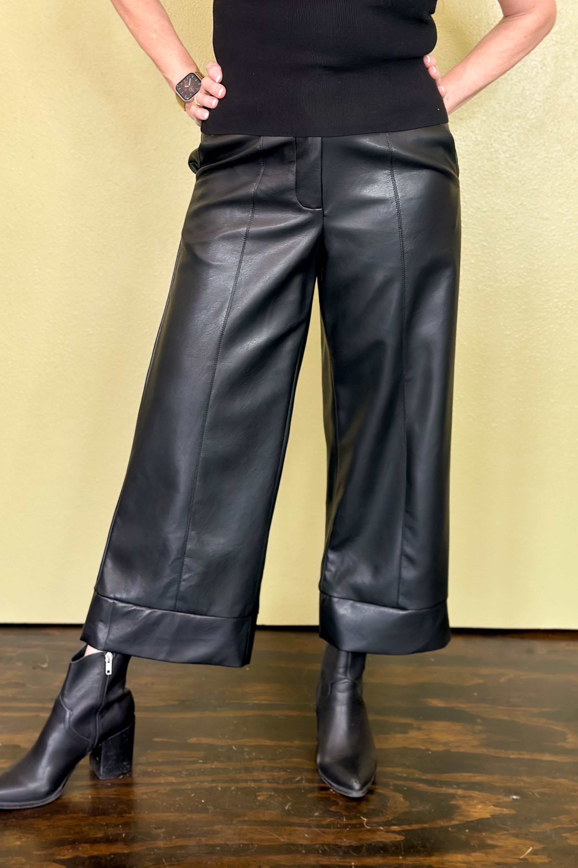 Make a statement in our stylish wide leg pants crafted from soft pleather with a sleek, modern silhouette. These pants feature a flattering high rise and fluid wide leg for an effortlessly chic look that pairs perfectly with fitted knits, blazers, or bold blouses. A must-have for nights out or elevated everyday style. The perfect holiday pant for all your parties!