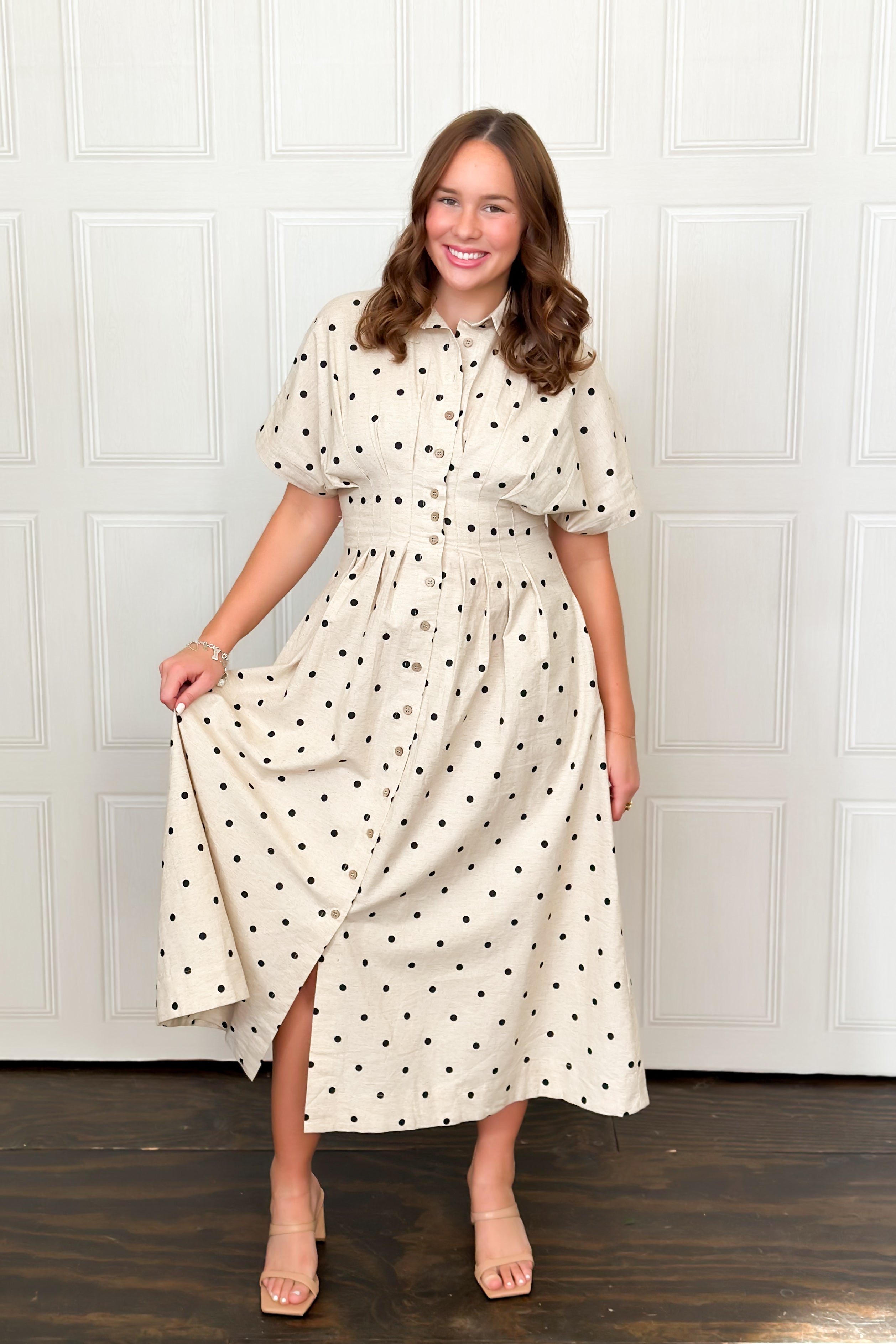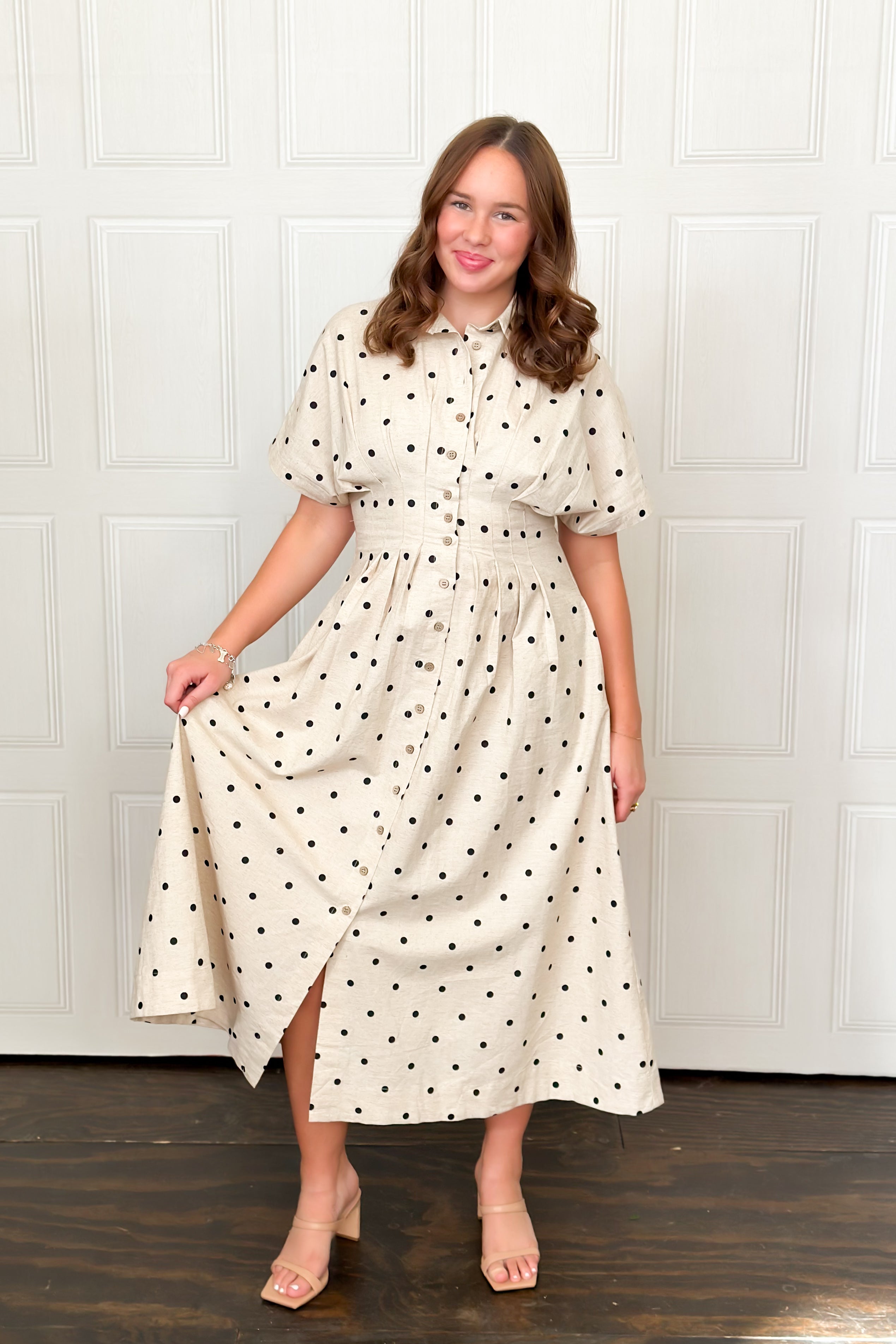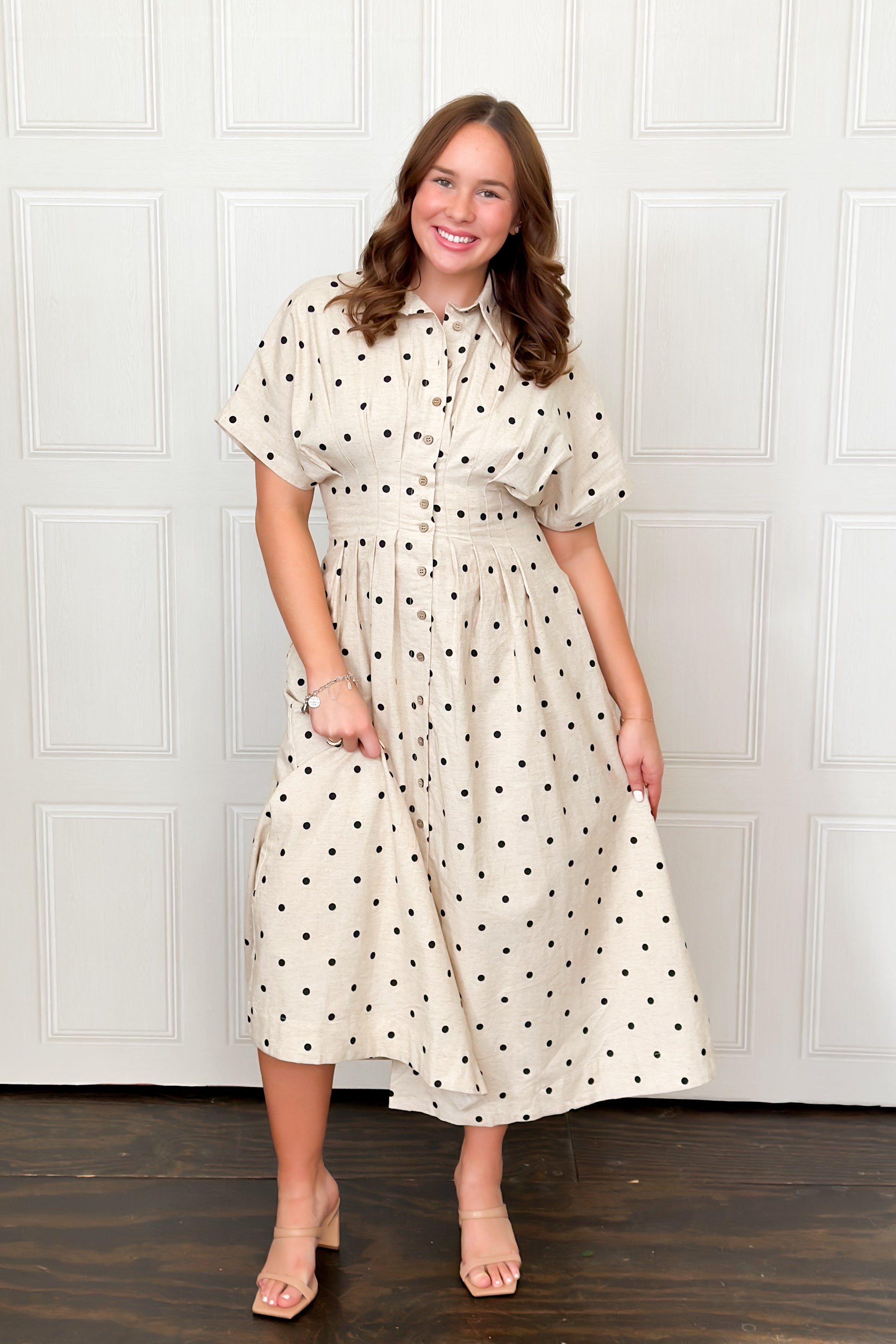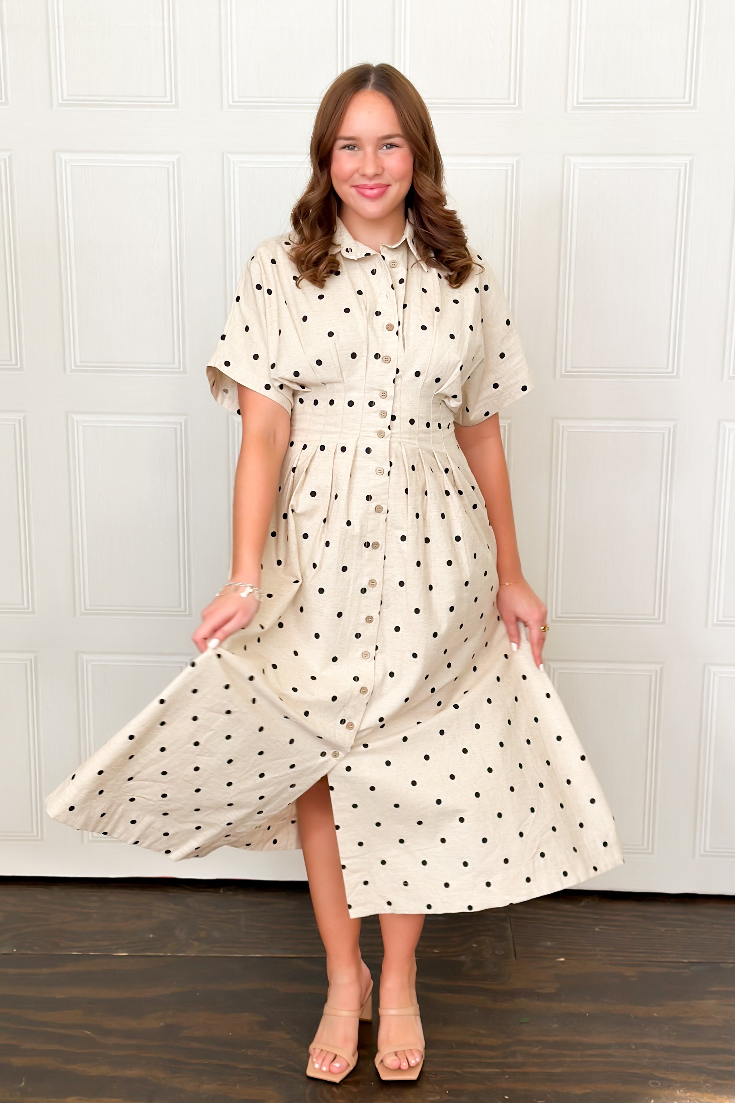 Get spotted in this super cute midi dress that will stand the test of time in fashion. This short sleeve dress has a flattering button-front design enhanced by a cinched waist tapering to a flowing skirt for all-day comfort. Perfect for brunch dates, casual outings, or warm-weather events.