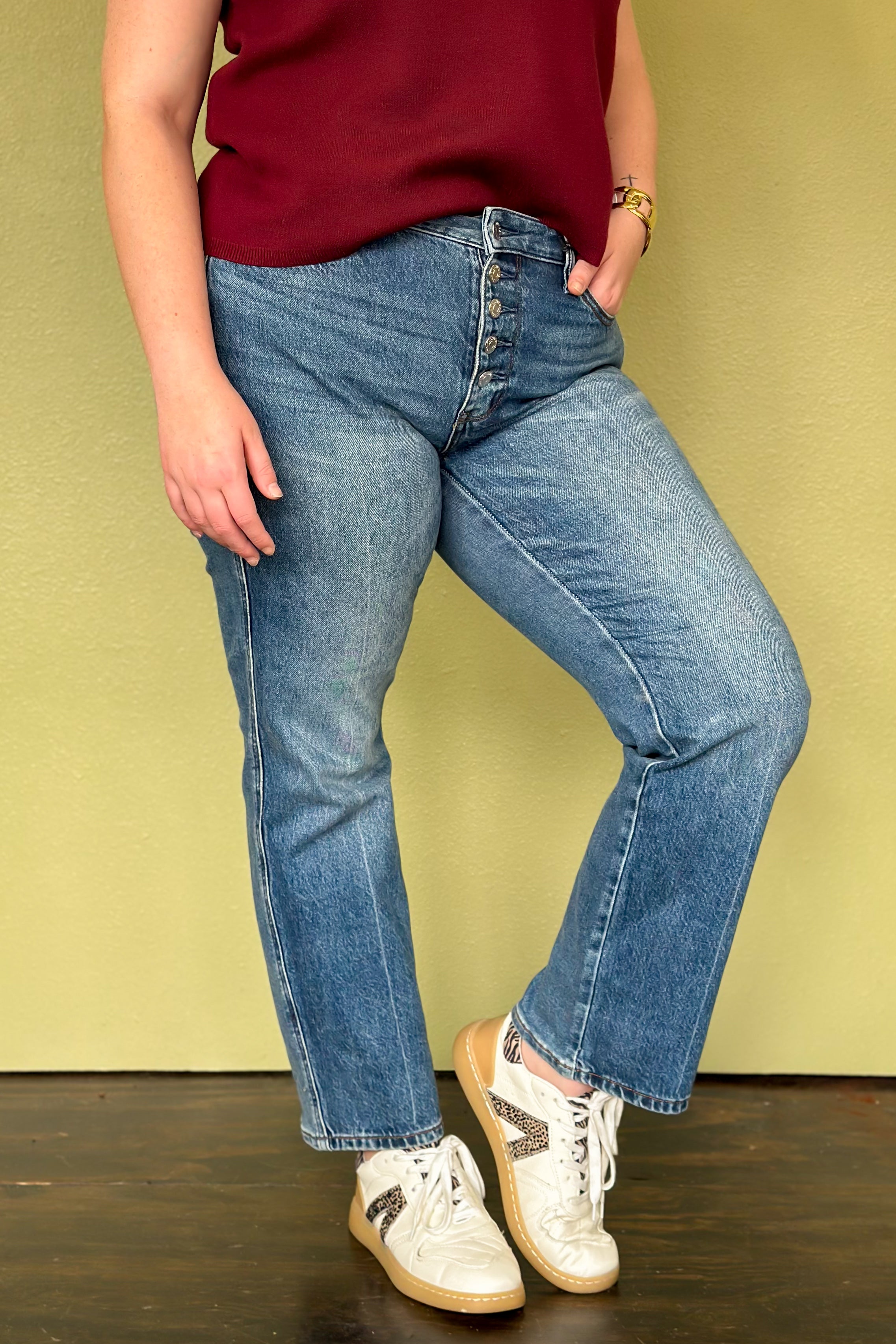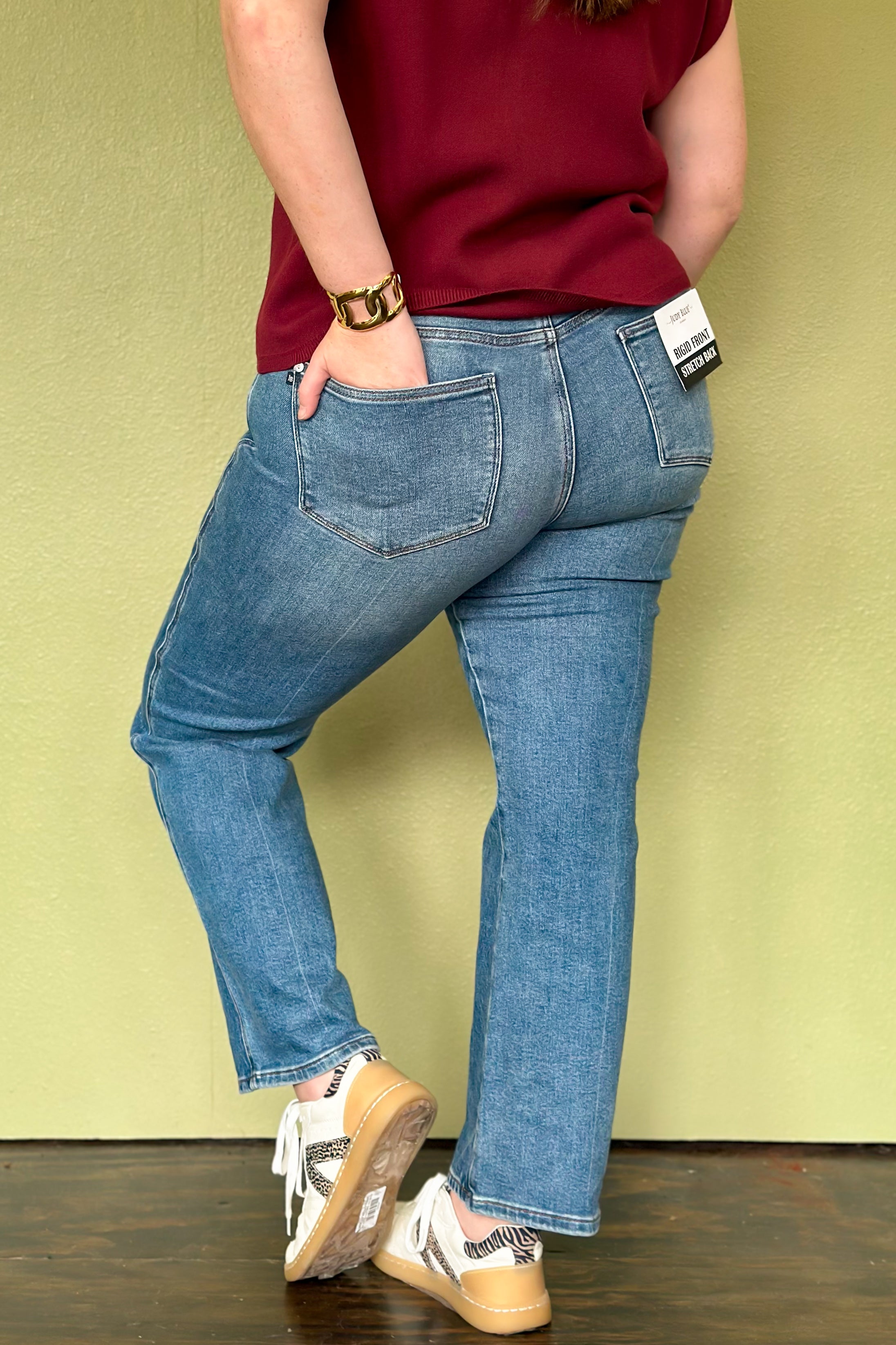 These straight leg rigid magic jeans will bring out the confident woman in you! This button fly high-rise and straight-leg silhouette in a clean, medium denim wash—no distressing, just timeless polish. It goes without saying, magic in the rigid front denim and signature stretch back will hug curves and move all day without losing shape. Expect a flattering fit that’s both structured and soft—perfect with tees, blouses, or tucked sweaters for effortless style.