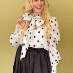 Our two favorite trends in one - Bows & Dots! Level up with this feminine and timeless polka dot blouse with a delicate bow tie. The long sleeves finish this classic look with smocked cuffs, giving a soft, gathered touch that balances the flowy silhouette. Perfect for dressing up denim or pairing with tailored bottoms for a polished look. The built in cami makes this top a effortless from start to finish