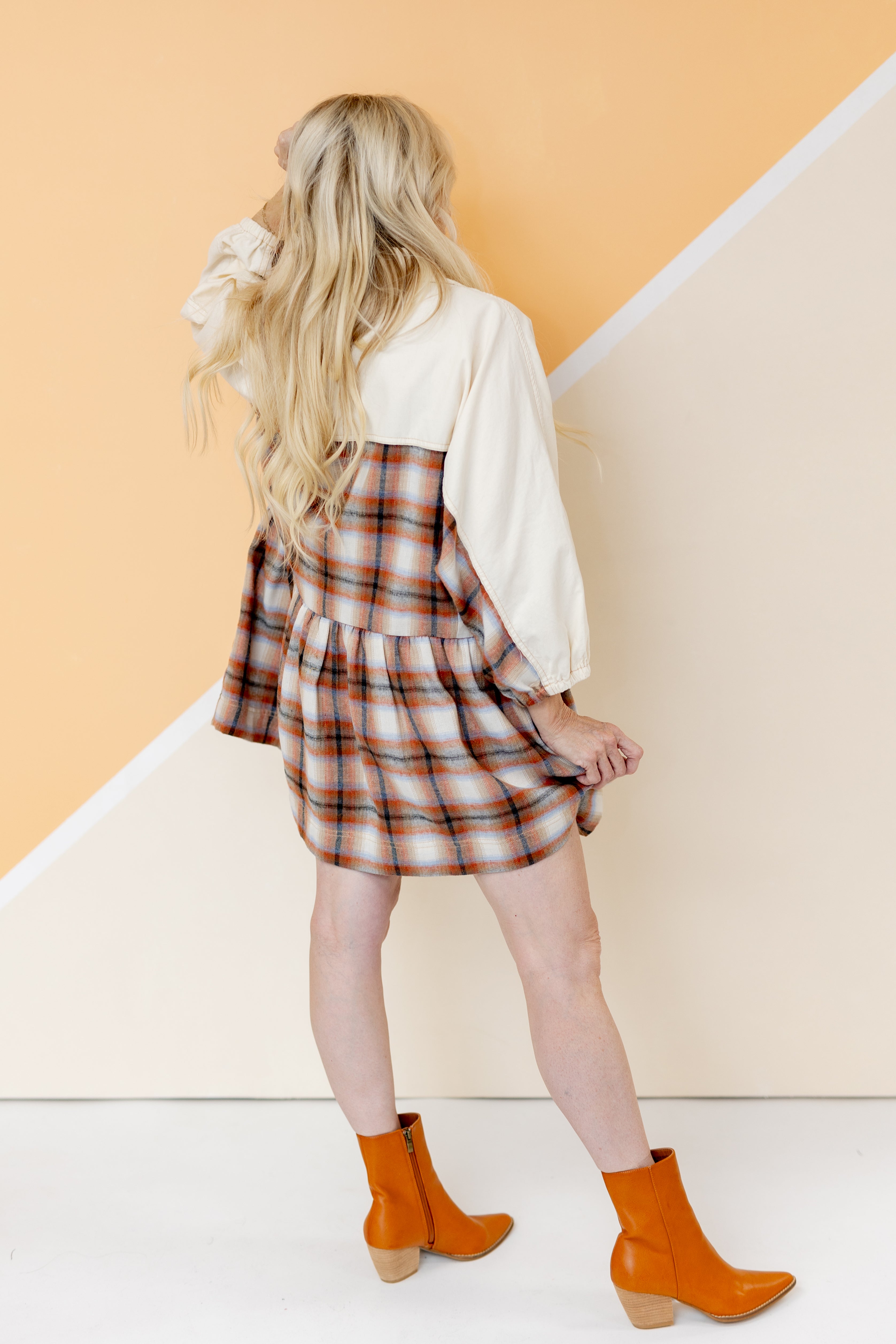 How do you combine your favorite plaid shacket with our beloved babydoll dress? Well, this is how we do it! This plaid button down babydoll dress with a solid contrast is so great for the fall. You can wear it as a dress with your favorite boots, or open it up and wear it as a short duster.
