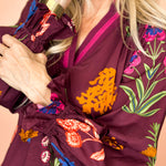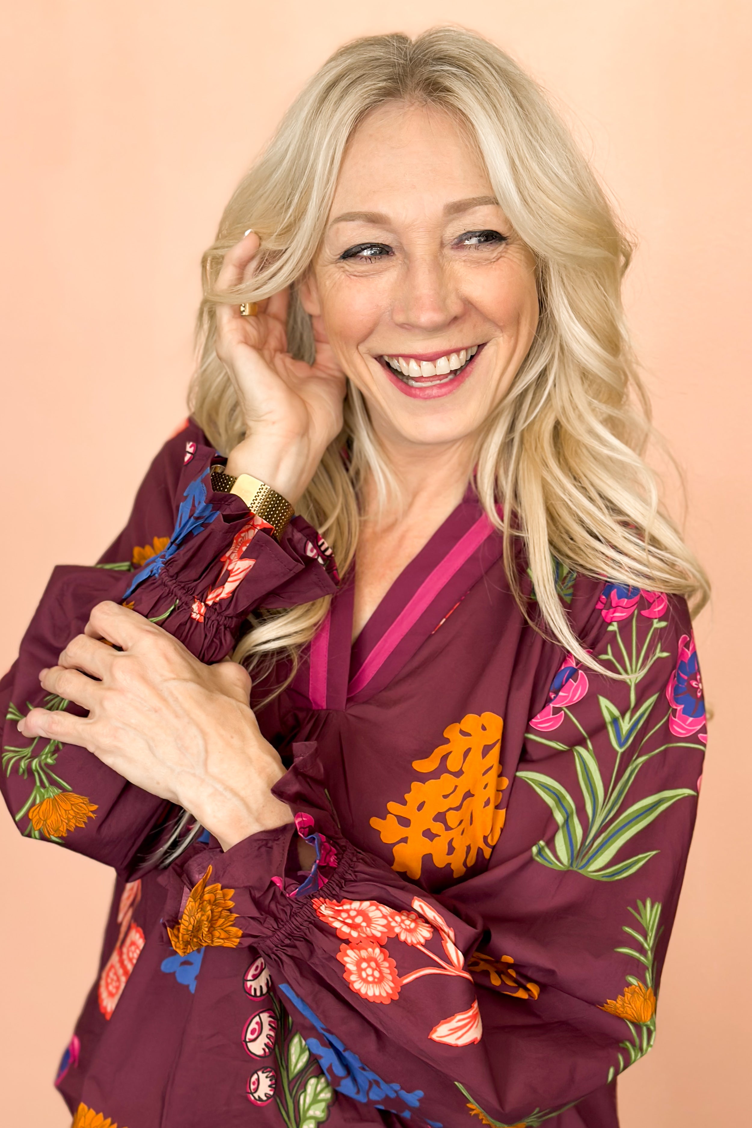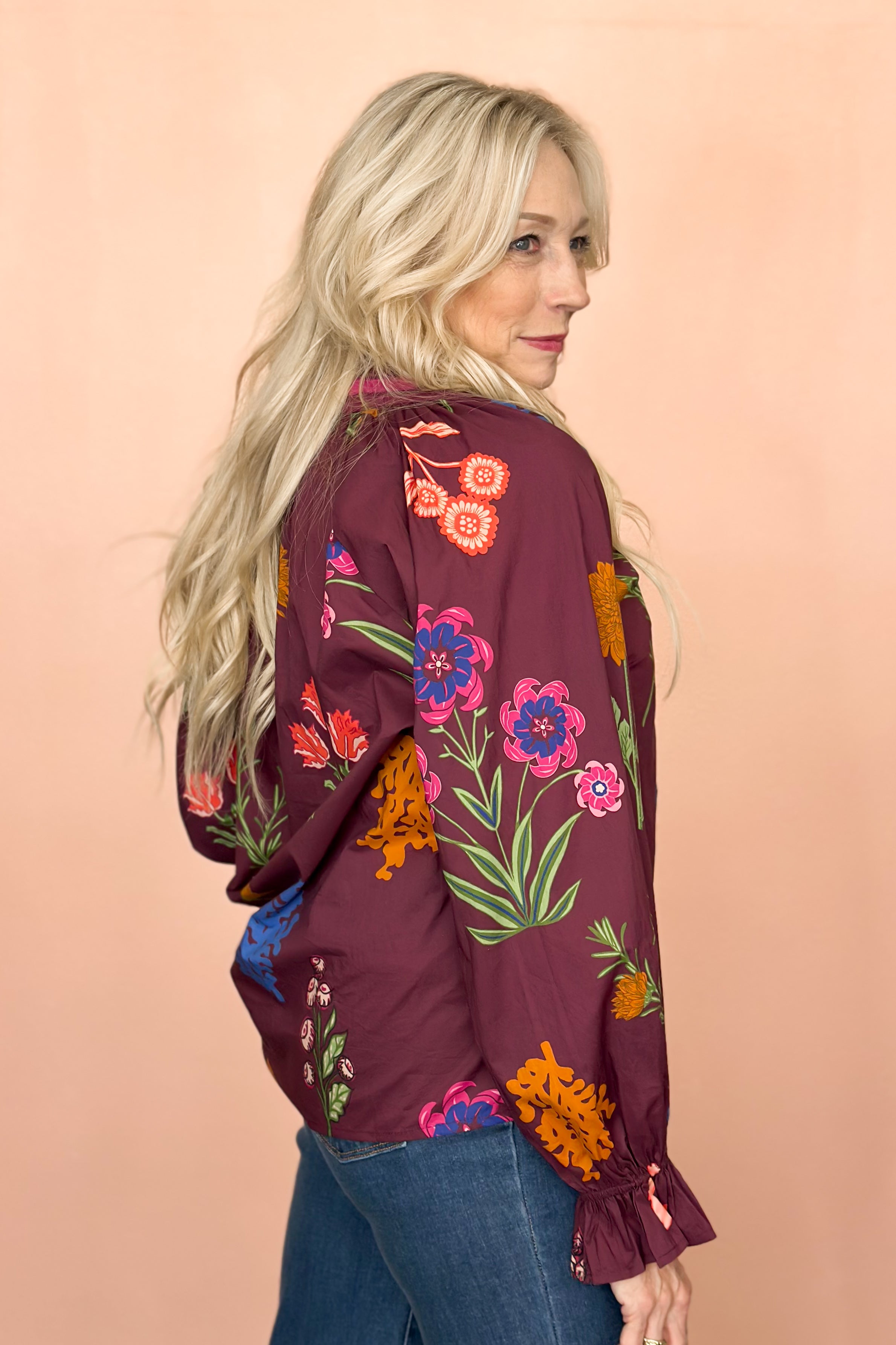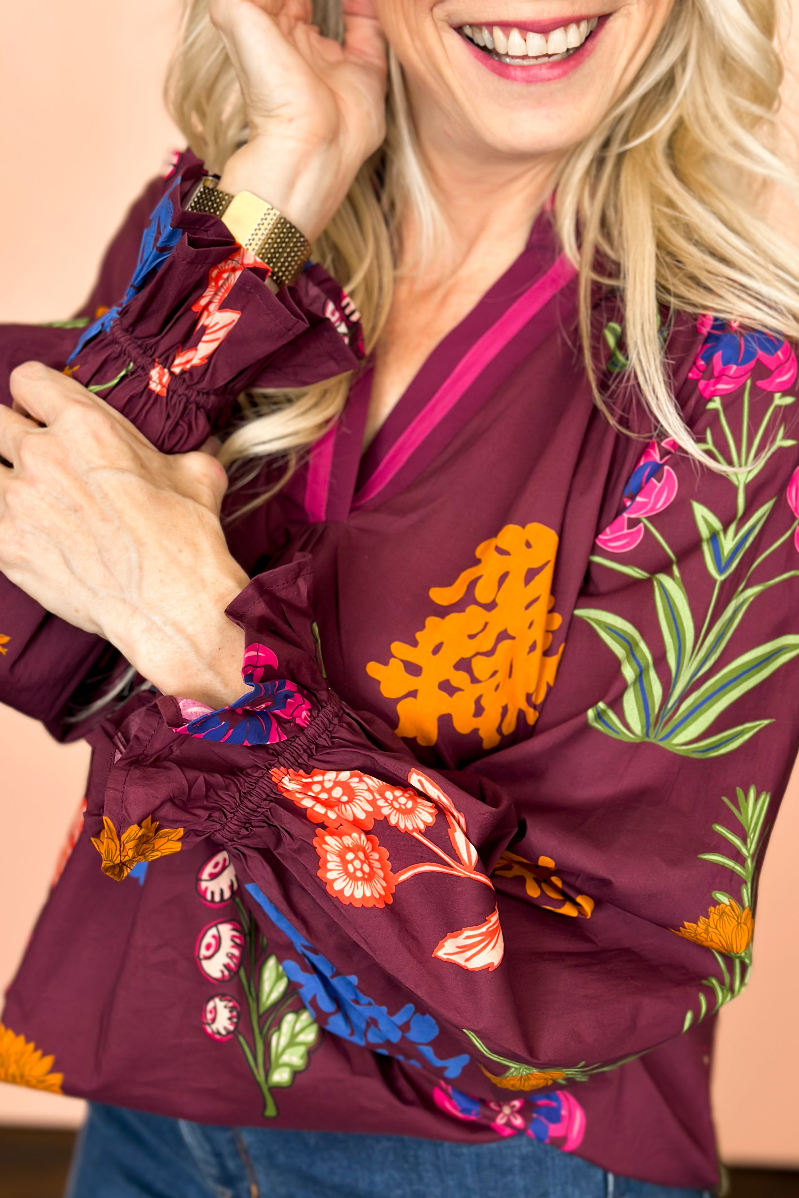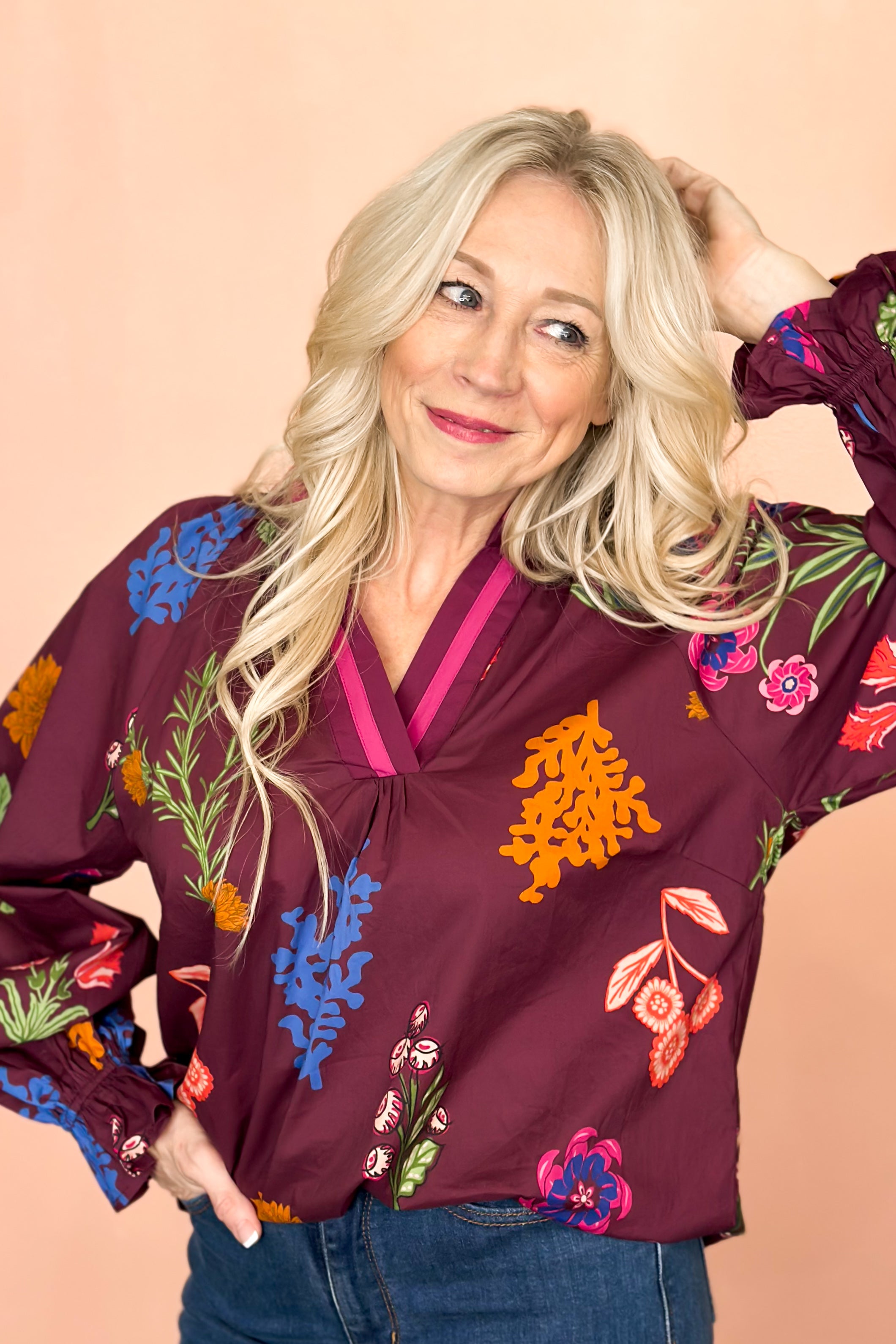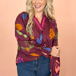 The rich in color and style floral blouse brings an effortless blend of femininity and polish to your wardrobe. Designed in a deep burgundy hue, this floral print blouse features an open V-neck collar with contrast binding that adds a modern edge. Lightweight and unlined, it drapes beautifully for a flattering fit that works from day to night. Pair it with tailored trousers for the office or denim for a chic weekend look.