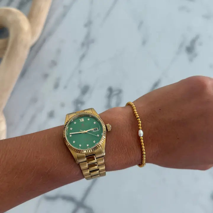 Simple, elegant, and effortlessly chic — this Gold Beaded Bracelet features a strand of polished gold beads accented with a single dainty pearl, perfect for everyday wear or stacking with your favorite pieces.