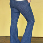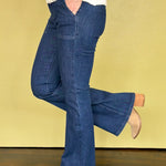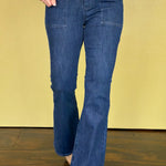 Step into the your era with this high waster flare jean with our favorite deep patch pockets. These jeans are a contemporary take with the classic flare, perfect for your go go go days and evening parties alike. The dark wash and unique pockets make these jeans stand out. Designed for the modern gal, these jeans provide the perfect blend of comfort and style.