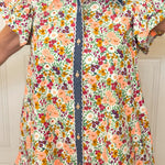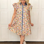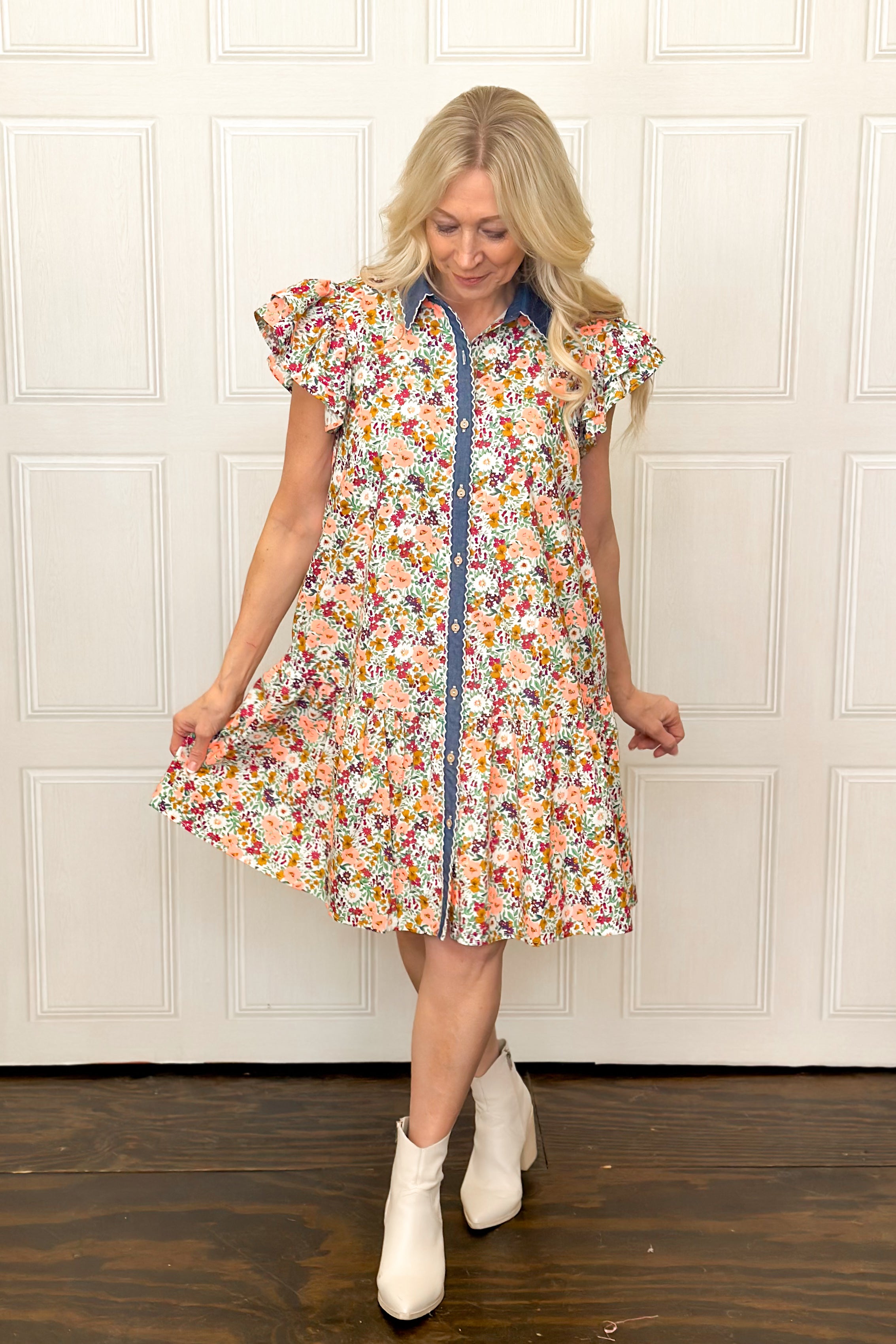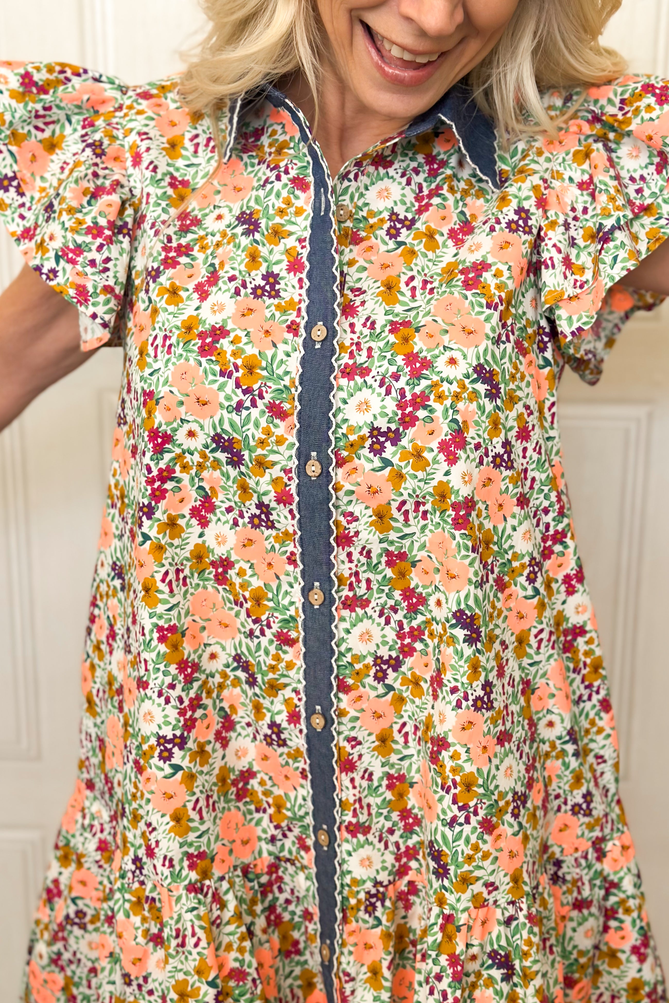 Let's take a bright floral print and add a touch of denim, she said. Bright, breezy, and so fun, this floral and denim dress brings playful charm with a button-down style, ruffled cap sleeves, and a relaxed, easy fit make it comfortable yet flattering. The tiered skirt adds charm, dimension and function.