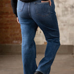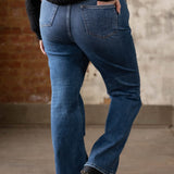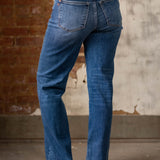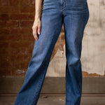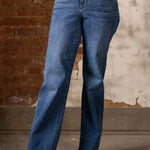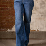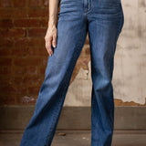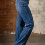 Dip into these super fun V front mid rise jeans 90's jeans with a waistband that is so figure flattering fit and look. The medium wash clean jean highlights the crease wash front and back.
