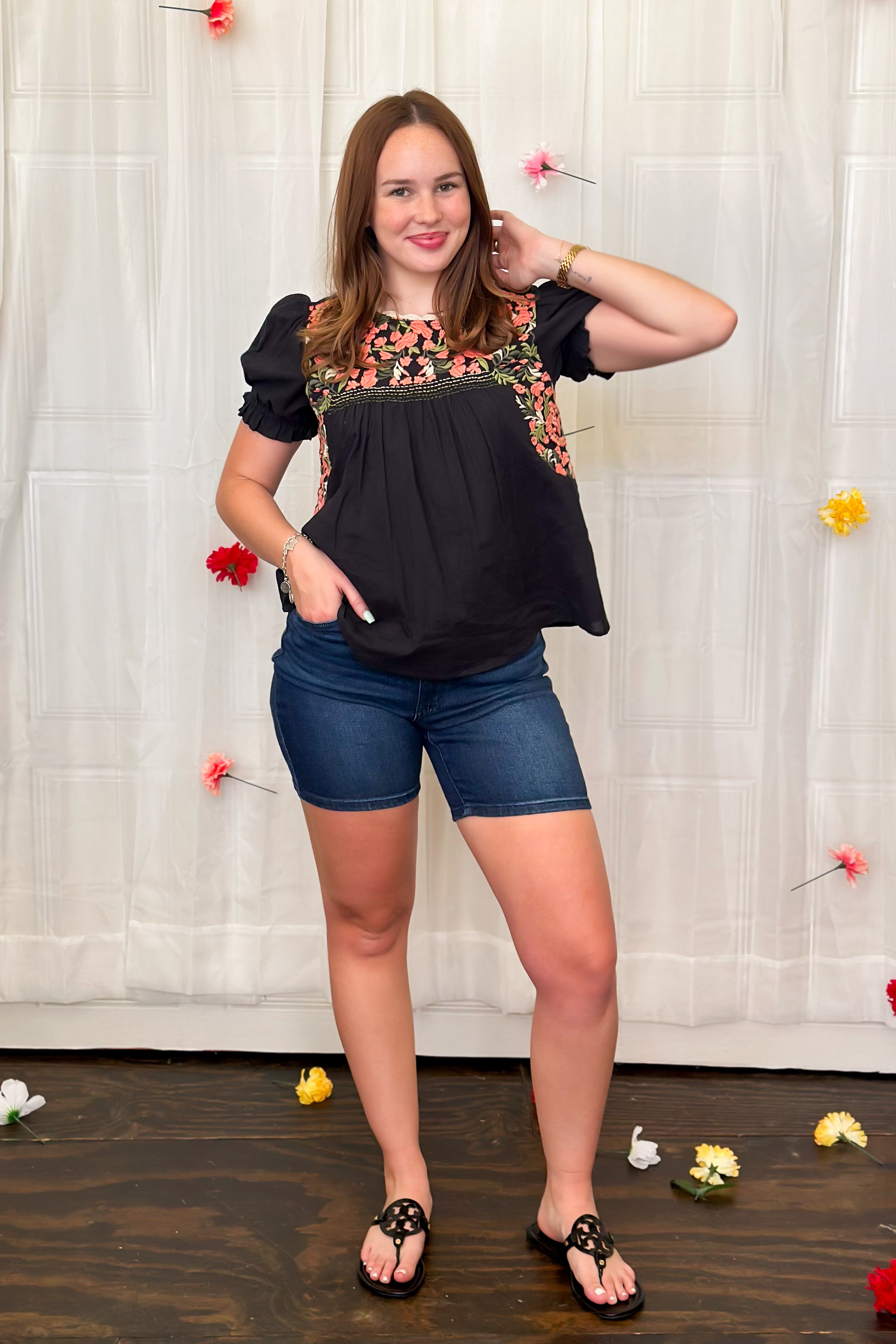 Our dip front jeans were a hit, so we know our bermuda shorts will make you smile. Dip into these super fun V front waistband high rise bermuda shorts that give your legs a long, flattering look and fit like a glove. The dark wash clean short make them a great dress up short as well.