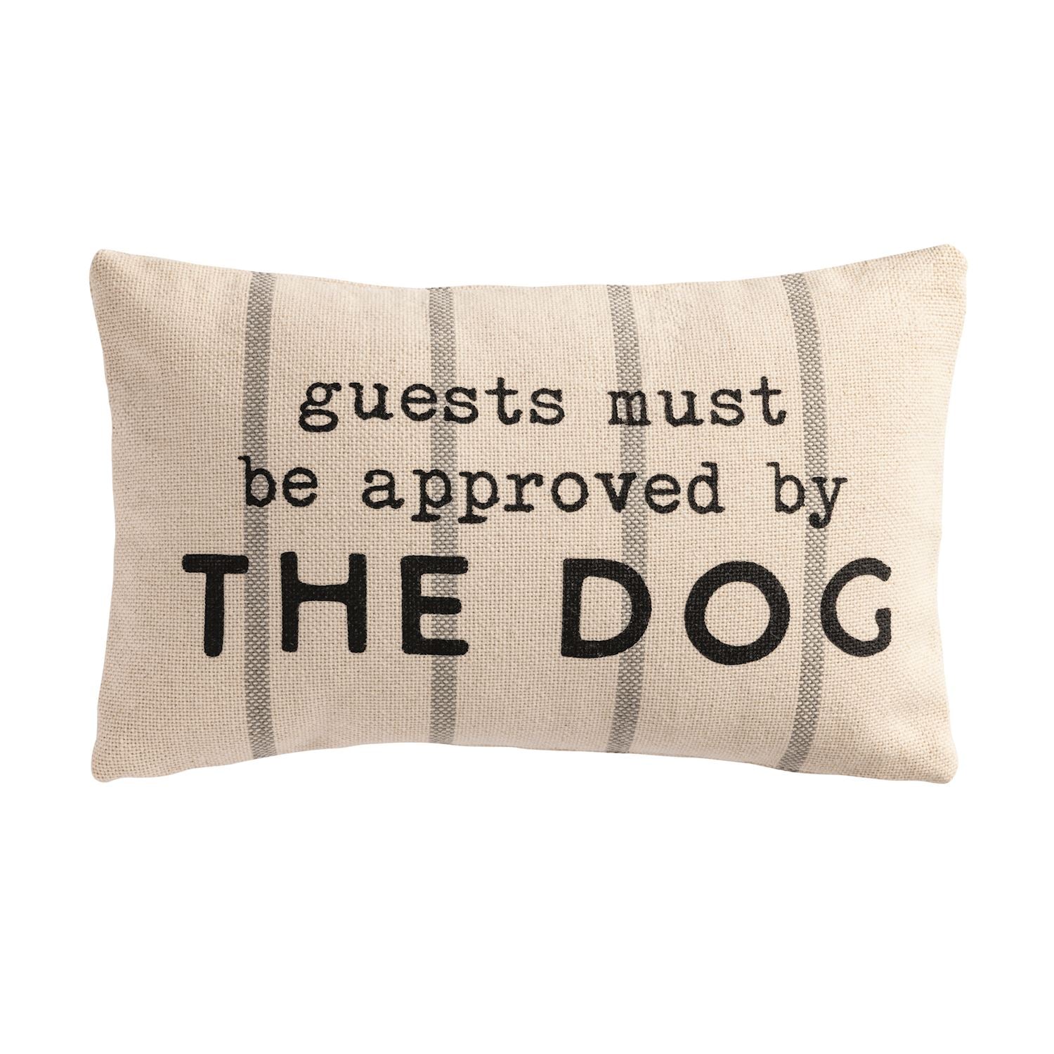 The dog approves all guests- let's make no mistake about it. The Dog Striped Pillow is a woven cotton lumbar pillow that seamlessly combines style and comfort. With a sophisticated striped design, it adds a touch of elegance to any space. Easy to care for, this pillow can be machine washed cold with like colors separately, avoiding bleach