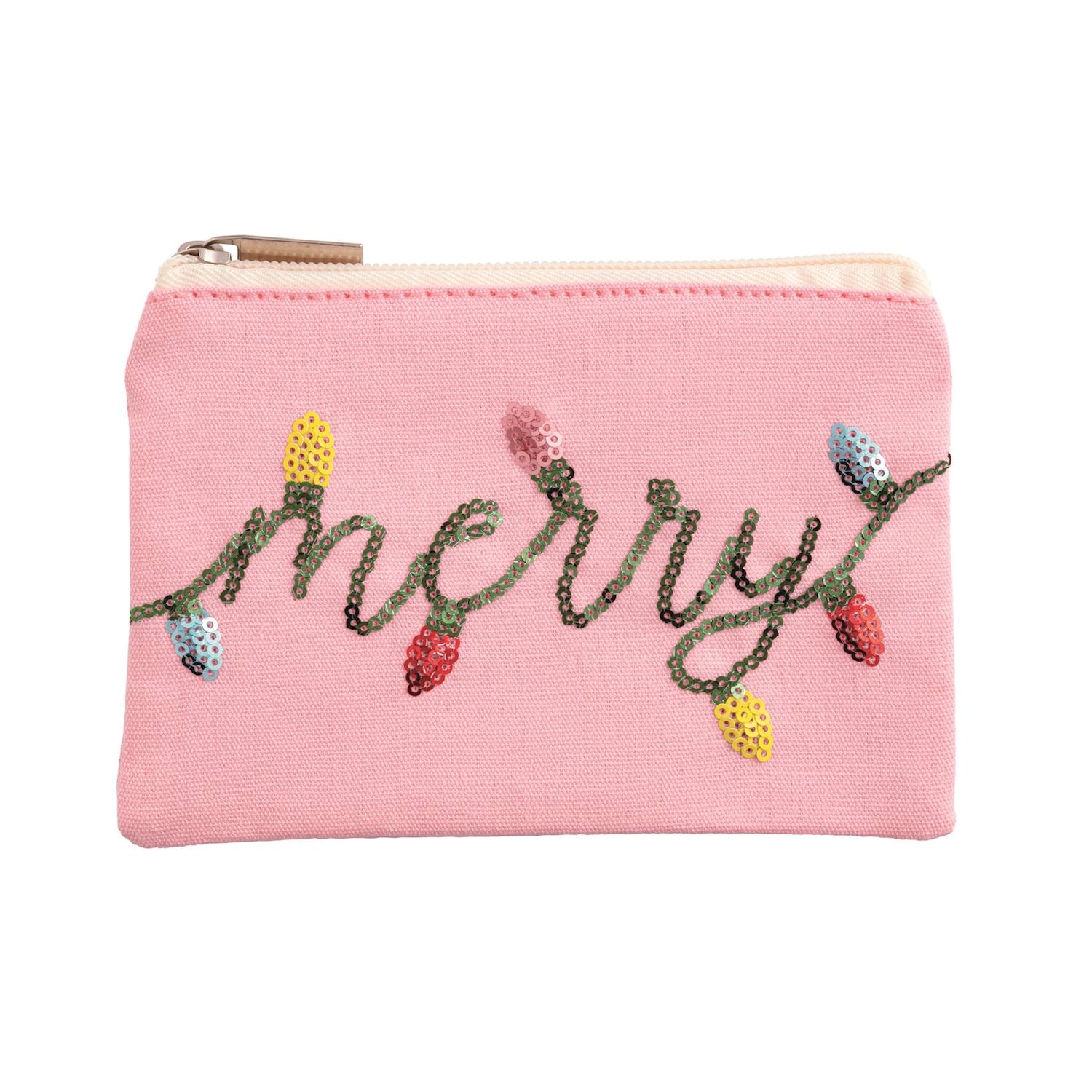 Crafted from durable canvas with a faux leather zipper pull, this sequin gift pouch showcases a delightful Christmas pattern. Embrace the spirit of giving with this festive and practical accessory, perfect for the holiday season.