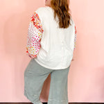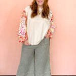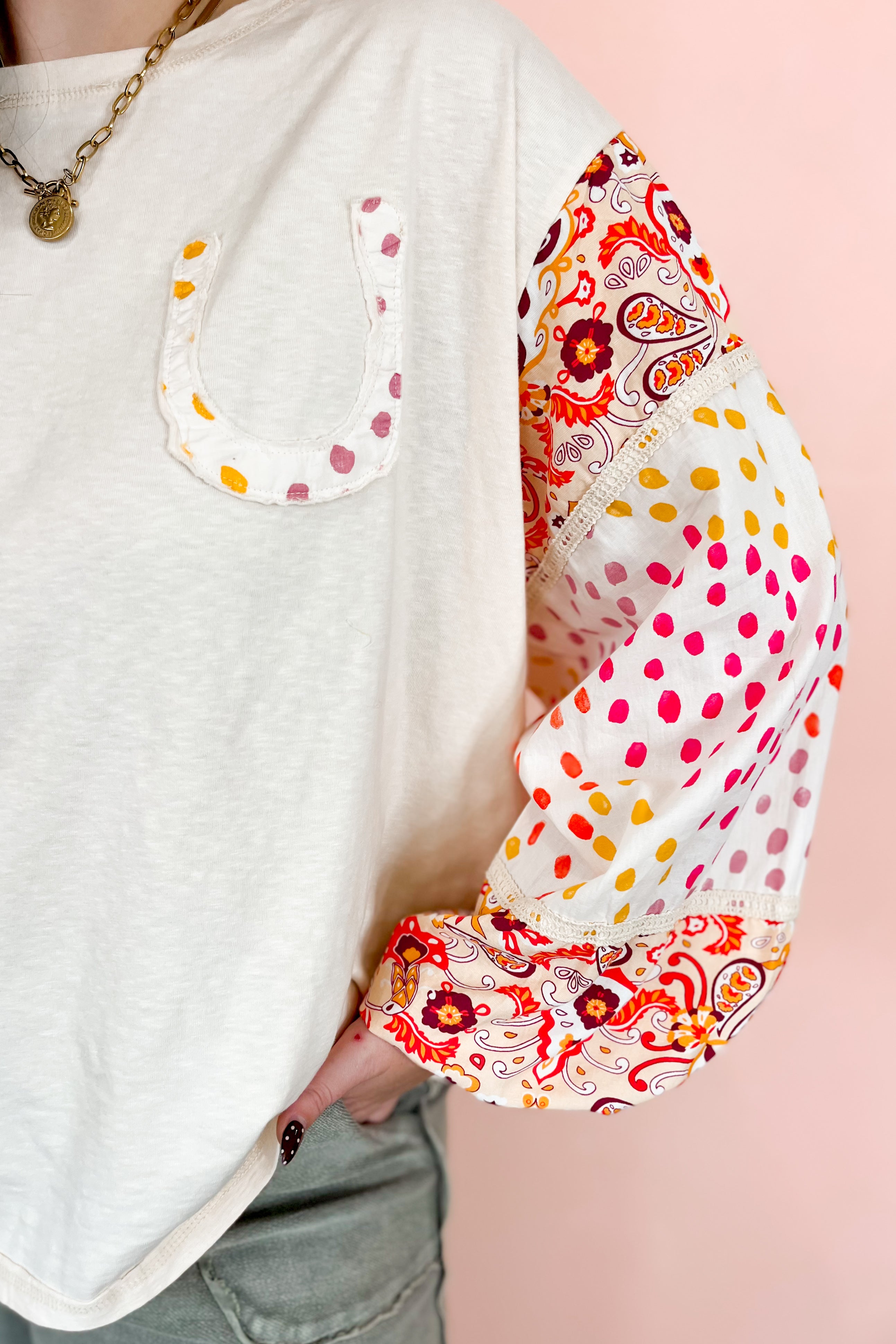A touch of whimsy meets everyday ease in this cotton jersey top is a statement piece for every season. Designed with long bubble sleeves cinched at the cuffs, it features a boxy silhouette, mixed print patchwork, and delicate crochet strip detailing along the sleeves. Relaxed and easy to wear, it brings a touch of boho charm to your everyday style.