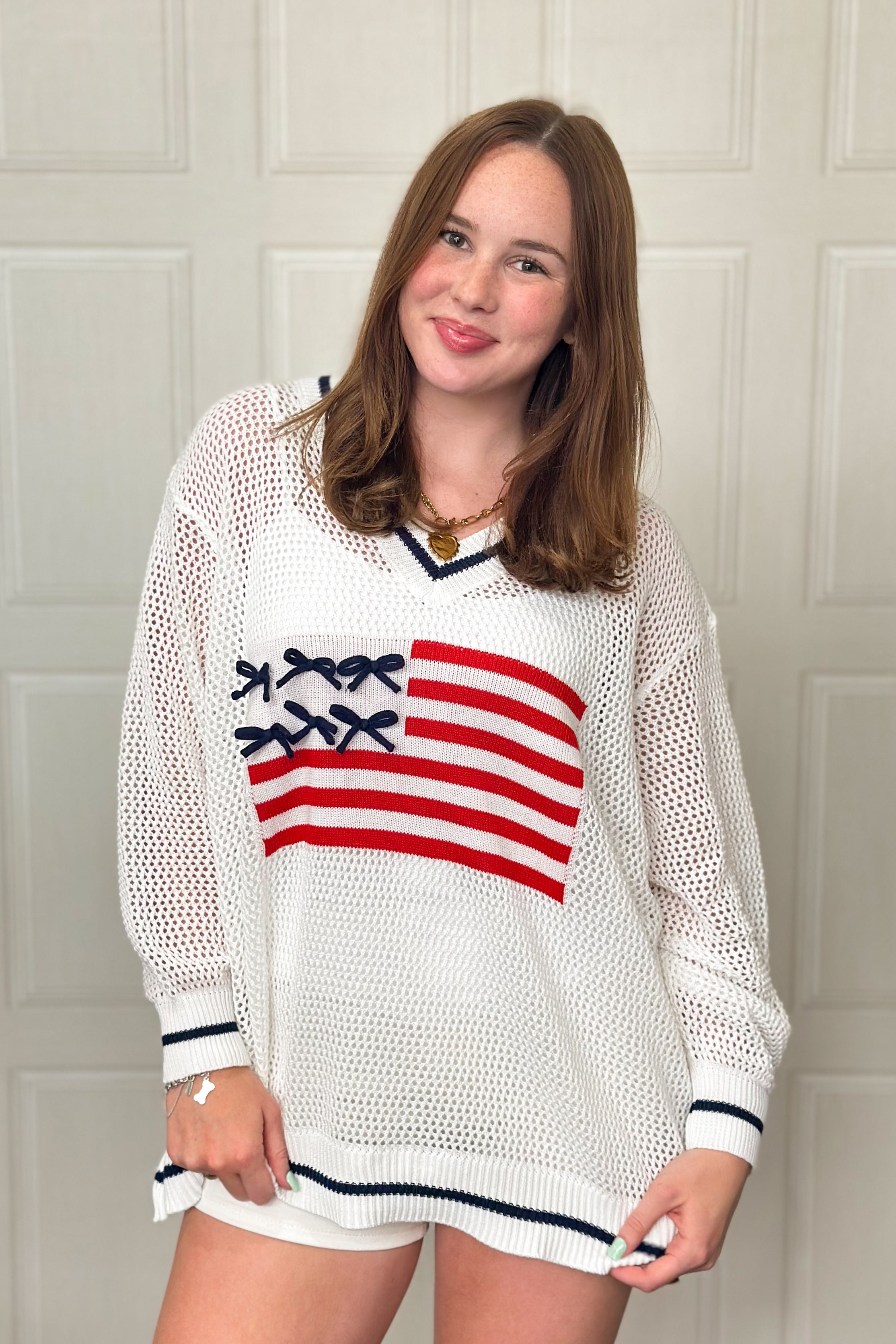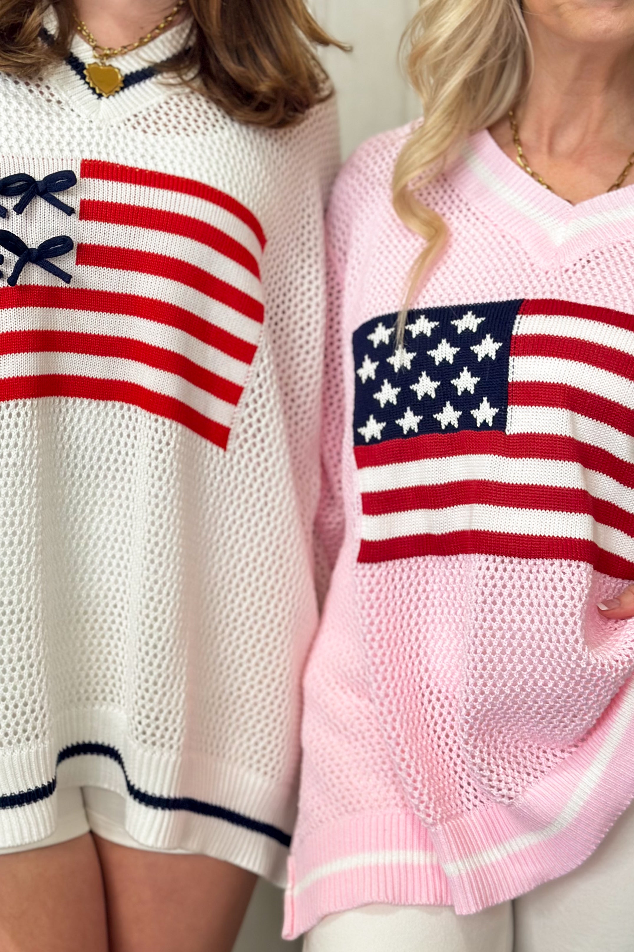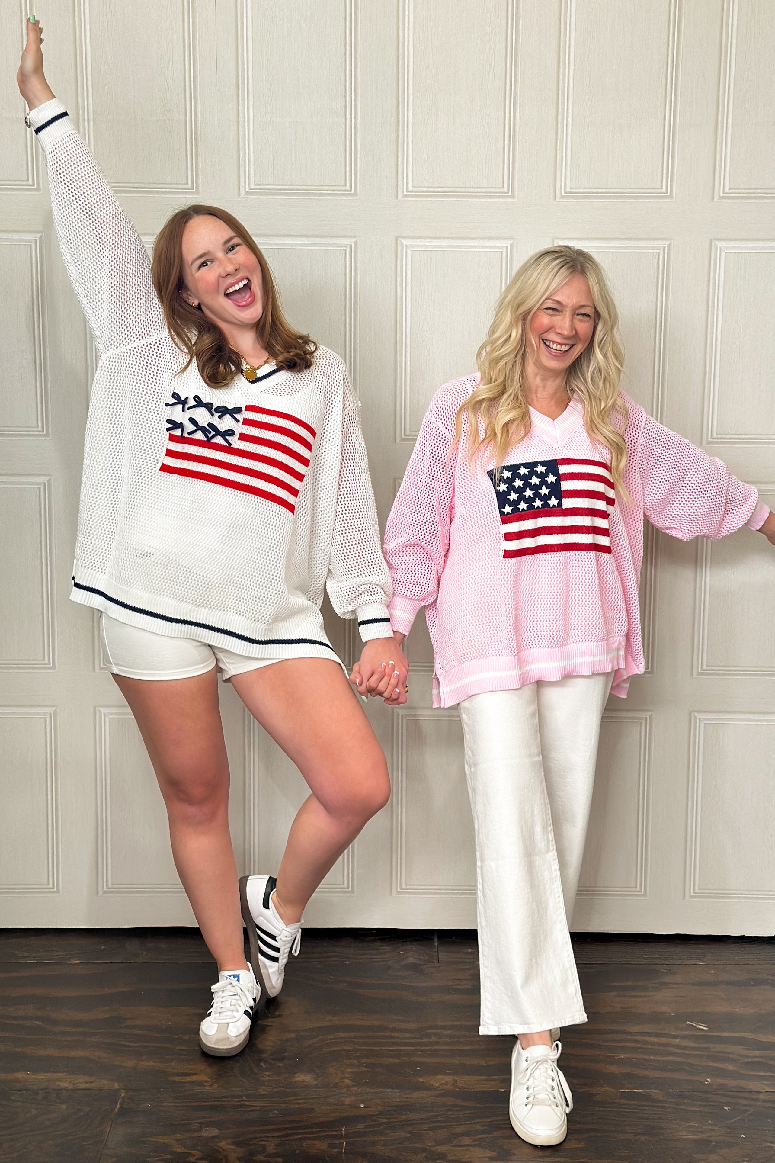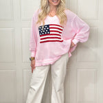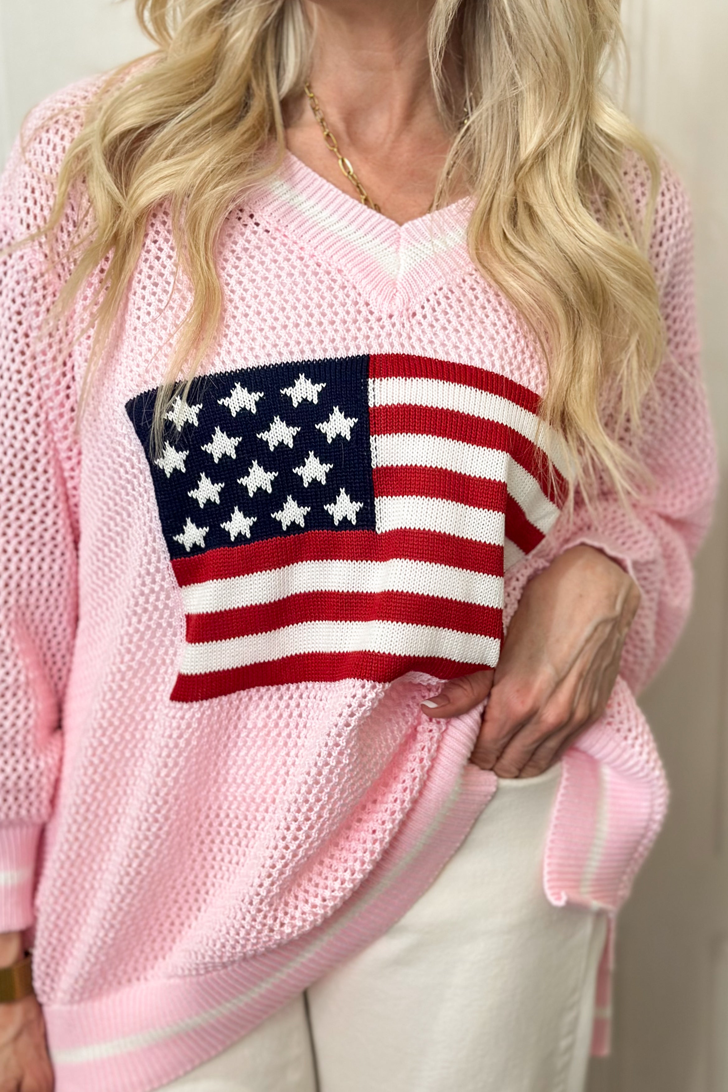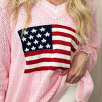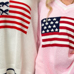 Wrap yourself in patriotic charm with this crochet V-neck long sleeve, complete with a bold American flag jacquard appliqué and varsity stripes running along the ribbed neckline, cuffs, and hem. The relaxed, breathable knit makes it perfect for casual layering, while the one-size-fits-most cut keeps things effortless. A fun, spirited piece that celebrates your Americana style.