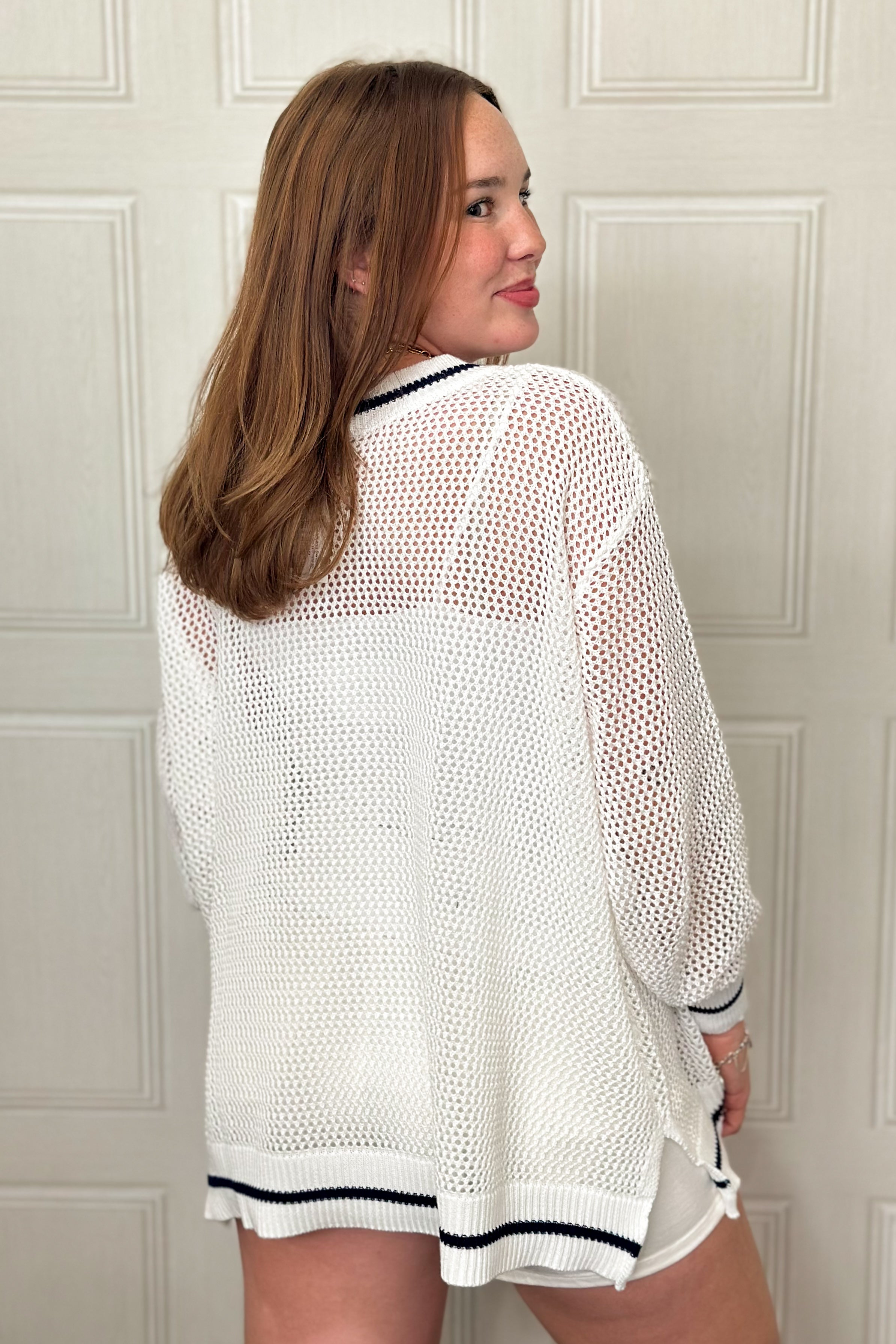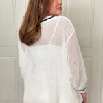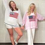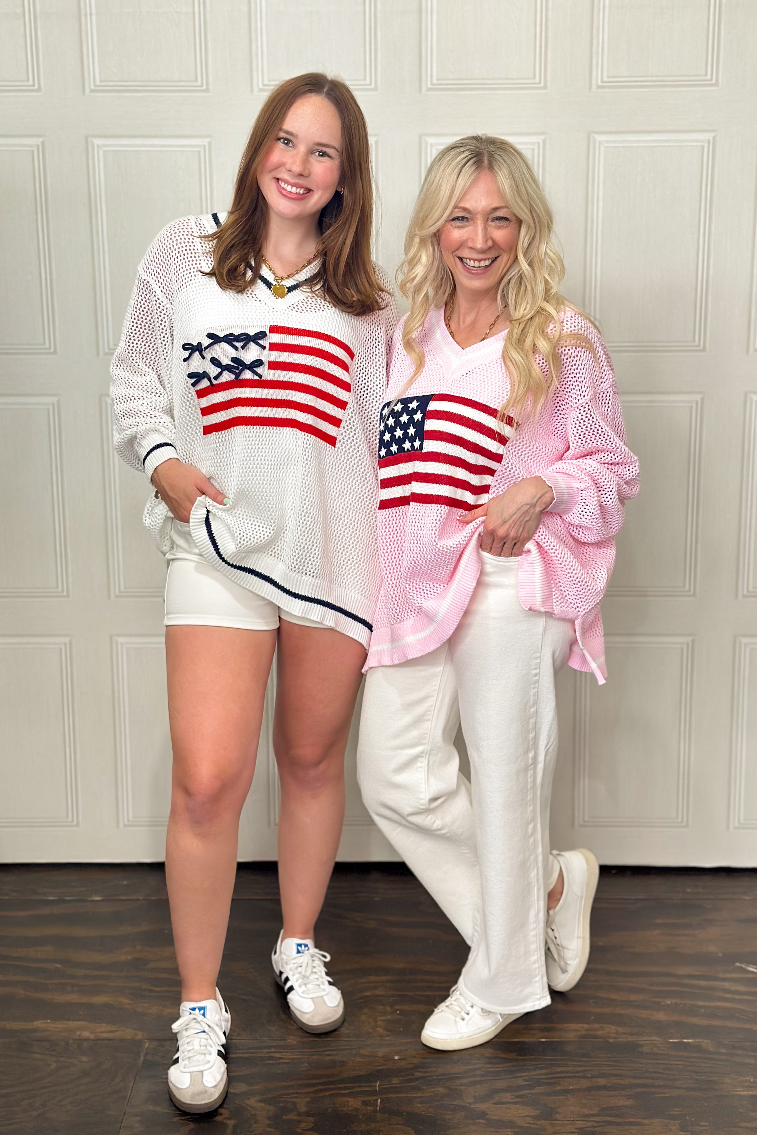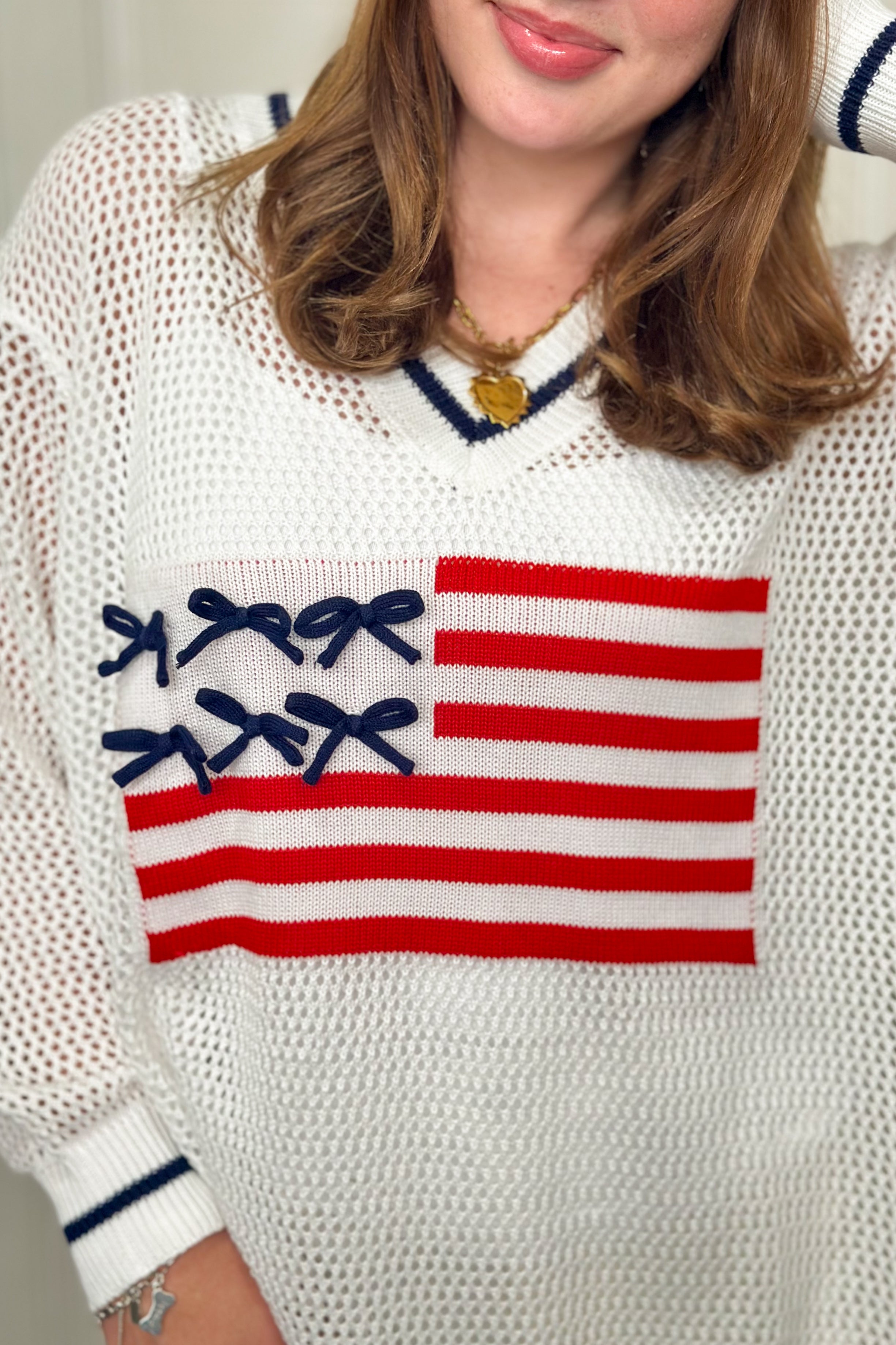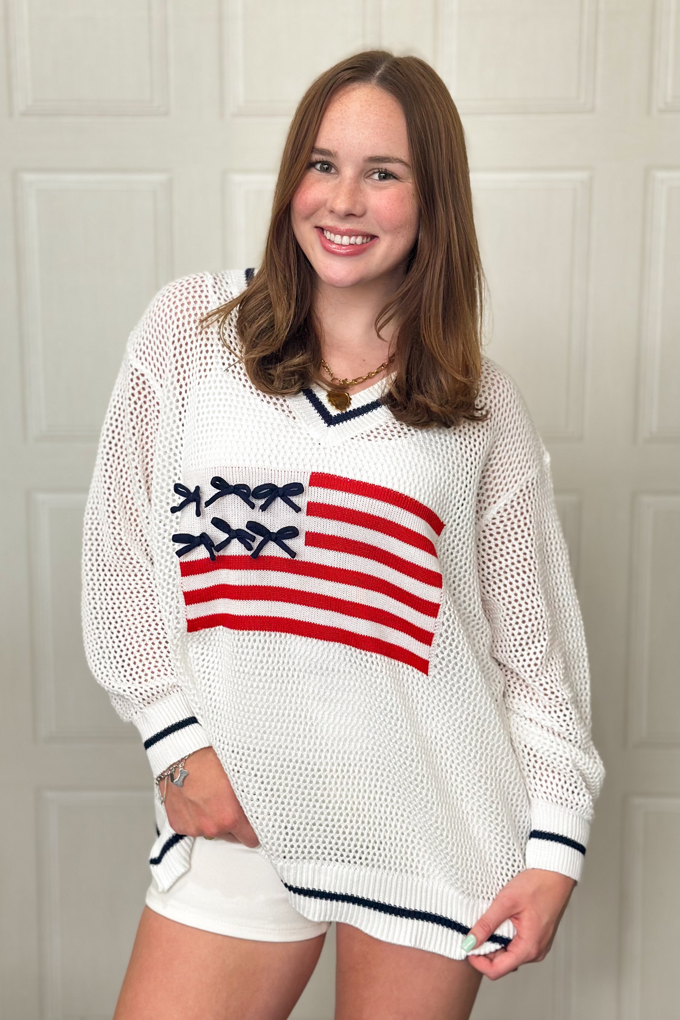 Wrap yourself in patriotic charm with this crochet V-neck long sleeve, complete with a bold American flag jacquard appliqué and varsity stripes running along the ribbed neckline, cuffs, and hem. The relaxed, breathable knit makes it perfect for casual layering, while the one-size-fits-most cut keeps things effortless. A fun, spirited piece that celebrates your Americana style.