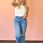 One of our favorite trend in jeans is here in our beloved “magic” Dad jean. With a high waist and cross-cross waistband, the relaxed fit denim with destroyed knee will take you through your casual days or date night with a fun top. The magic in the jeans is the rigid front and the great stretch we love in the back making this jean a super feeling fit.