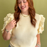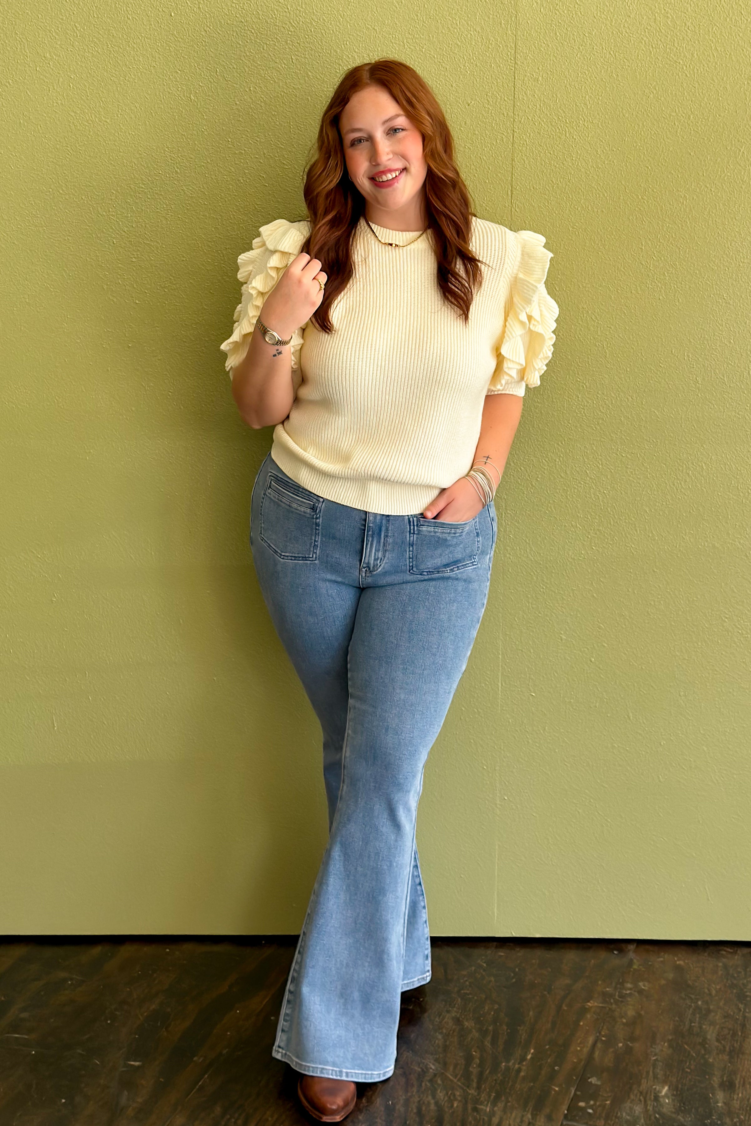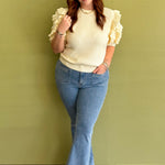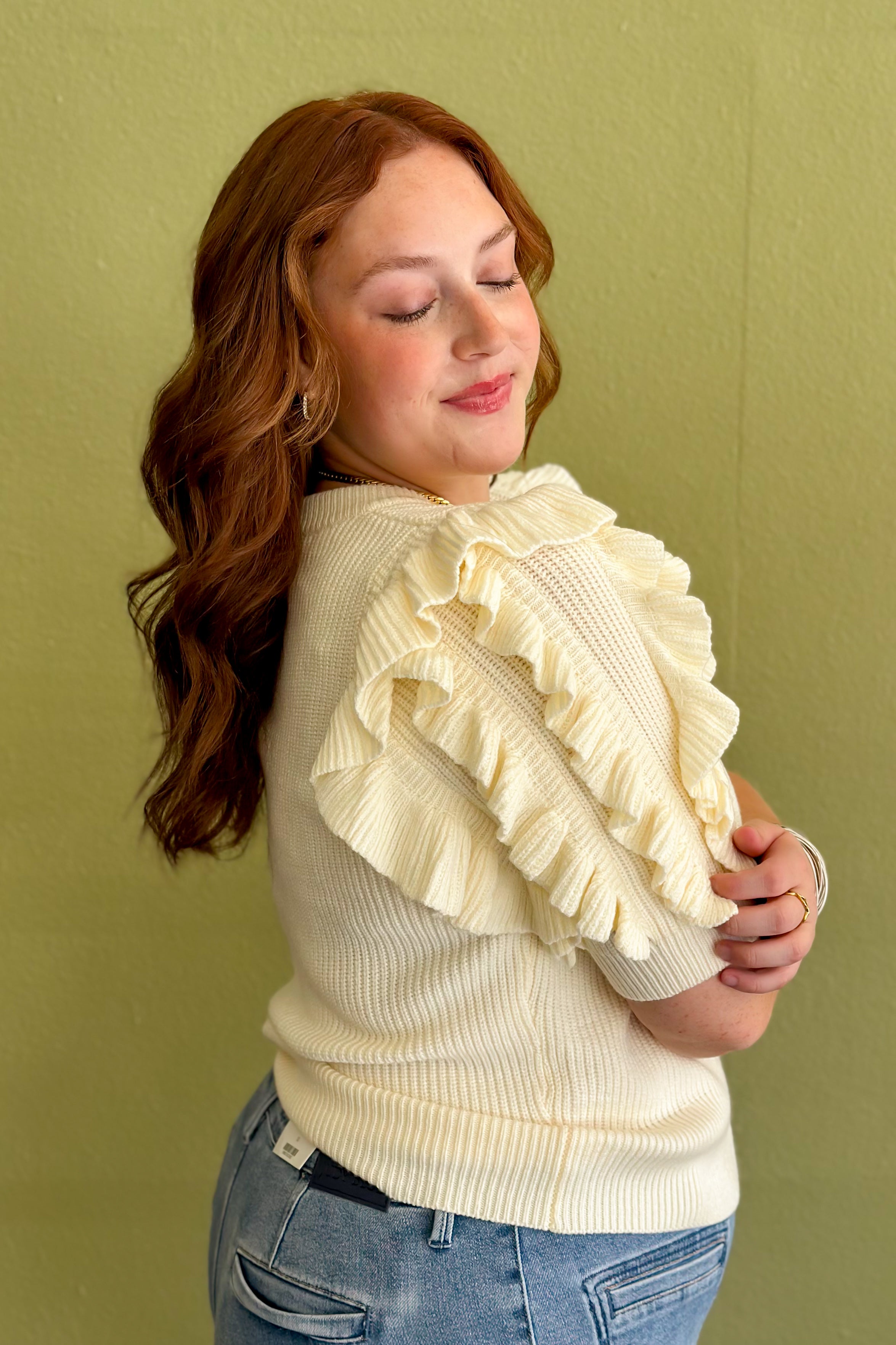 Playful meets timeless in this ruffle detail sweater. Designed with short sleeves, ribbed cuffs, and a classic round neckline, it’s the perfect lightweight knit to dress up denim or layer under a blazer. We love this solid staple that has such a cute style.