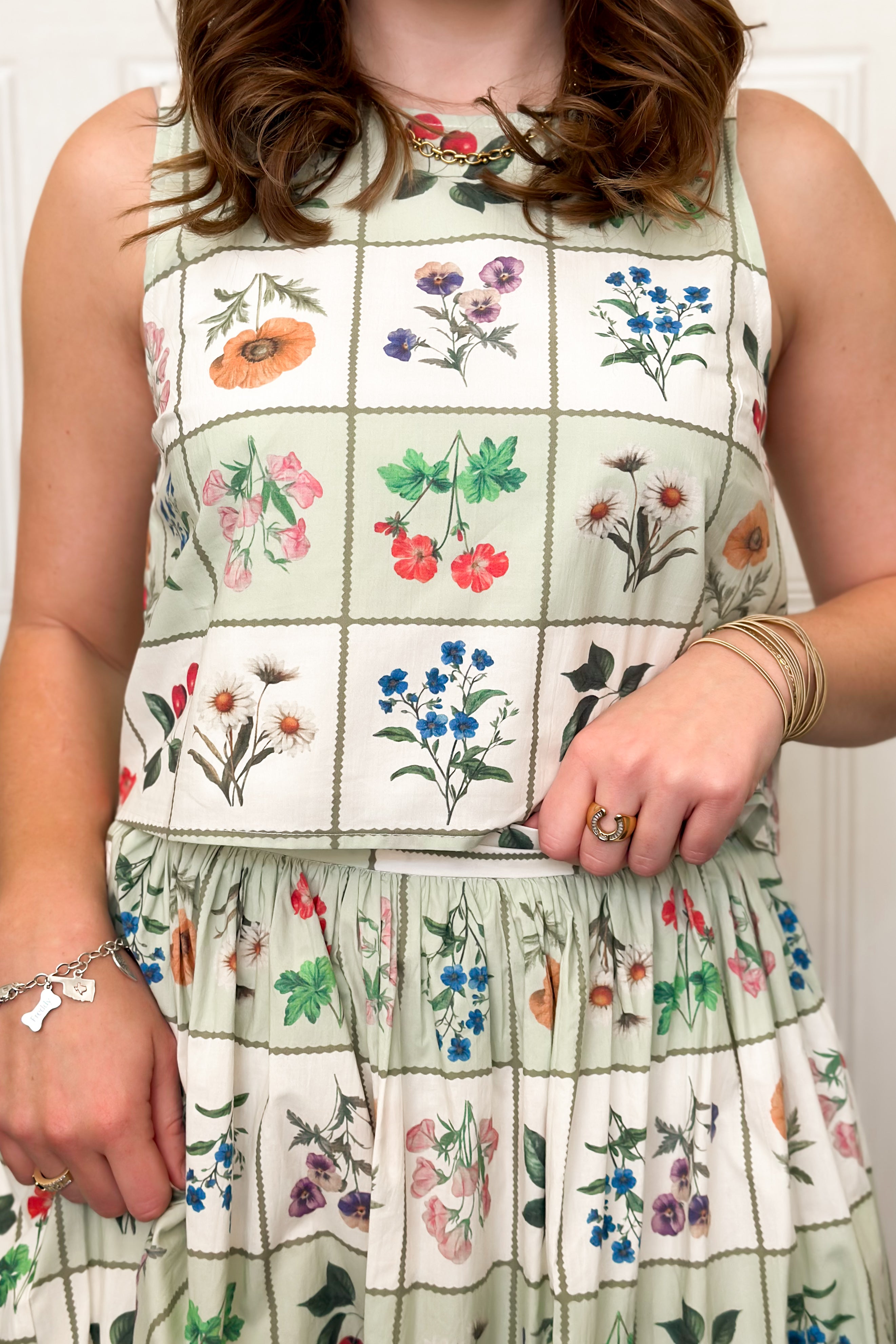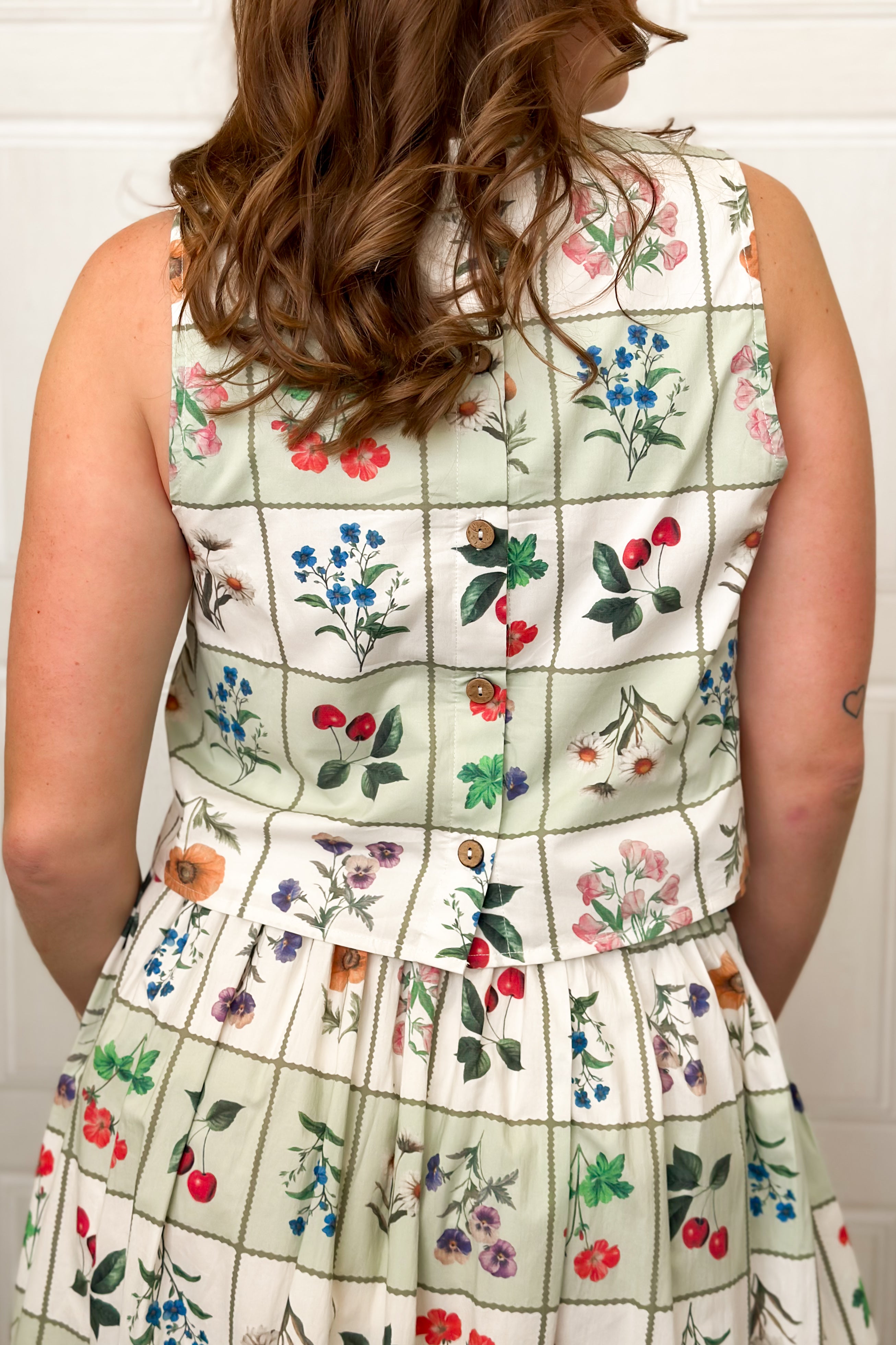 Fresh and feminine, this botanical skirt set with cropped, sleeveless top with button-back detail and a flowing midi skirt is the sweetest spring set! The floral print gives this a vintage feel while the full skirt creates beautiful movement, making it perfect for spring events, brunch dates, or warm-weather celebrations. Wear the pieces together for a statement look or mix and match for creative styling all season long.