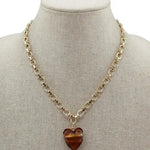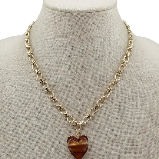 Just to add a little of your favorite hue to your jewelry with this necklace. The hanging brown acrylic on this gold link chain will compliment any outfit. It is also a great gift with the heart showing love to your person.