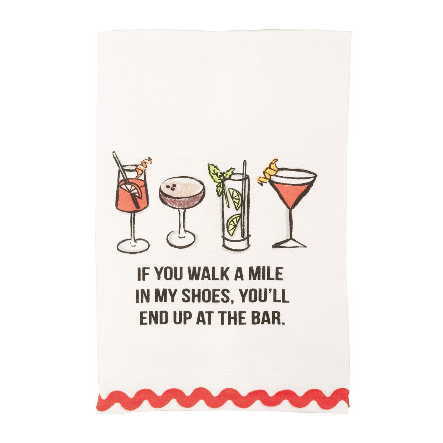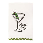 Happy Hour is Here! Bring it to your evening with the Happy Hour Bar Towels. Each towel has an scallop ric-rac or pom pom hem with playful and whimsical graphic making it a delightful accent to your home