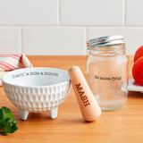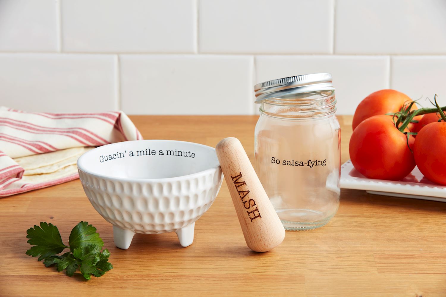 How fun & unique is this Salsa and Guac Set? A perfect addition to any kitchen or dining table or gift. This 3-piece set includes a beautifully dimpled ceramic guacamole bowl, designed to enhance the presentation of your favorite guacamole recipes. Accompanying the bowl is a sleek glass salsa jar, ideal for showcasing vibrant, flavorful salsas. Completing the set is a sturdy wooden muddler, perfect for mashing avocados or mixing ingredients to perfection. The bowl measures 3 inches in height and 5 inches in diameter, providing ample space for serving.