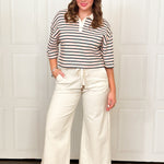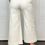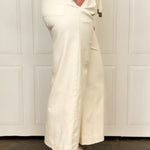 Take your cropped wide leg denim pant look to a different level with this tie nautical front detail. These off white casual pants have great stretch and look great with your favorite stripes and button downs. With side pockets, we know you are going to feel right at home in these pants. Don't hesitate on this style, it is one of our favorite sellouts.