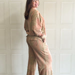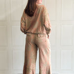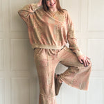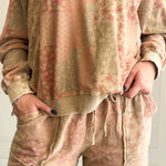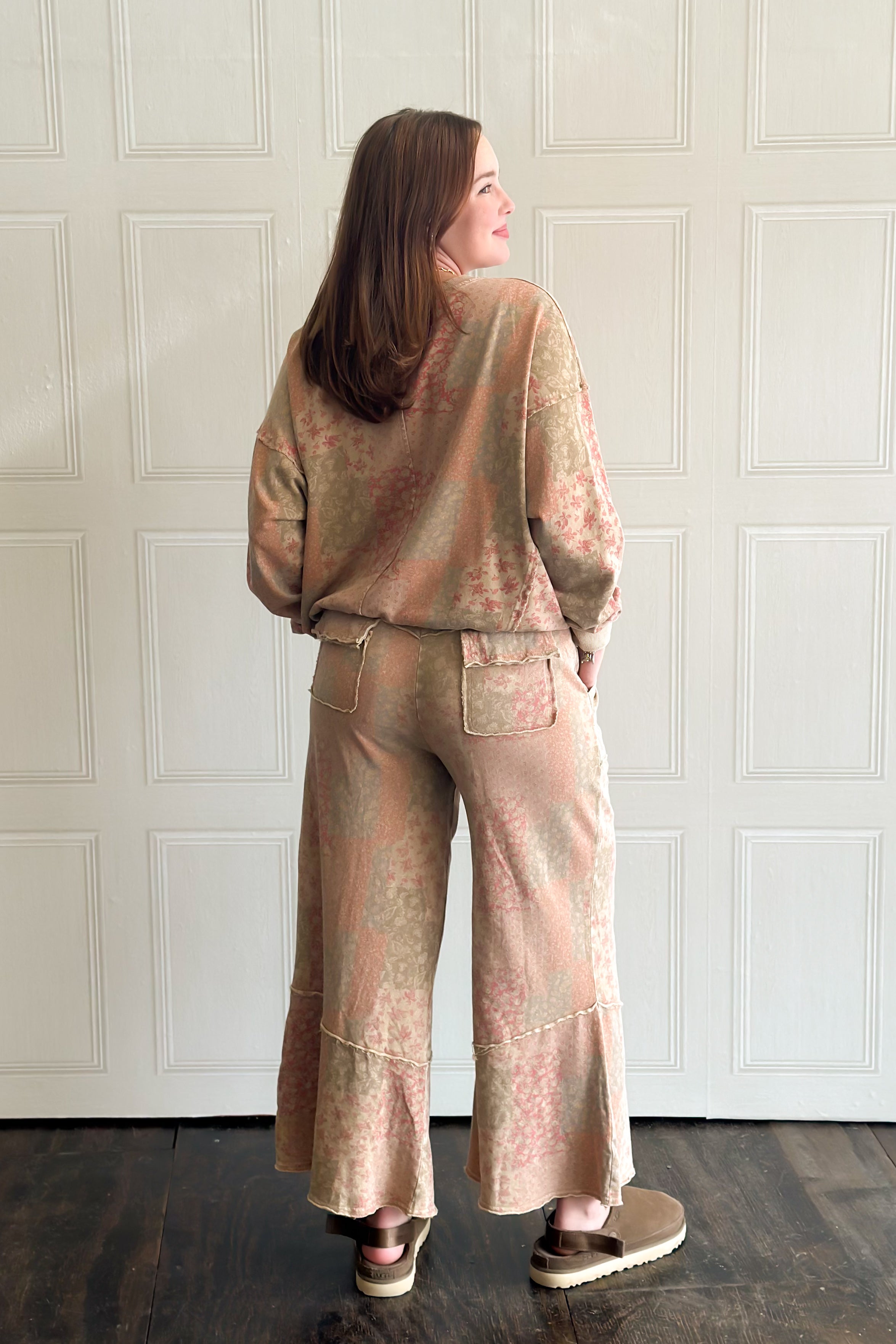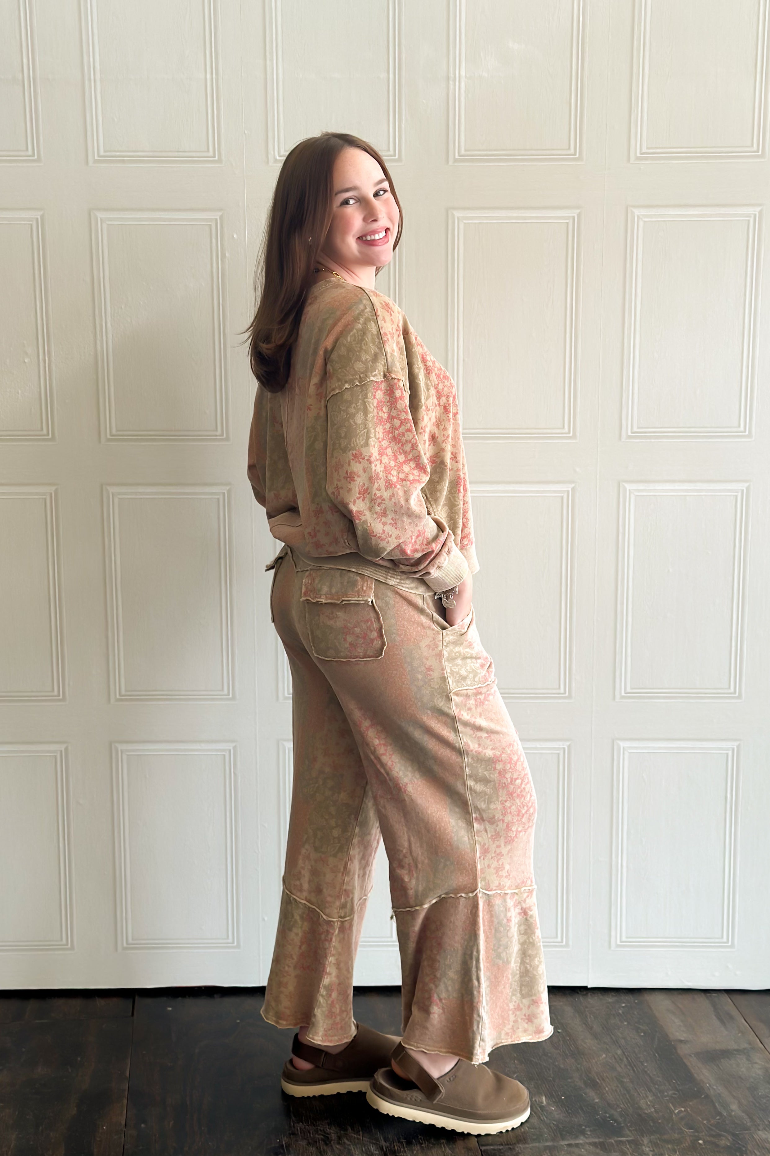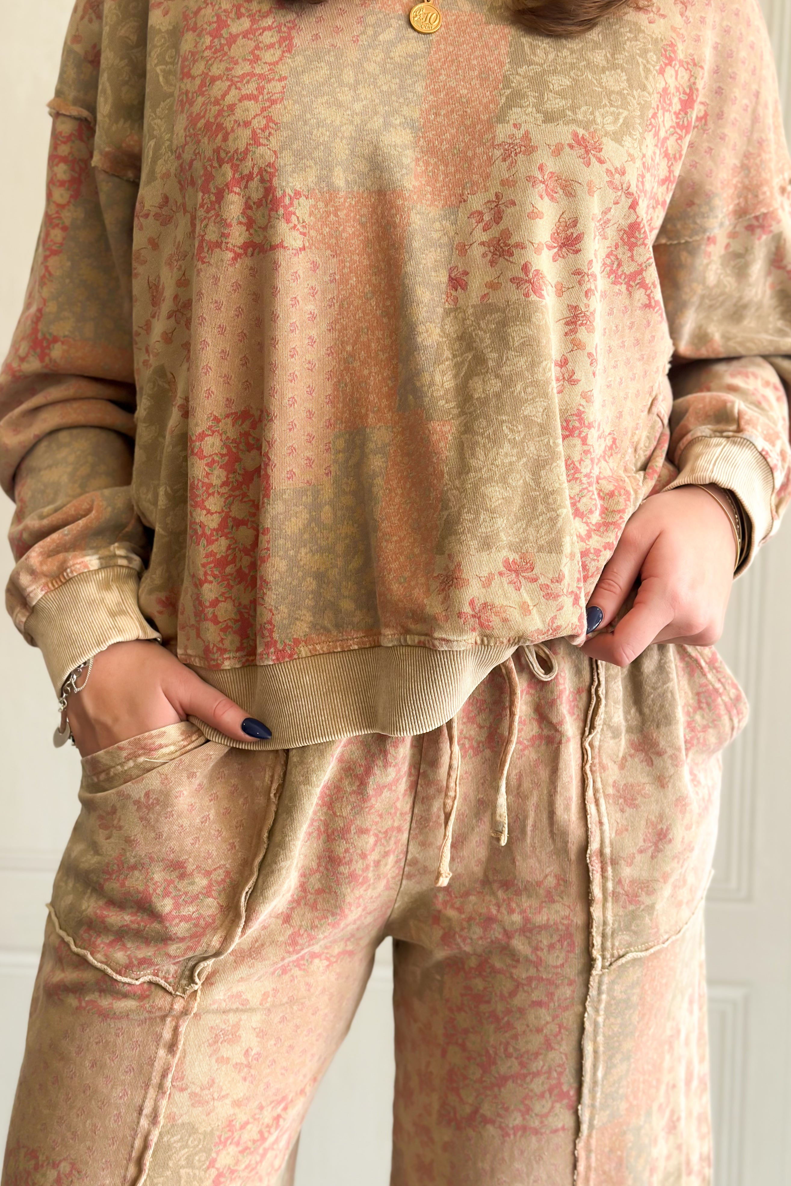 Wrap yourself in effortless comfort and artsy charm with our patchwork print mineral washed reverse terry set. The wide-leg pants feature a relaxed fit with an elastic drawstring waist, side pockets, and a full-length silhouette for easy movement and everyday wear. The matching crewneck completes the look with with its colorful mixed floral patchwork print that feels one-of-a-kind. Perfect for lounging, weekend errands, or cozy coffee dates — this set brings laid-back style with a creative twist.