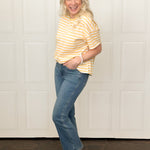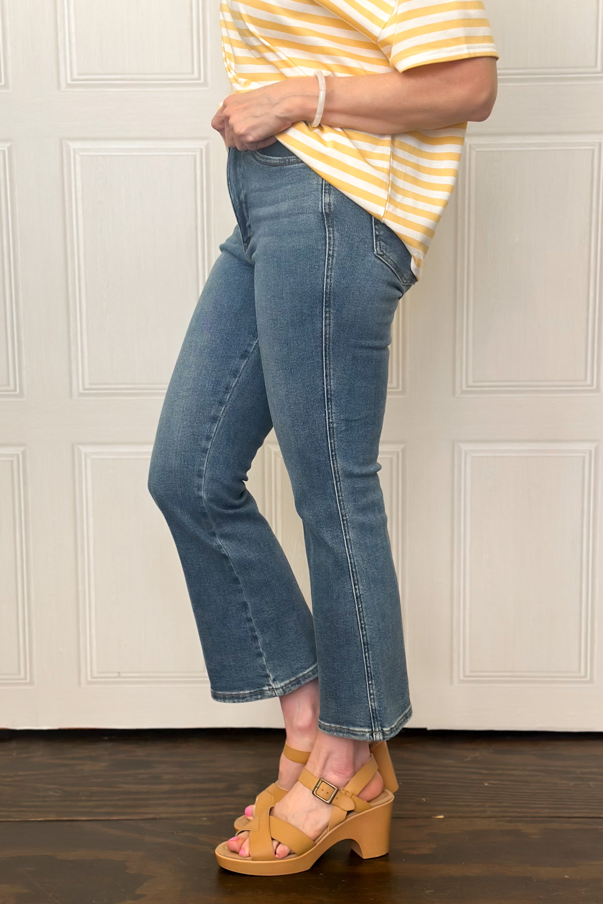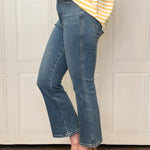Let them look, talk and turn heads in our high waist kick flare jean. The mid wash denim with distressed high/low hem s so versatile, the fit and vibe of this jean is one of our favorites. Don't delay on this one, with the clean look and fit, it's marked to be a best seller!