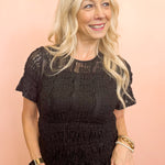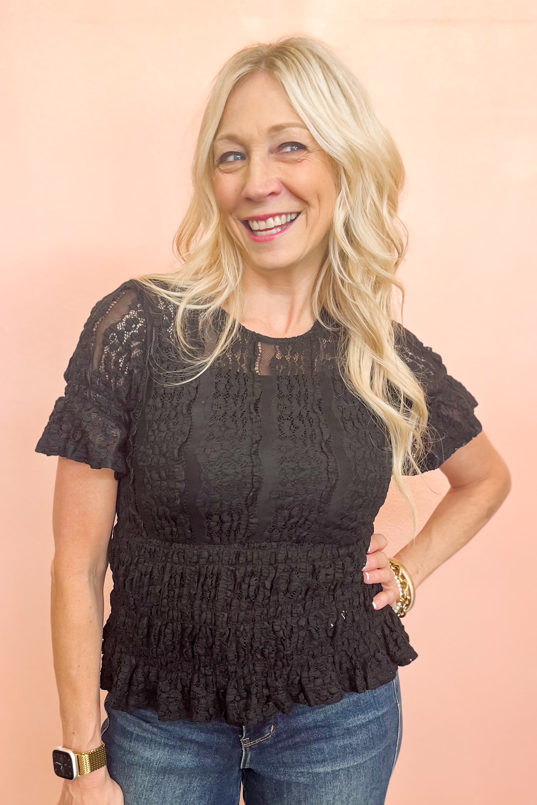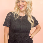 Elevate your evening look with the Midnight Lace Peplum Blouse. Crafted from delicate sheer black lace, this top features short sleeves, a flattering peplum silhouette with elastic bodice, and a touch of romance in every detail. Perfectly balanced between sultry and sophisticated, it pairs beautifully with high-waisted pants or a sleek skirt for an effortlessly polished look.