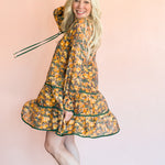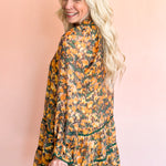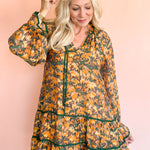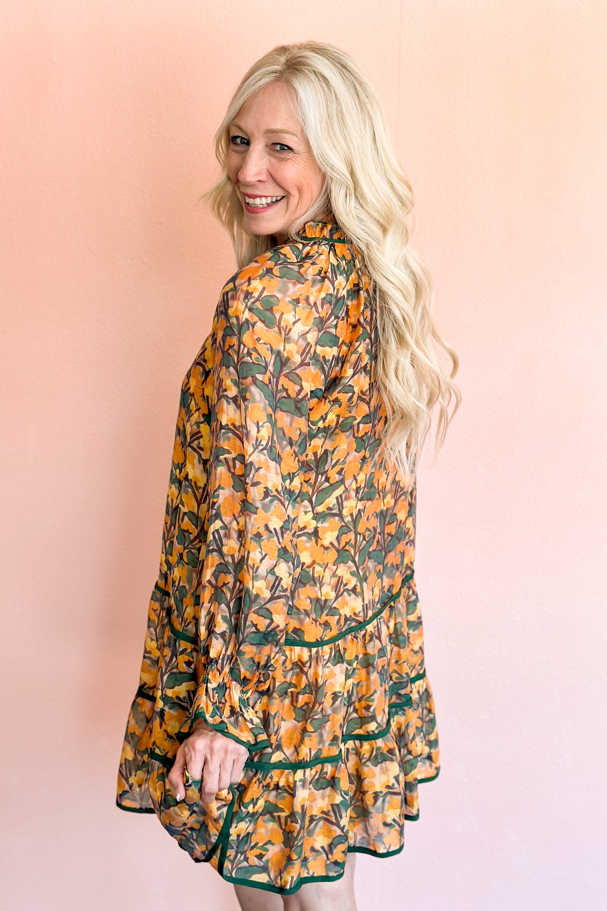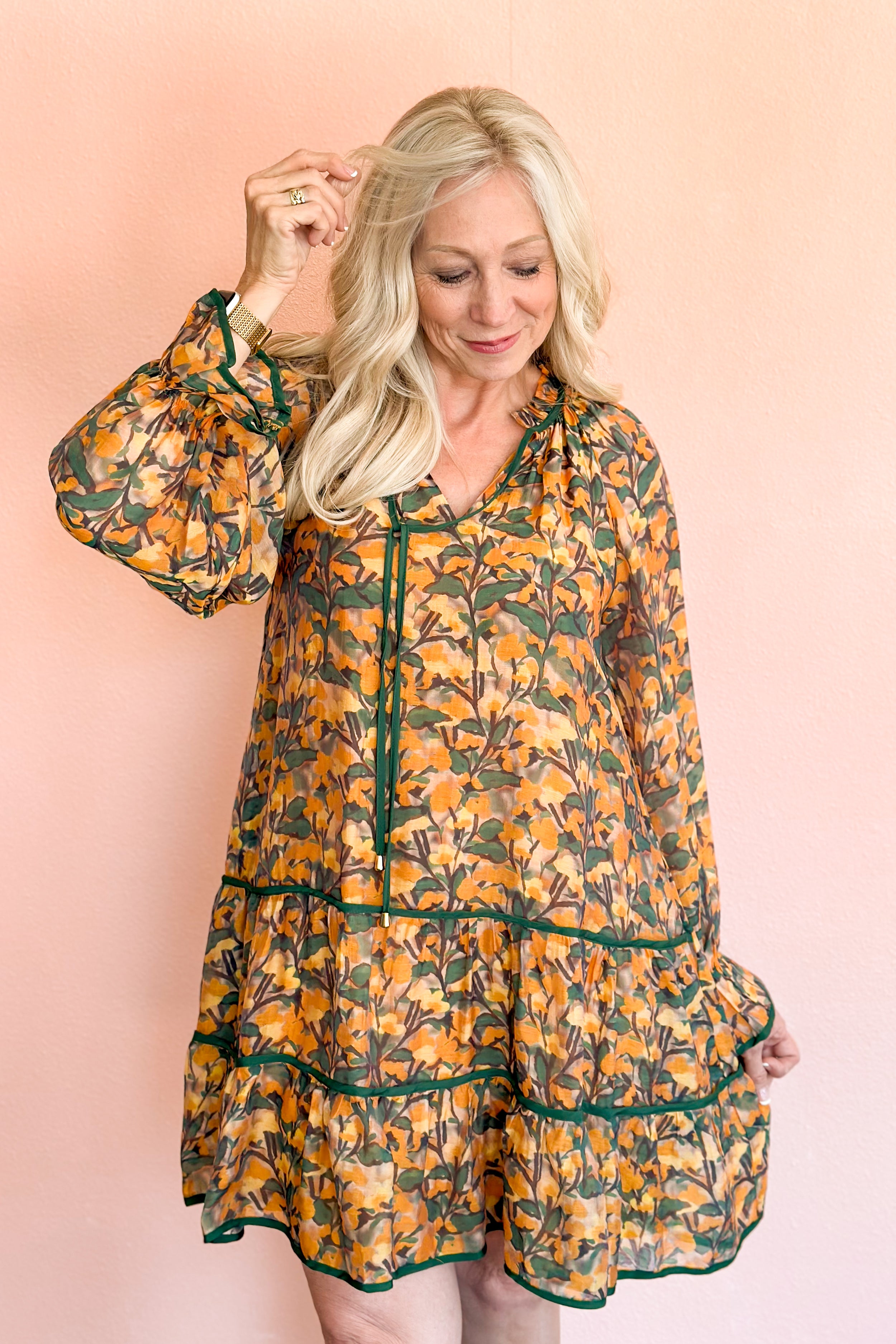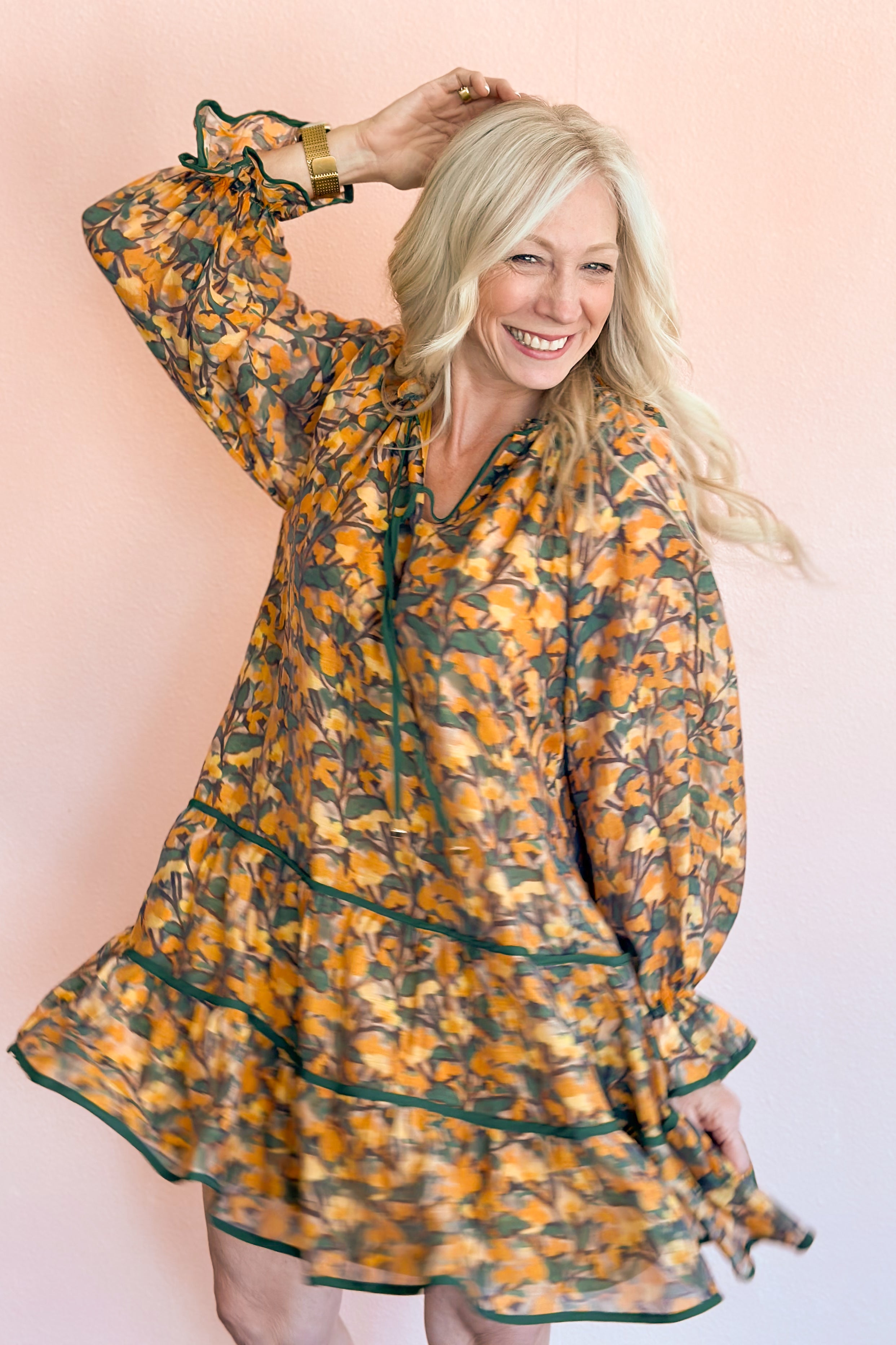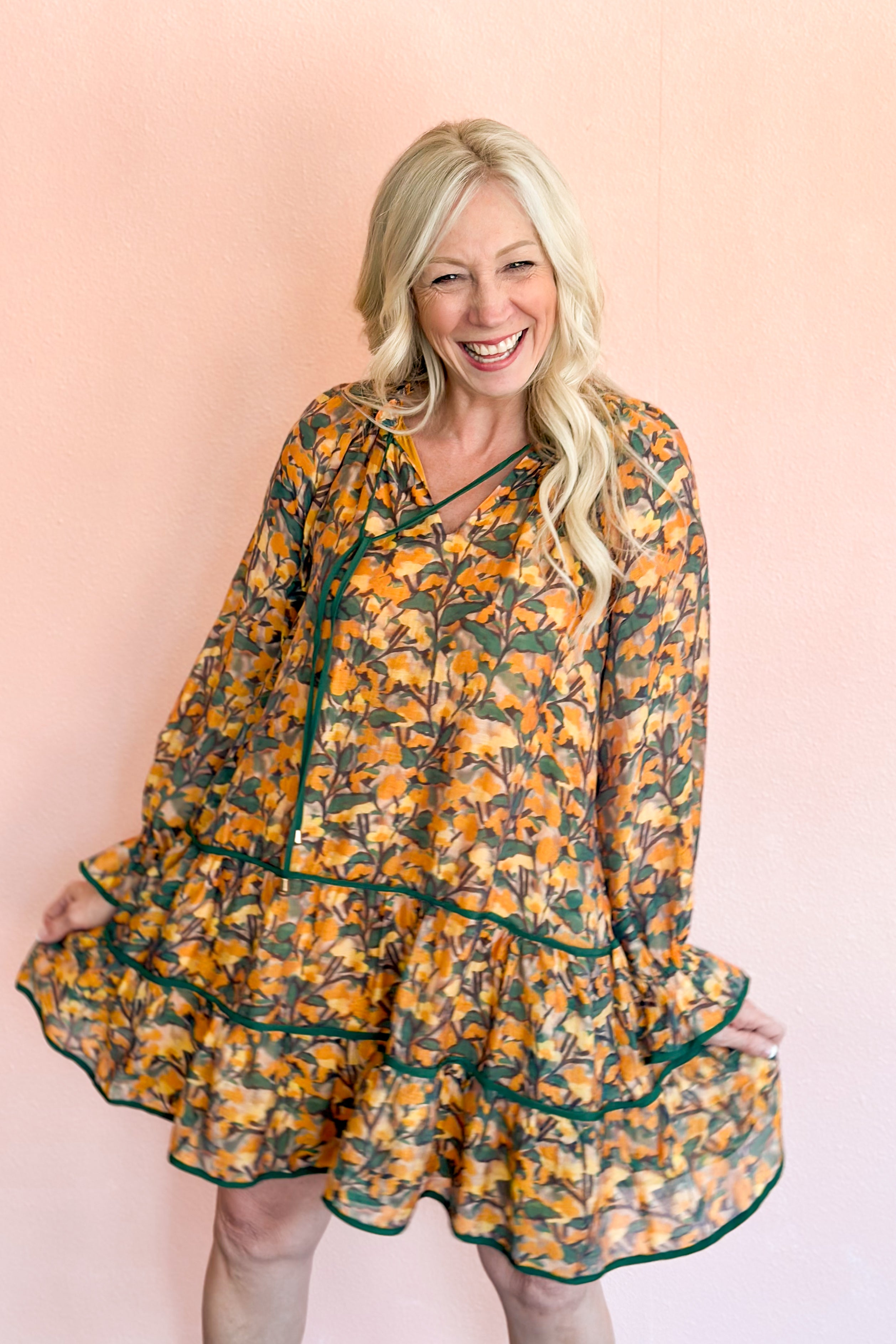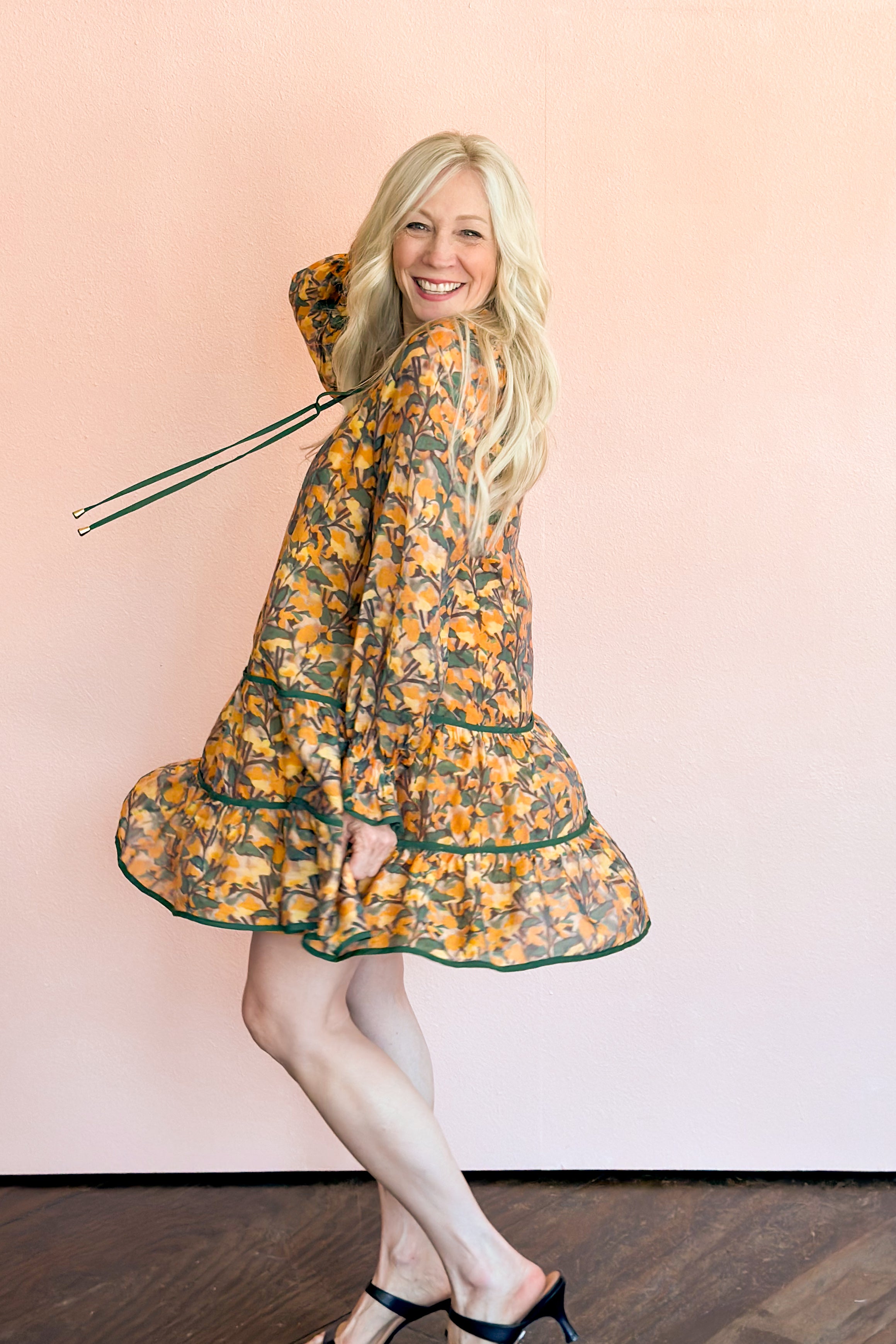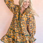 We won't apologize if they don't stop asking about your dress! This printed tiered mini dress with contrast on the ruffles is adorable. With ruffles at the v-neck and sleeves, this lightweight dress will look great with a heel or your knee high boots.