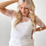 We can't get enough of our lace tops. Layer they with a cami, tee over or under. This floral print mesh short sleeve top is fitted and waiting for you to put in your cart.