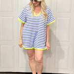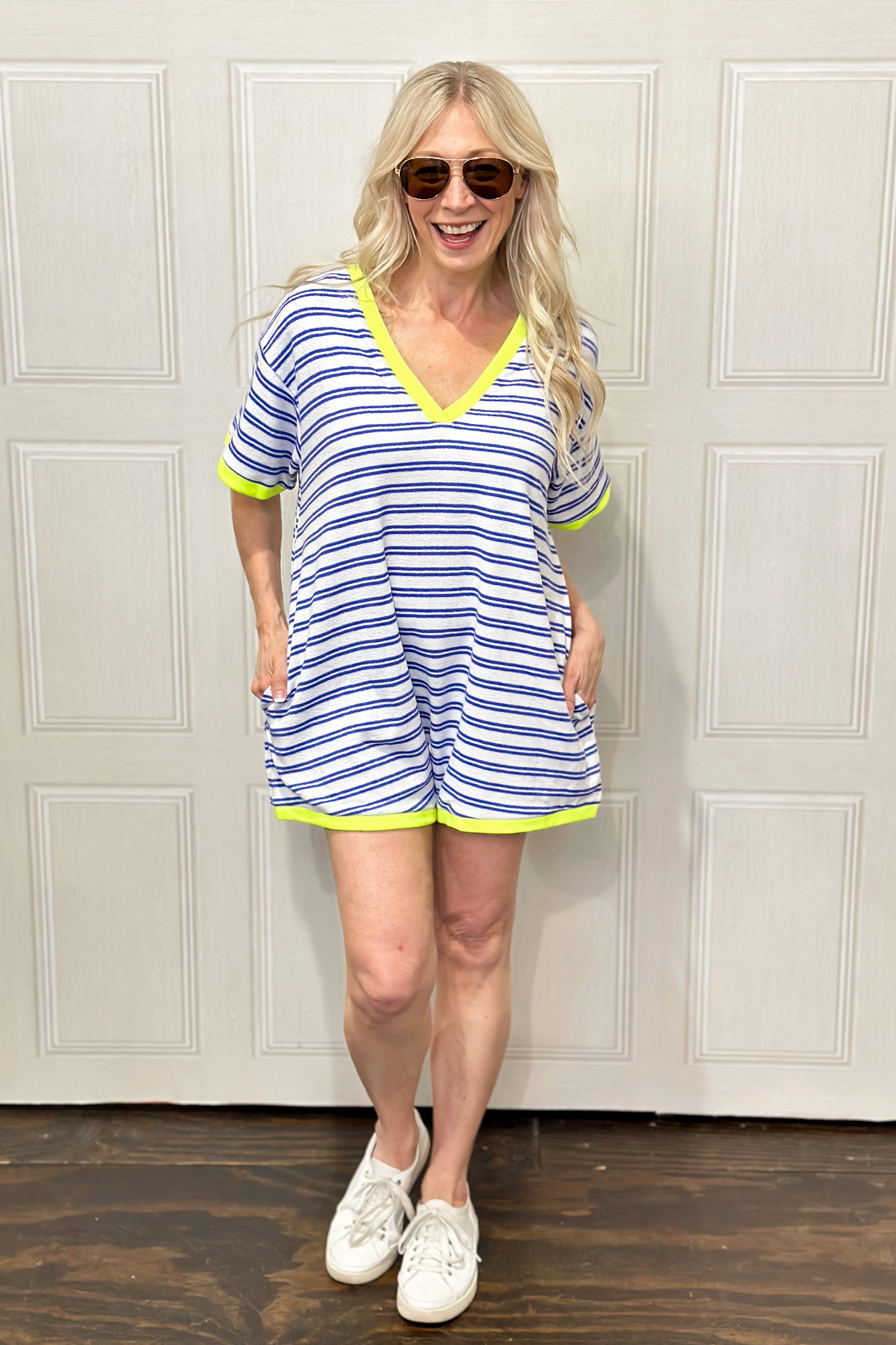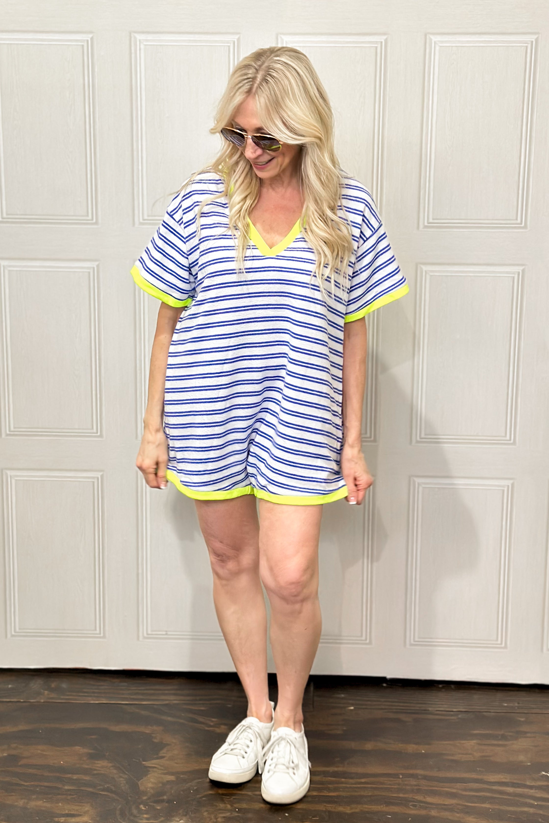Ready to add a pop of color to your wardrobe and have some summer fun? We do and our striped V-neck terry romper is the perfect blend of fun and fashion! This romper oozes effortless cool with the nautical stripes to bring all the summer feels, while the neon yellow contrast add an unexpected splash of boldness that’ll have you shining bright.