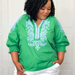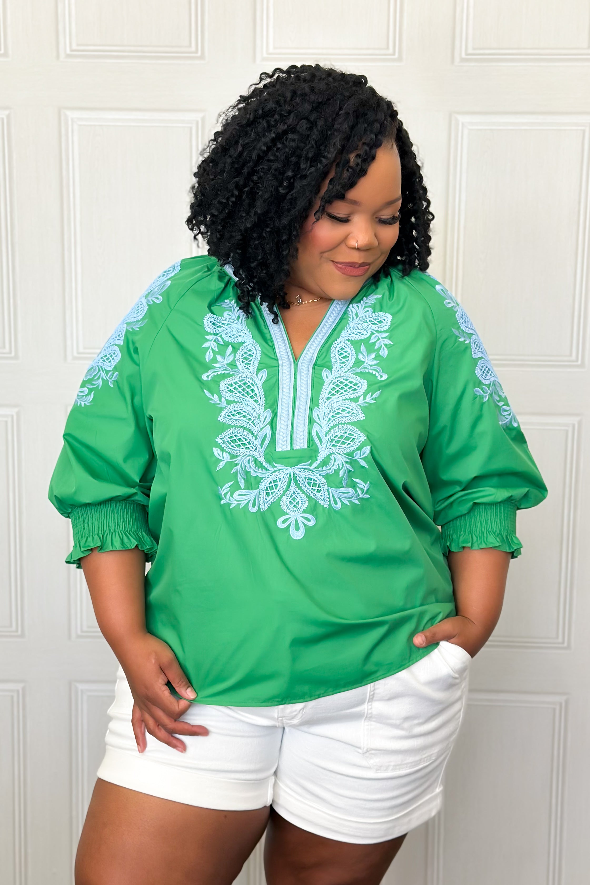 This blouse is the pack and go for your vacation. Day or night, this lightweight embroidered tunic has a beautiful blue contrast embroidery with 3/4 sleeve and elastic smocked cuff. The relaxed fit makes it a great top for your shorts or white pants. And that color? Well, they will be green with envy.