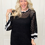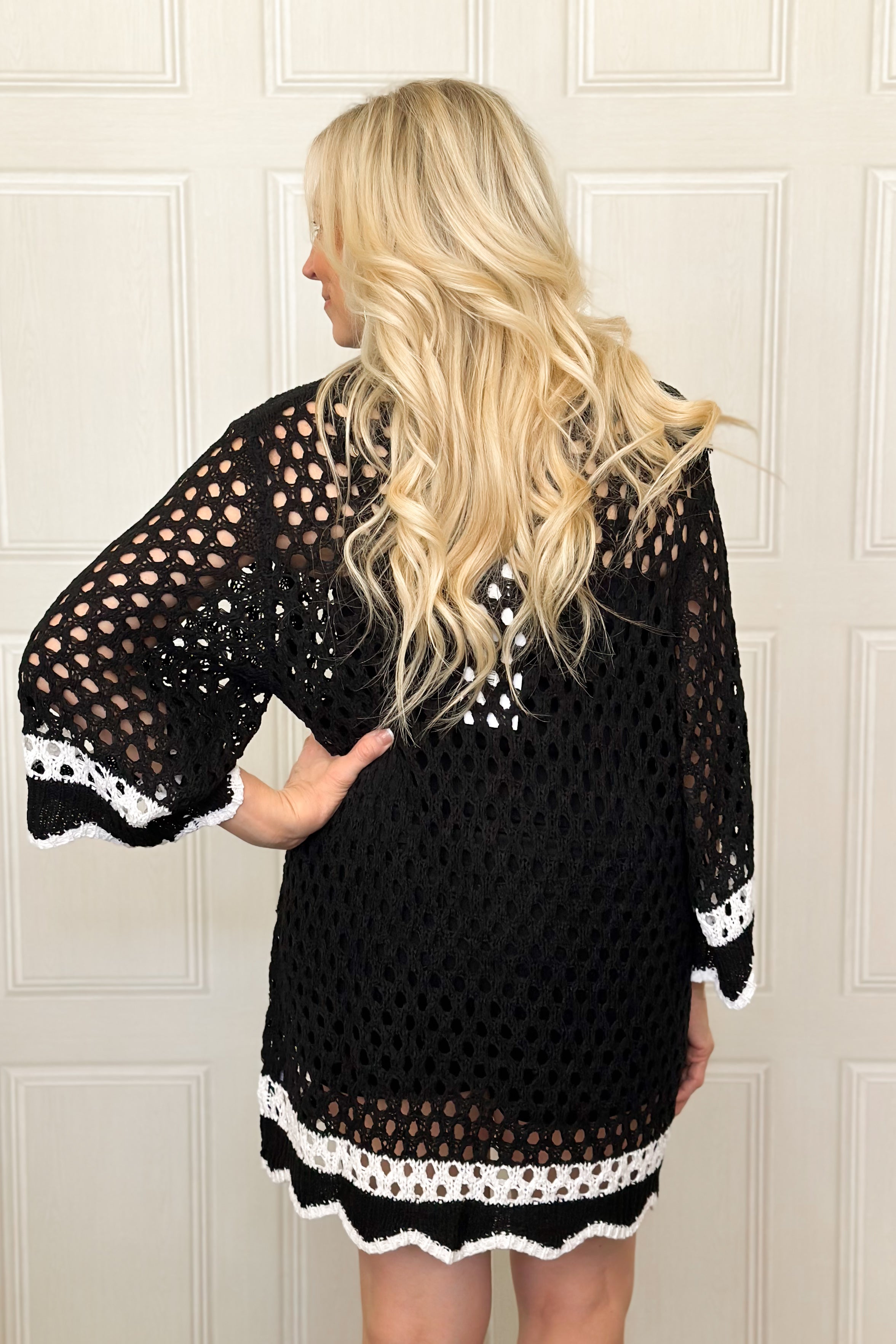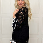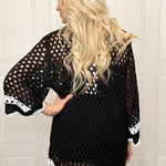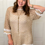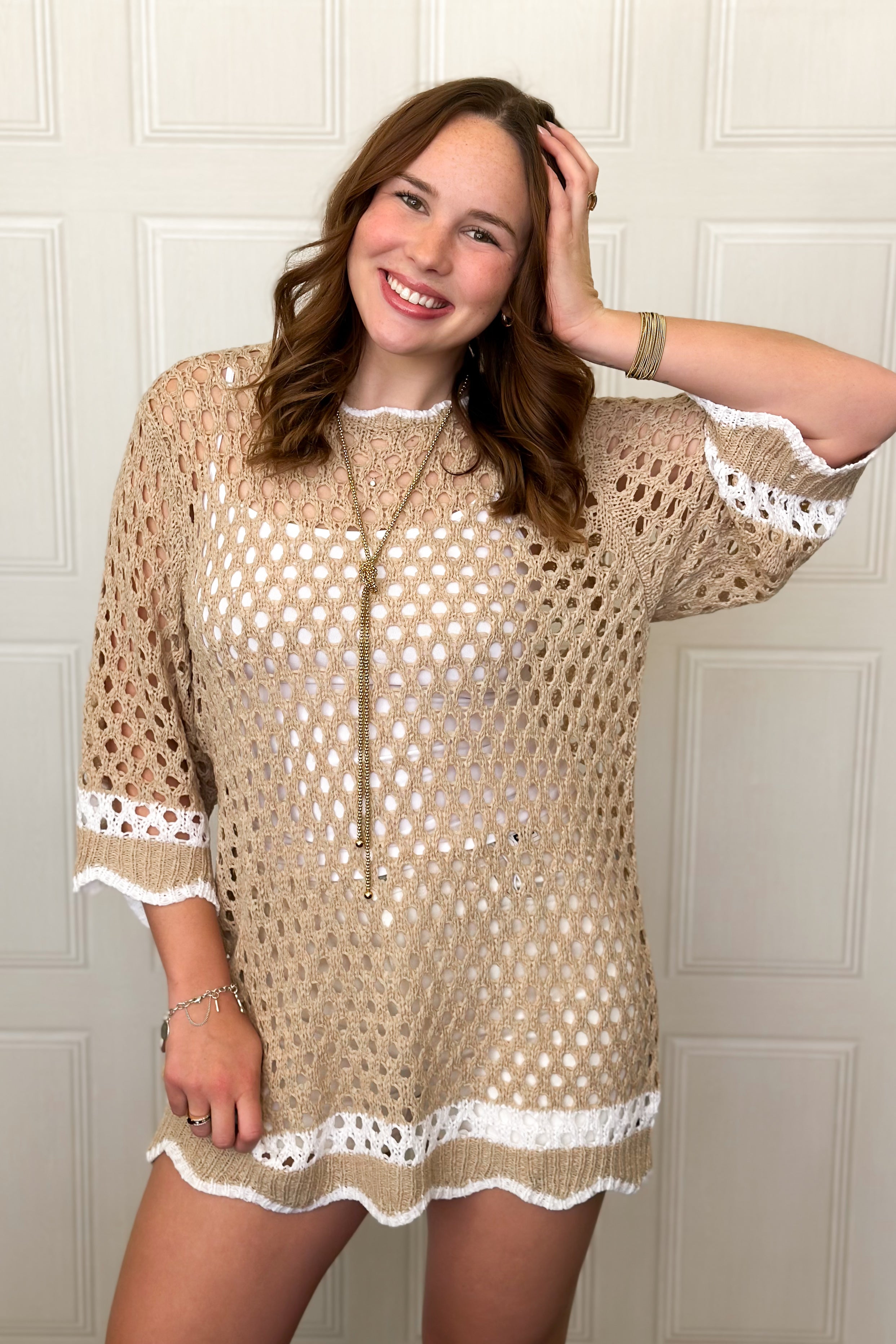 Chic details meet effortless style in this ribboned crochet tunic. Whether you are heading to the lake or keeping cool in the summer heat, this lightweight tunic is a must have. With with three quarter sleeves, it features delicate scallop trim along the edges and subtle stripe detailing at the sleeves and hem for added texture and interest. The airy crochet knit gives it a lightweight, breathable feel, while the longer tunic length makes it easy to pair with denim or relaxed bottoms. Perfect for transitional days when you want something cute, and just a little bit special.