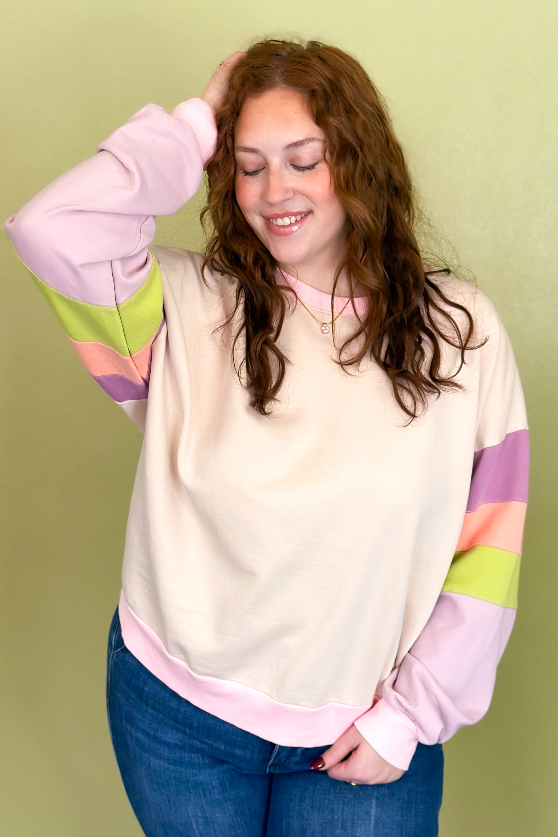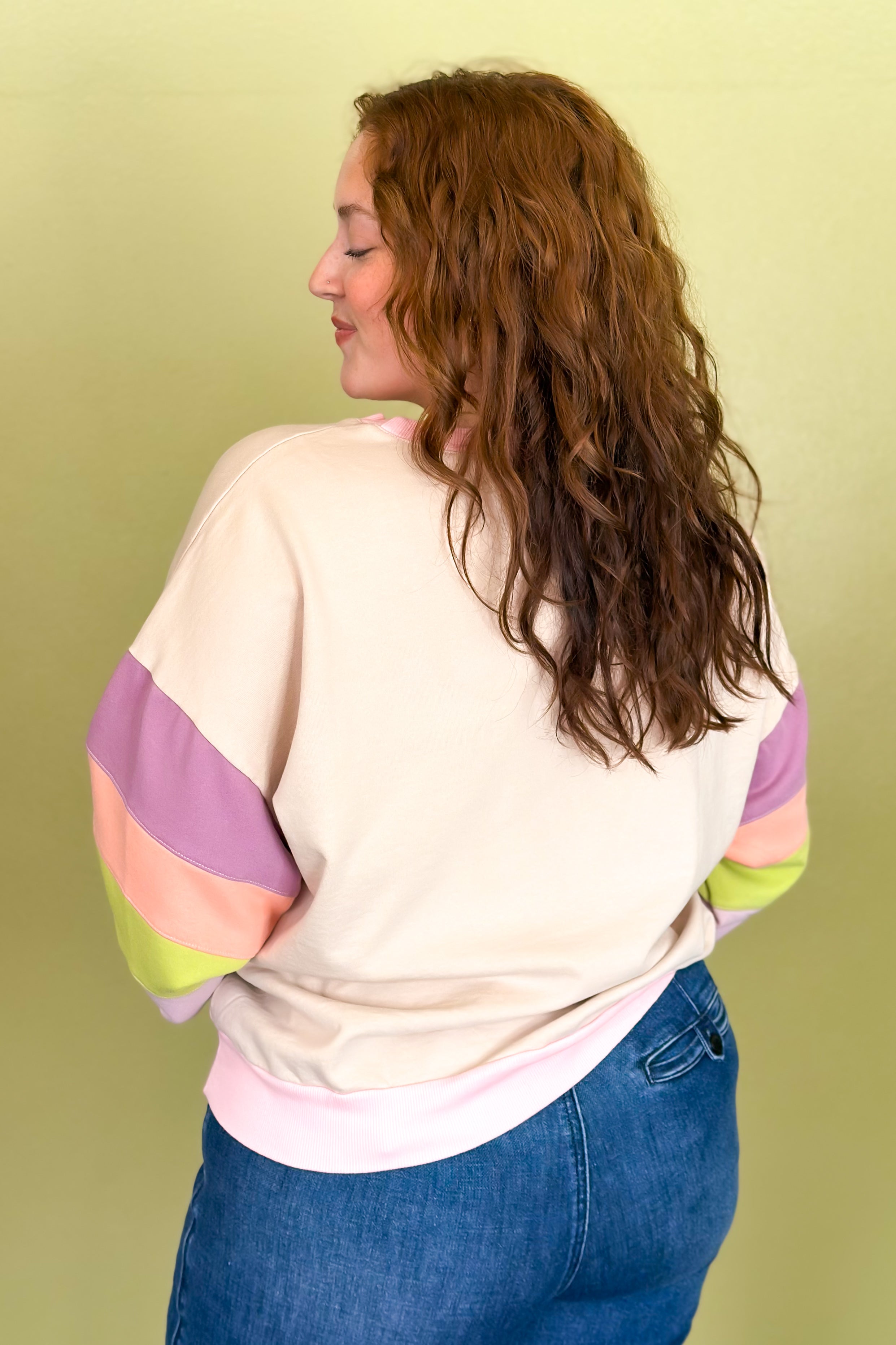 Soft, lived-in, and effortlessly cute — with that perfect vintage touch, while the pastel striped sleeves add a sweet pop of color. Relaxed, comfy, and ready for everyday wear, this one is your new throw-on-and-go favorite.