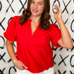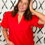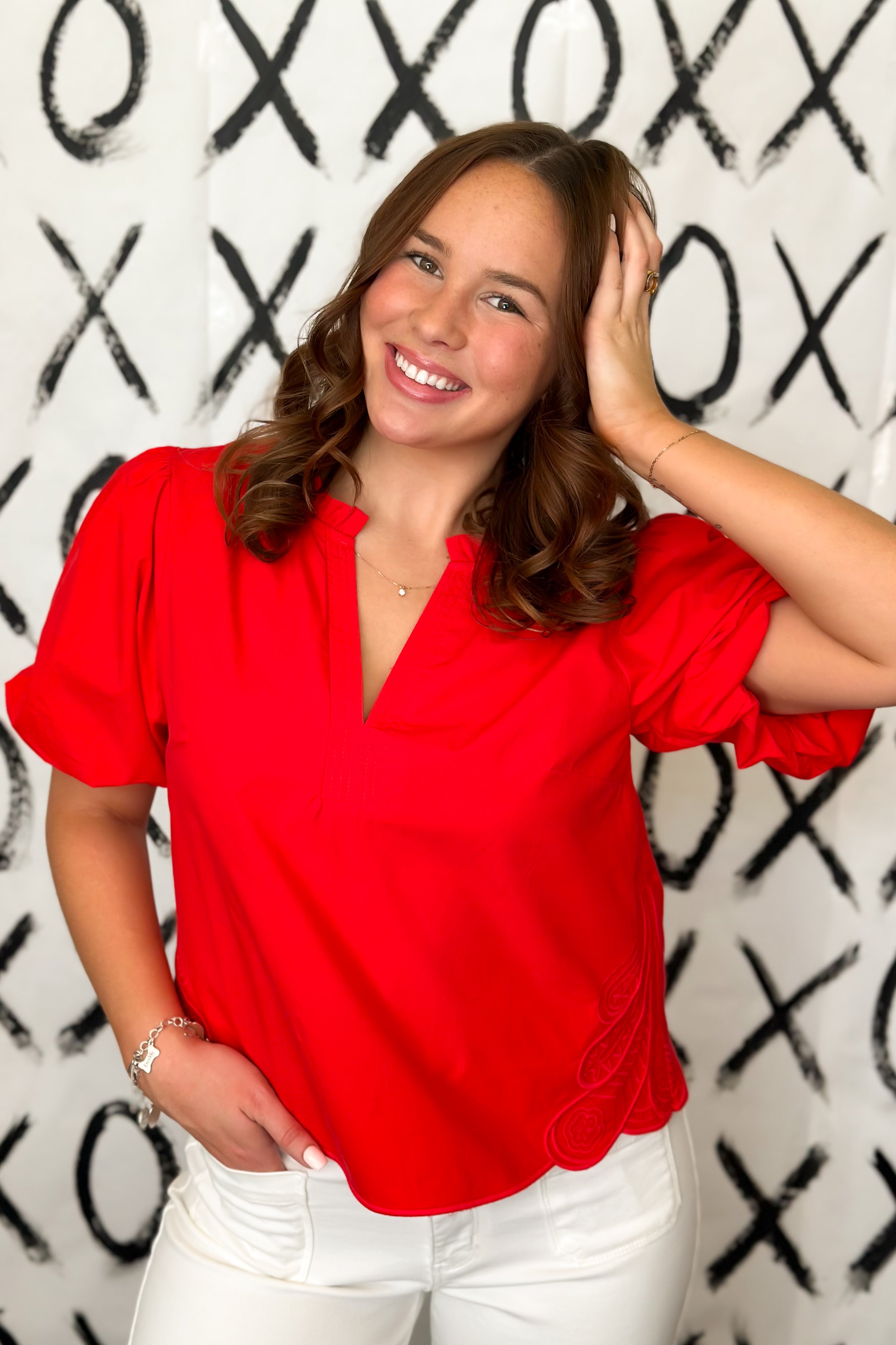 All you need is your standout red lipstick to accessorize this cute bubble sleeve blouse. This short sleeve tunic style blouse adorned with embroidery on the bodice. With the scalloped hem to add a feminine touch, add your favorite dark denim high rise jeans and head out for date night.