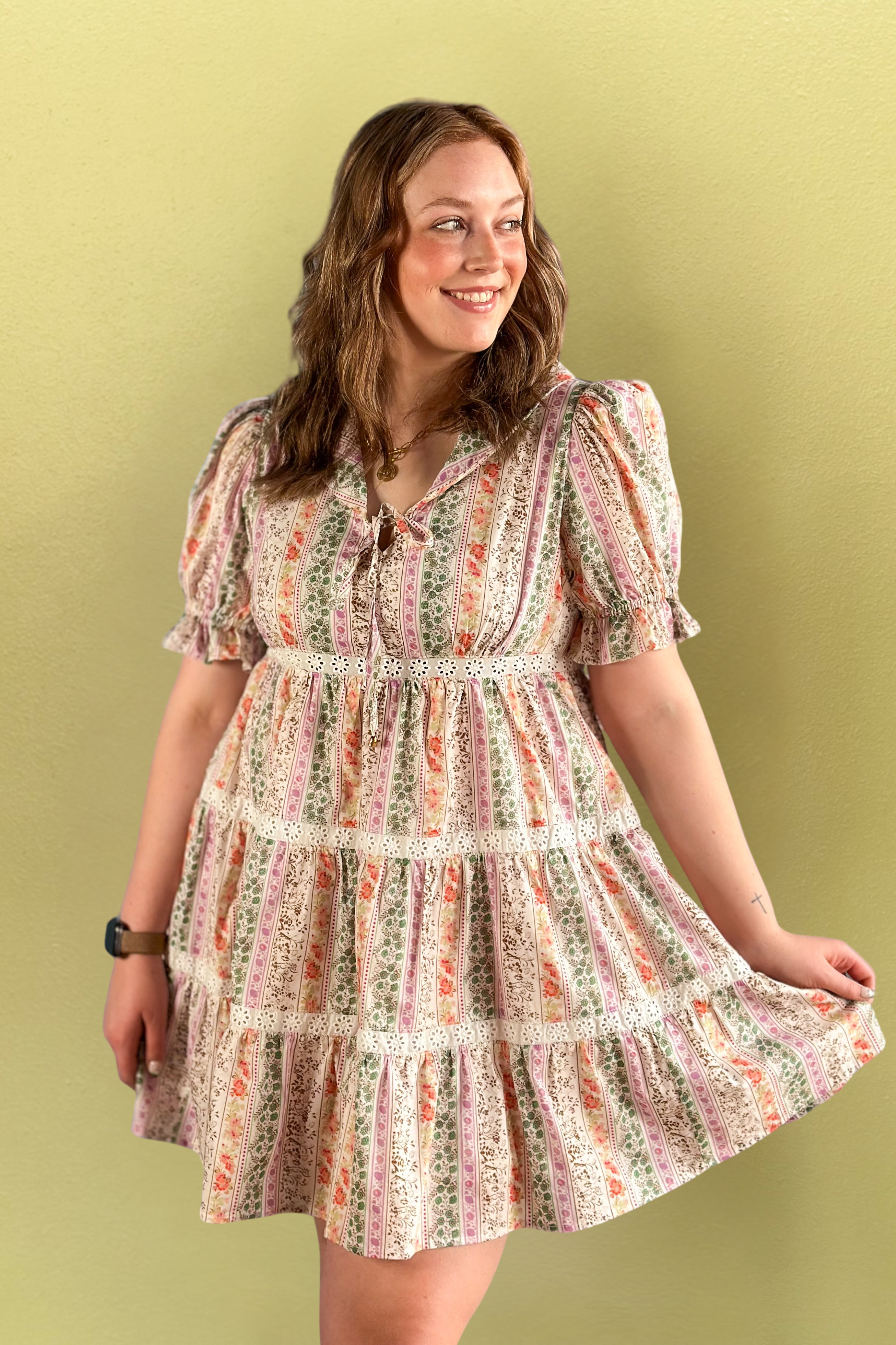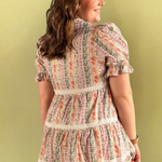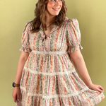 Get ready to fall in love with our mixed floral and lace dress! This playful pullover dress features a sailor-inspired collar and front bow tie with a tiered bodice on this must have dress. Perfect for any occasion and with this color mix, any season.