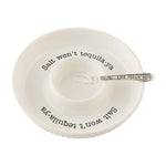 Make the best margaritas with our Margarita salt rimmer and lime set. The two piece set comes with debossed ceramic salt rimmer dish. The salt rimmer features the phrasing "Salt won't tequila-ya" The rimmer features center well to hold limes and arrives with silver-plate lime fork that reads "Lime feelin' good".