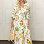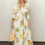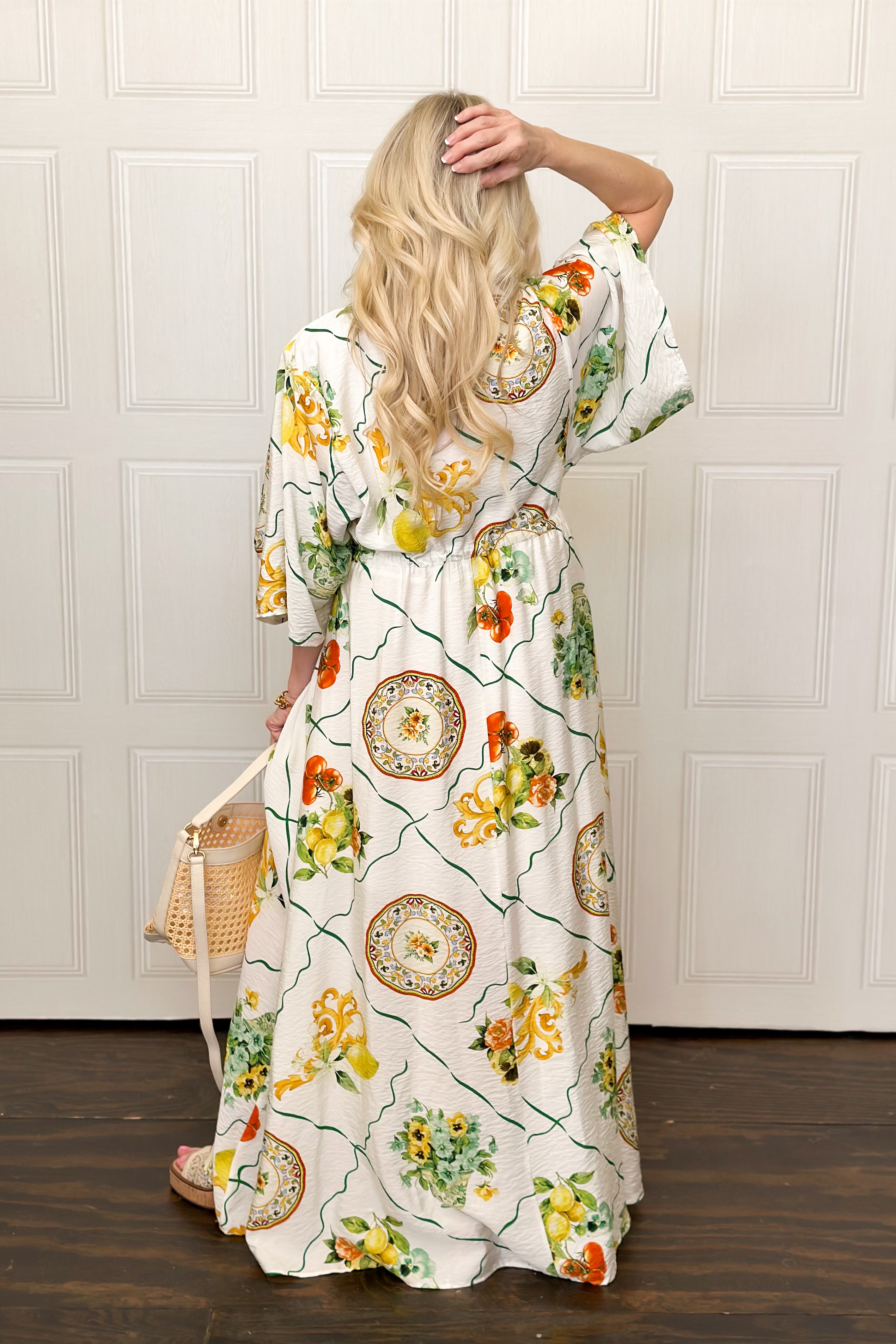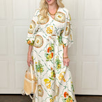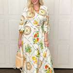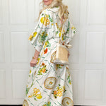 Effortlessly elegant with a touch of mythic charm, this dramatic maxi dress features a flattering V-neckline, relaxed sleeves, and an adjustable waist tie for customizable shape. The flowing silhouette drapes beautifully, while the rich green and warm orange print evokes a timeless, Grecian-inspired feel. Lightweight and comfortable, it’s perfect for warm days, special gatherings, or elevated everyday wear. Style it with sandals for a relaxed look or dress it up with wedges and gold accessories for a goddess-worthy moment.
