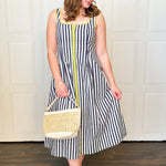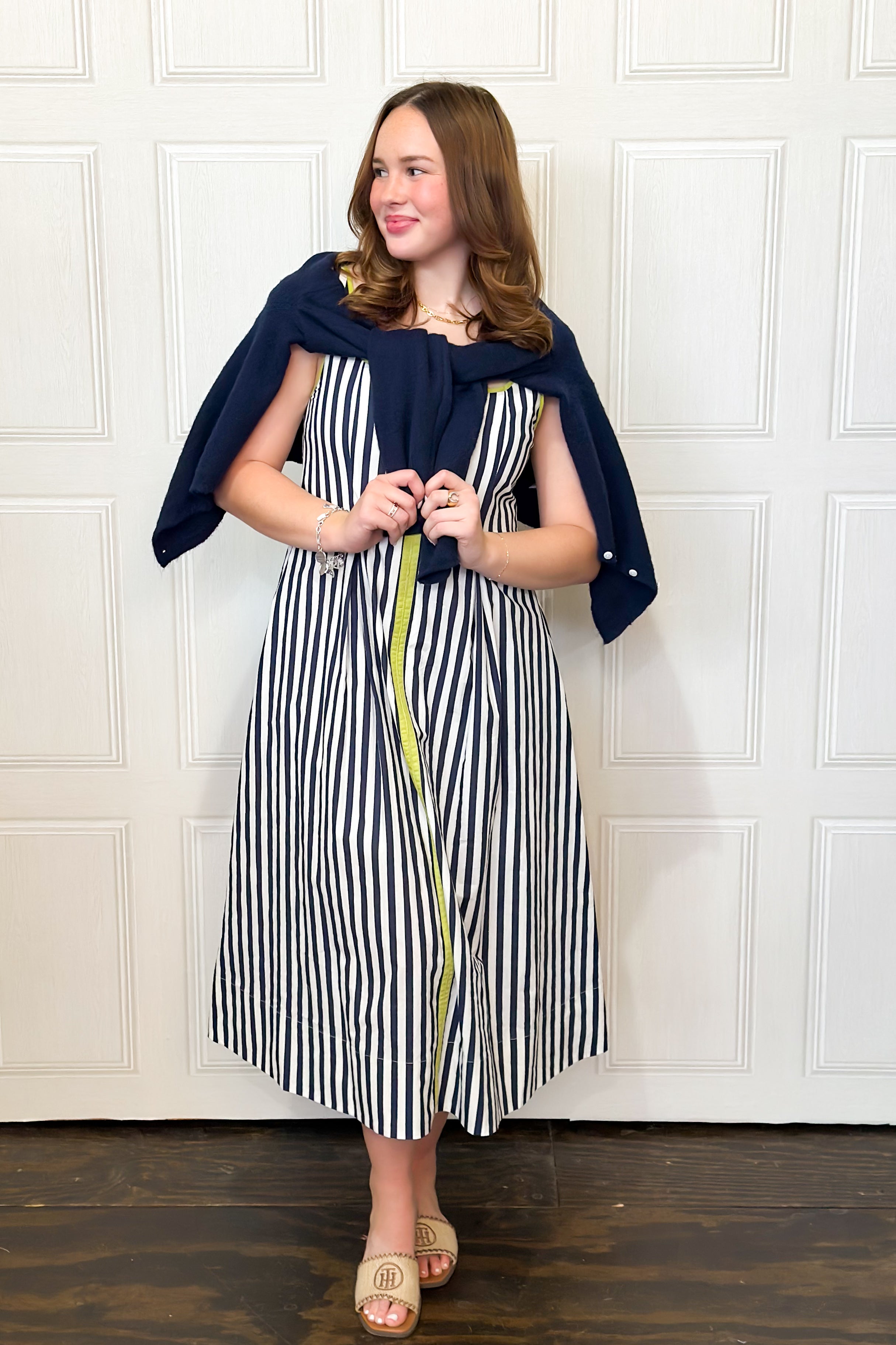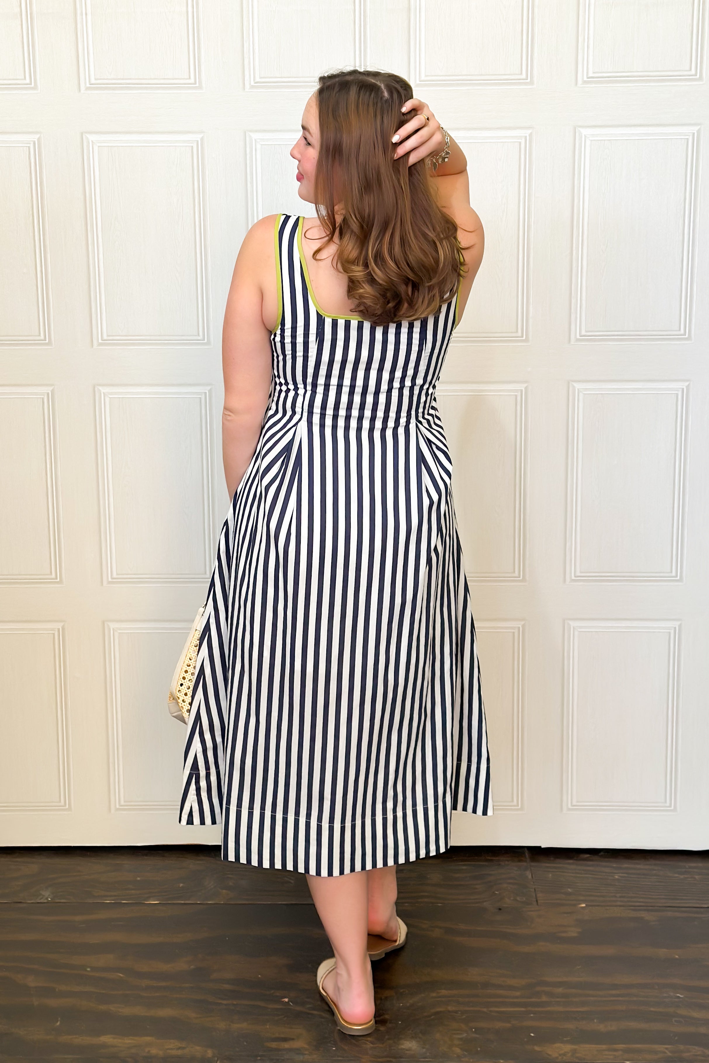 This is the dress for your seaside vacation. This fresh, vibrant, and made for sun-soaked days midi dress brings the sweetest pop of color to a classic silhouette. The timeless stripes with chartreuse trim adds a sunshine vibe. Lightweight, effortless, and flattering, this sundress is the perfect mix of coastal charm and springtime energy.