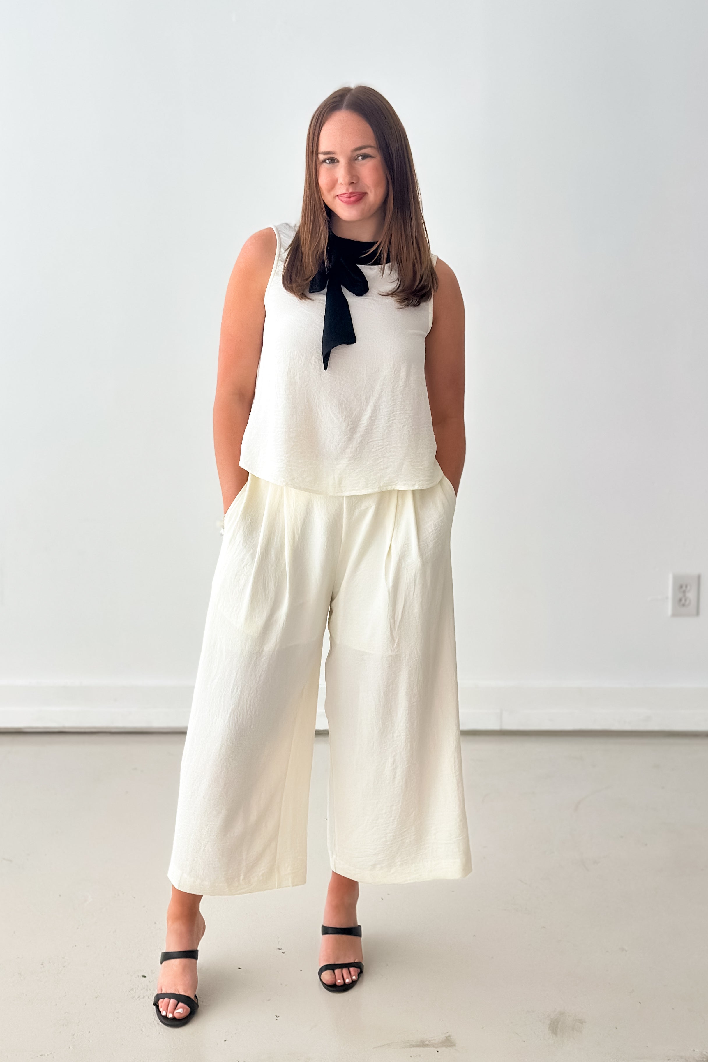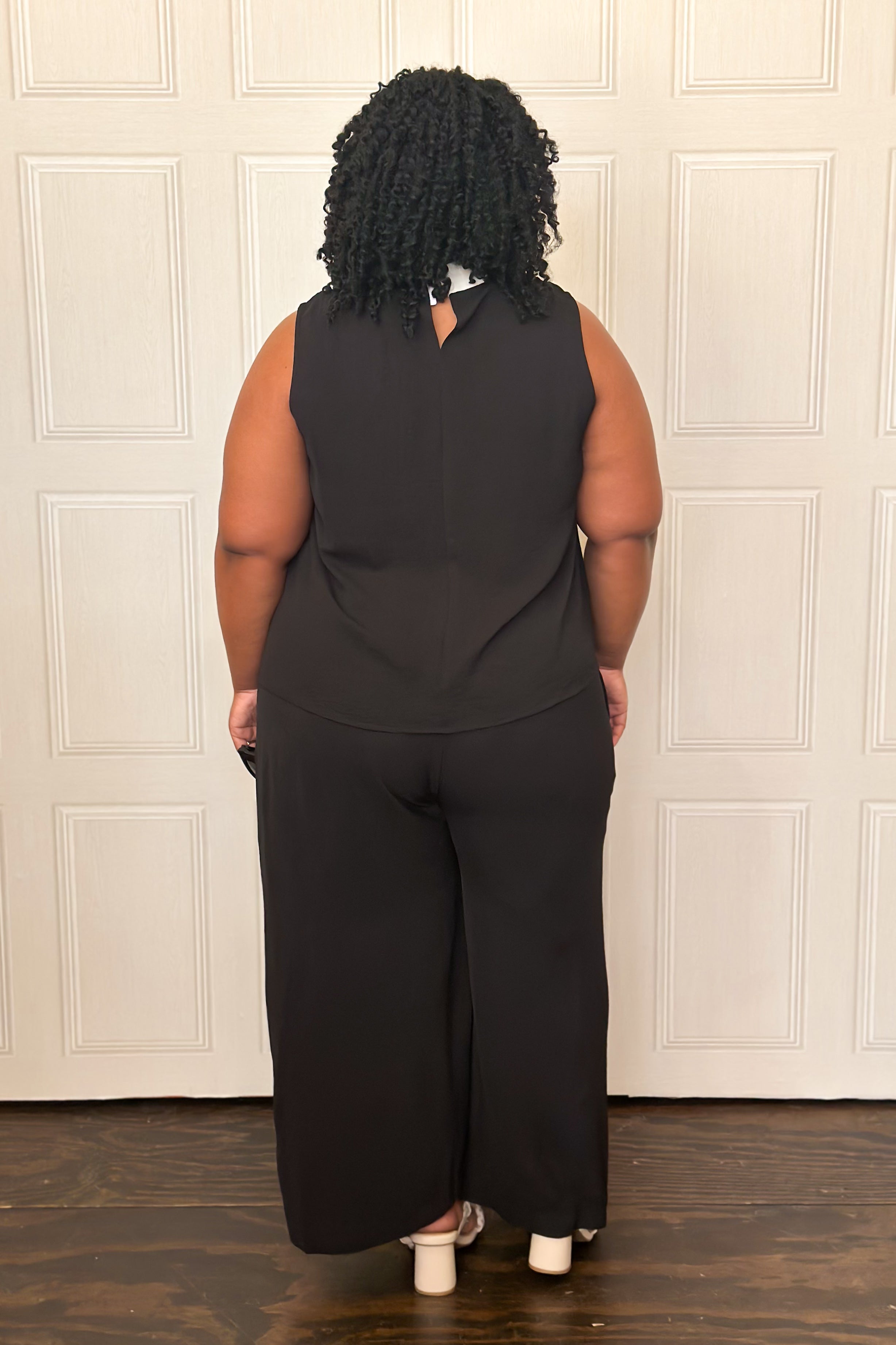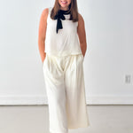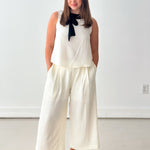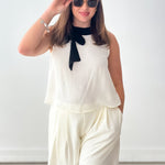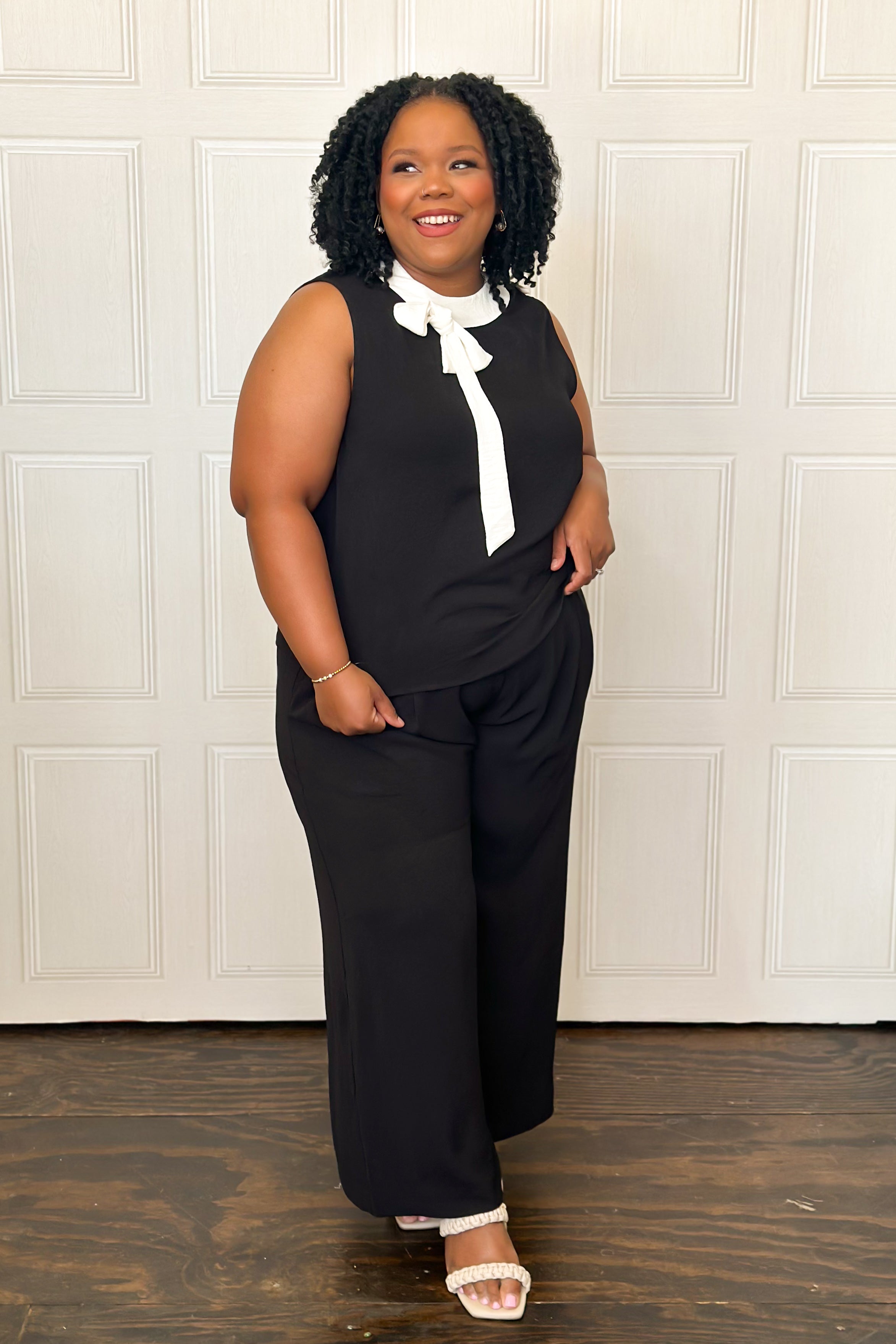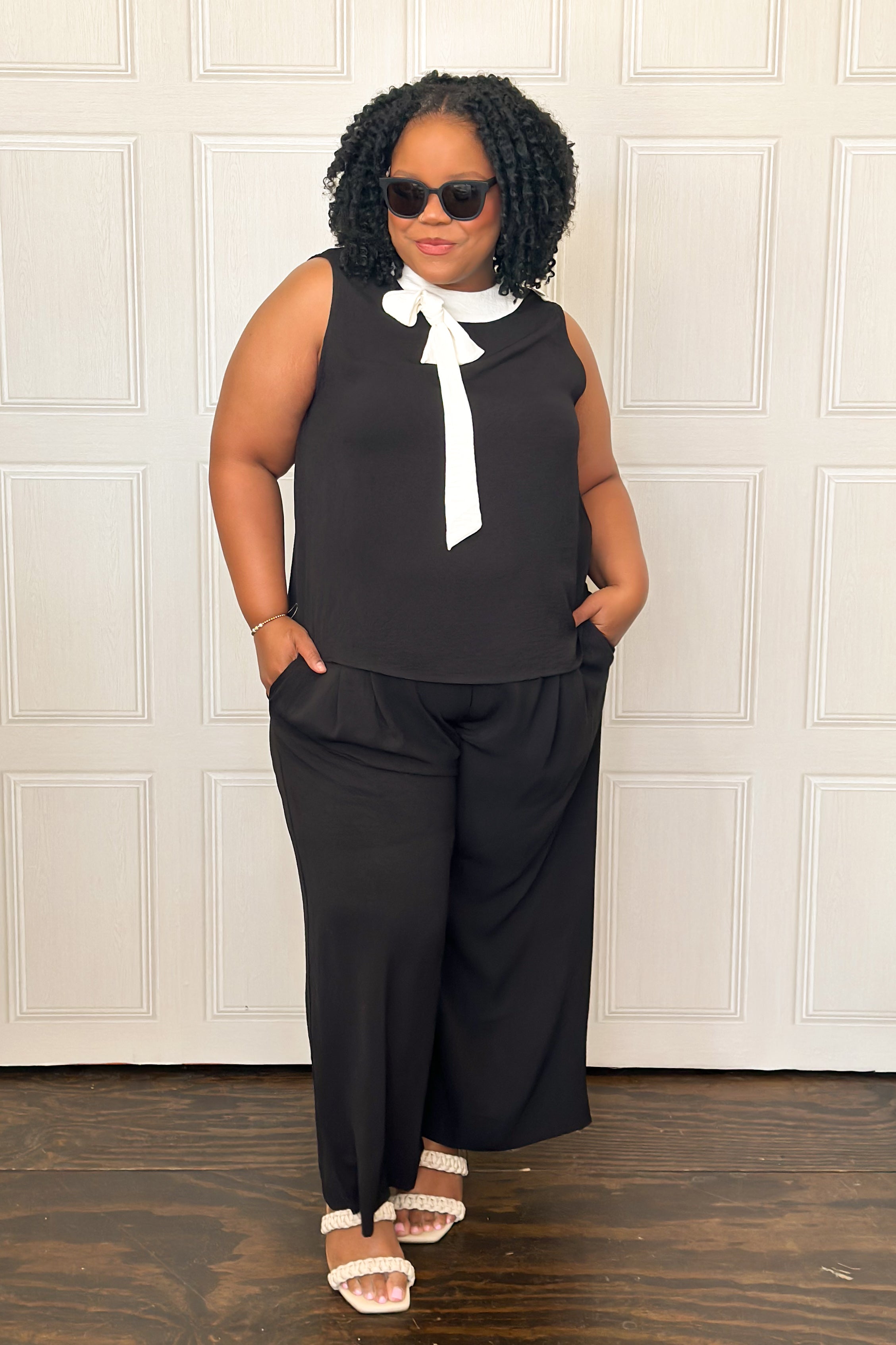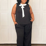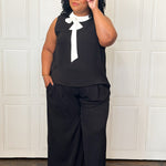 This chic & effortless two-piece set is a standout. The sleeveless top features a contrast bow collar that adds a feminine, elevated touch, while the wide-leg pants balance the look with modern ease. This set is perfect for workdays, presentations, showers, or any event where you want to look refined without sacrificing comfort. Style it with heels for a dressier moment or flats for a polished everyday look—either way, it’s a total power outfit.