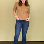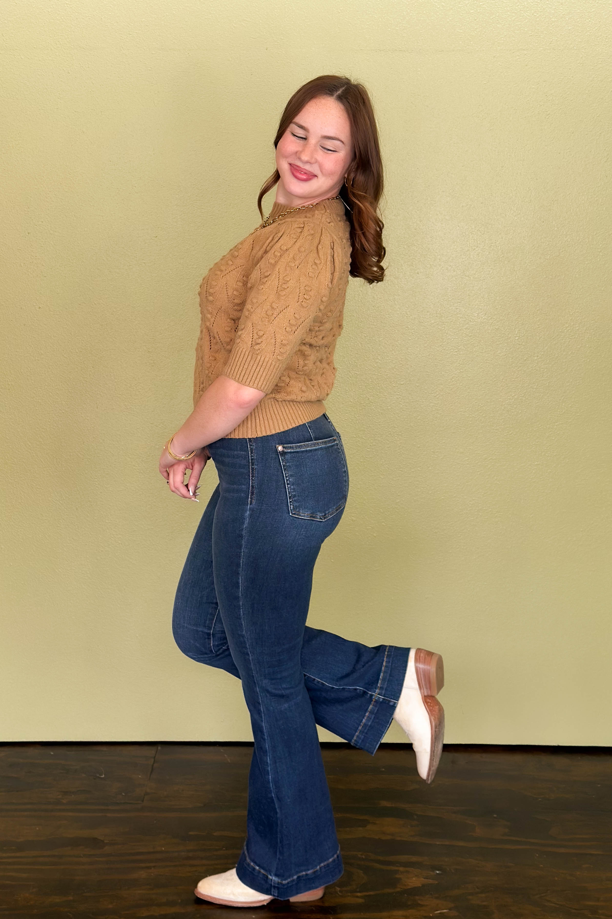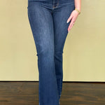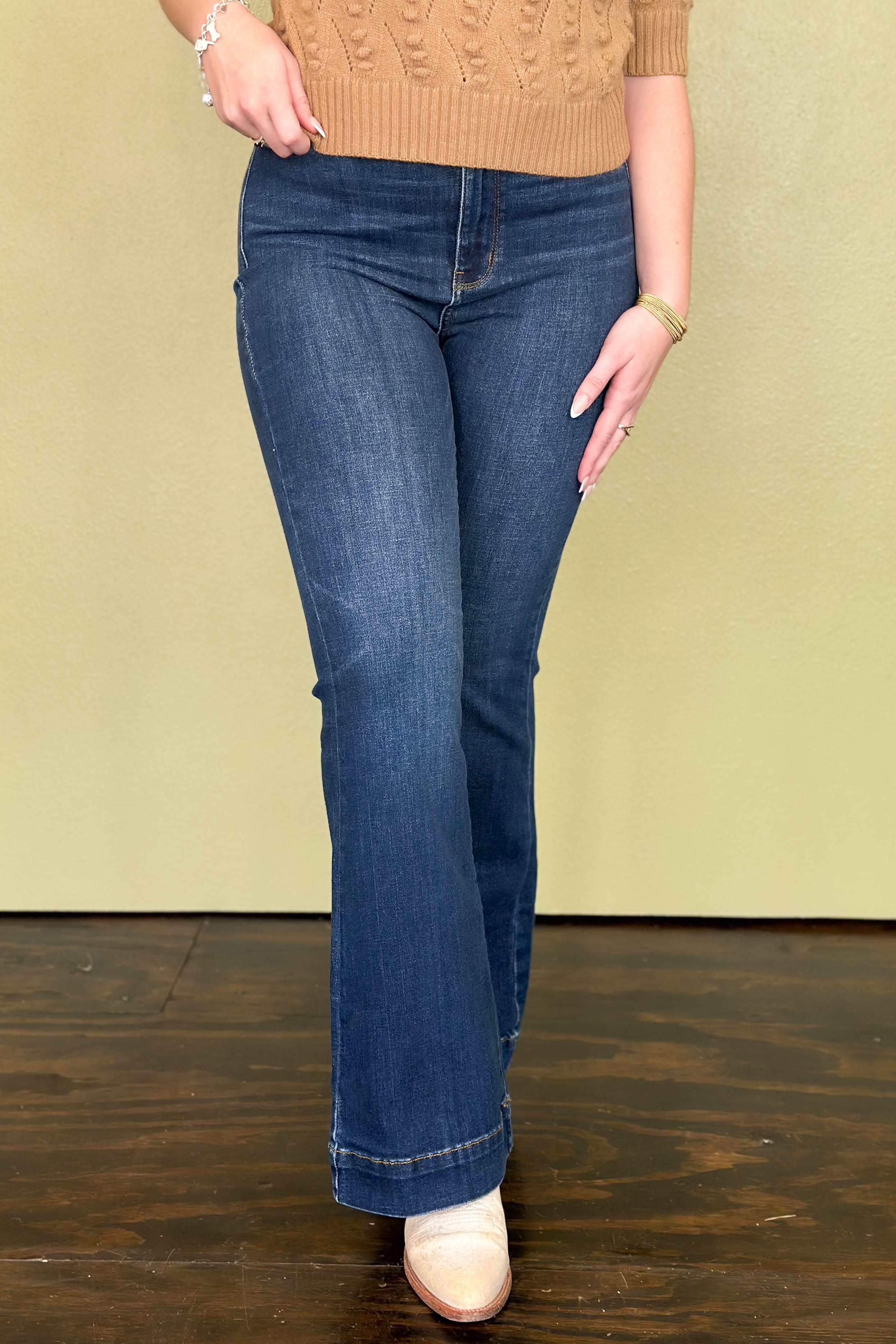 Elevate your denim game with these chic mid-wash flare jeans. Designed with one of the most flattering high-rise fit, they feature front welt pockets and a unique crisscross back belt loop detail that adds a modern twist. The wide hem gives them a relaxed, elongated silhouette — perfect for pairing with everything from tucked-in blouses to cozy sweaters. You loved the wide leg in this same style - now show your love to the flare!