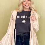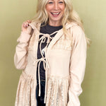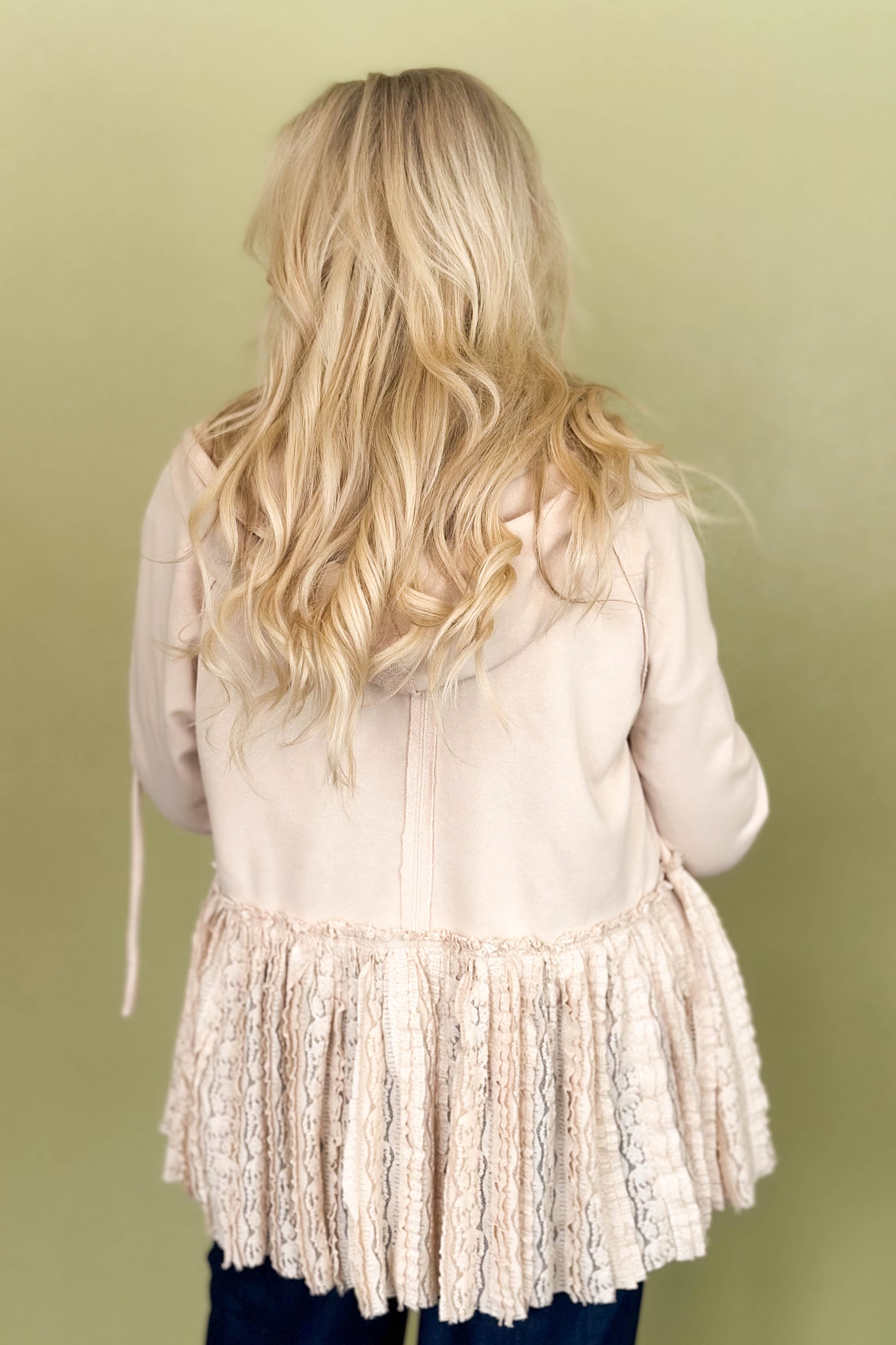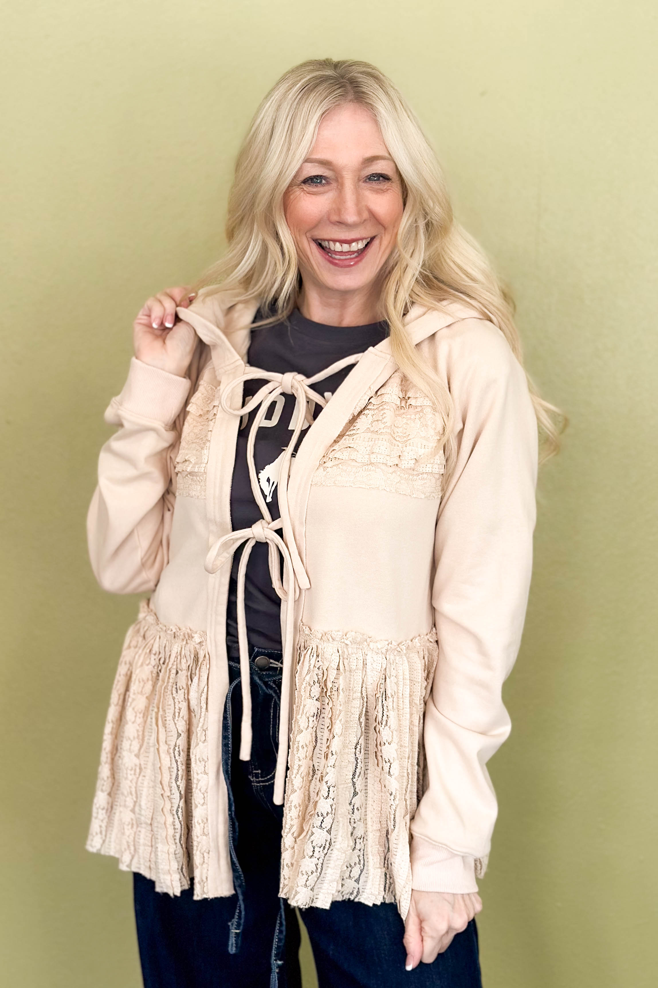 Bring boho charm with this sweet lace terry knit hoodie featuring double tie closures and rustic ruffle accents. Perfect for layering, this easygoing piece adds a touch of texture and whimsy to any laid-back look.