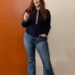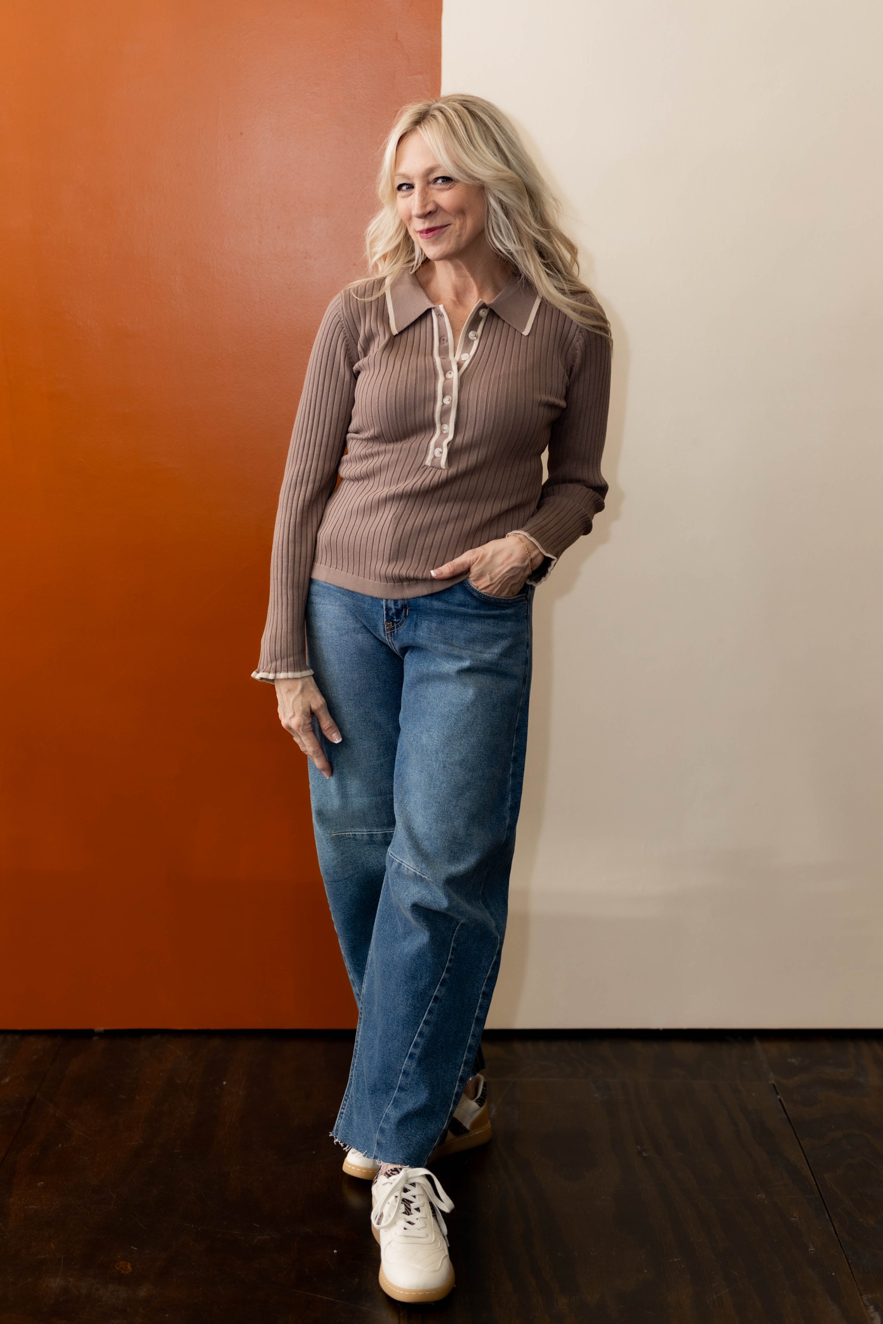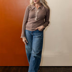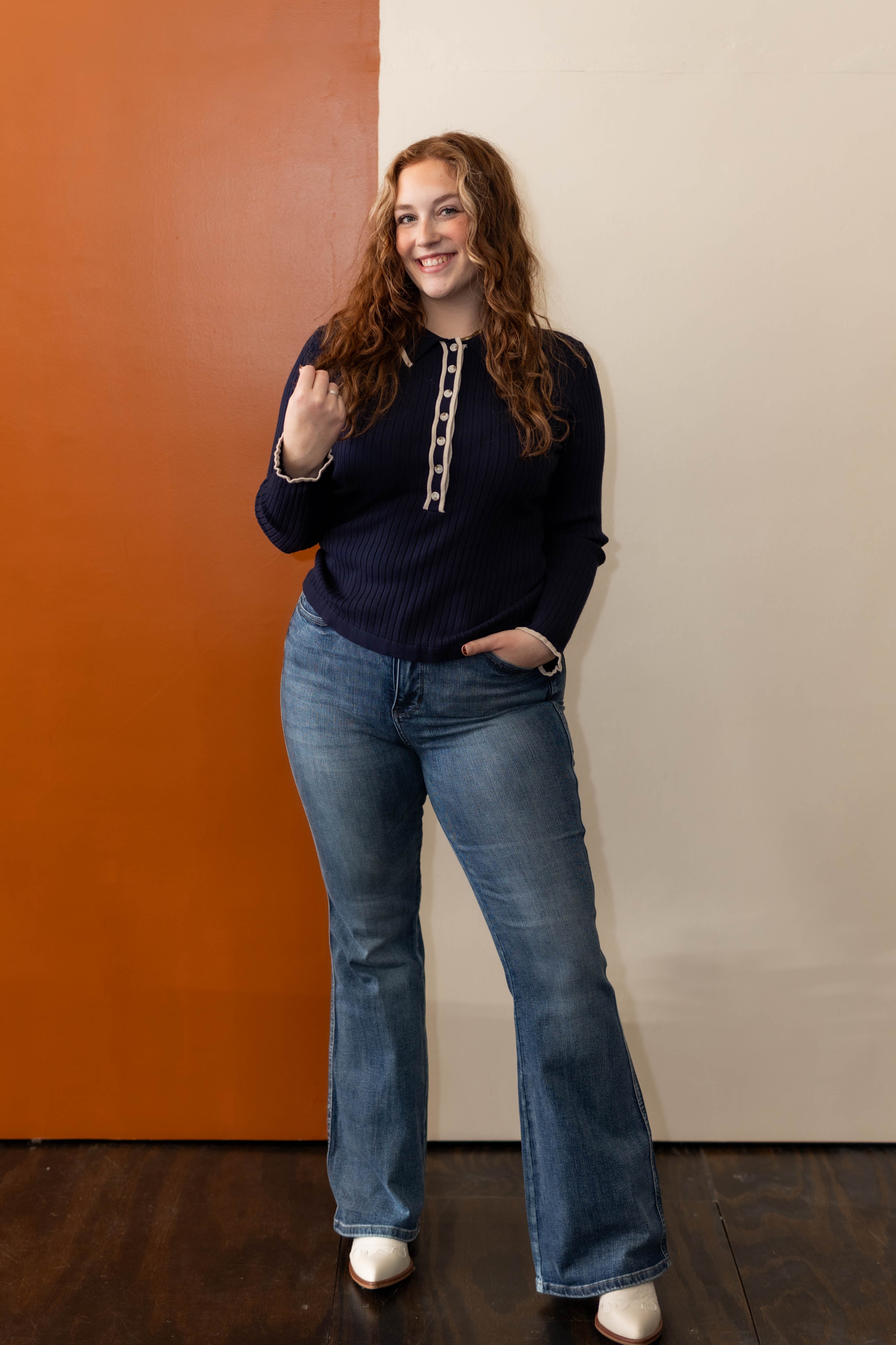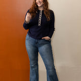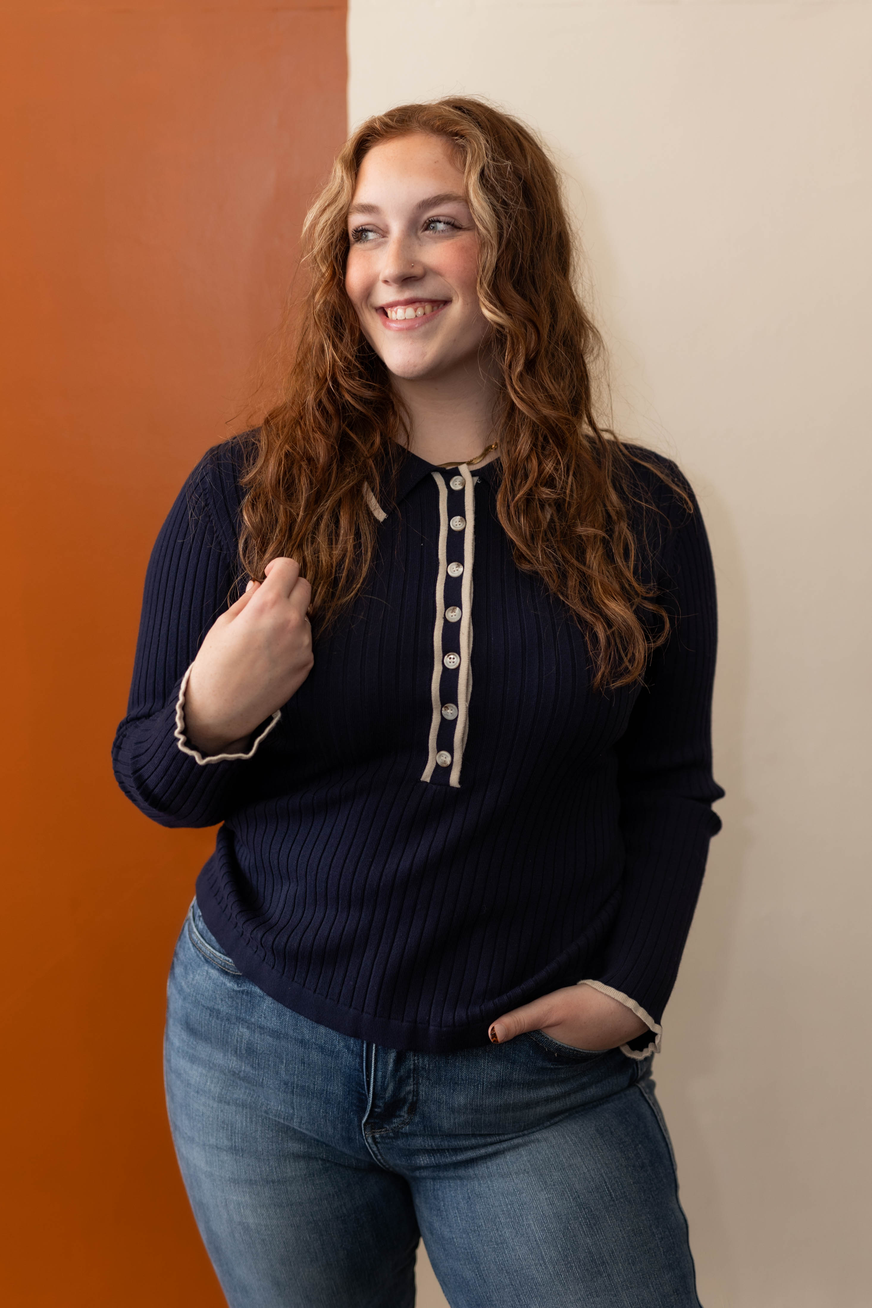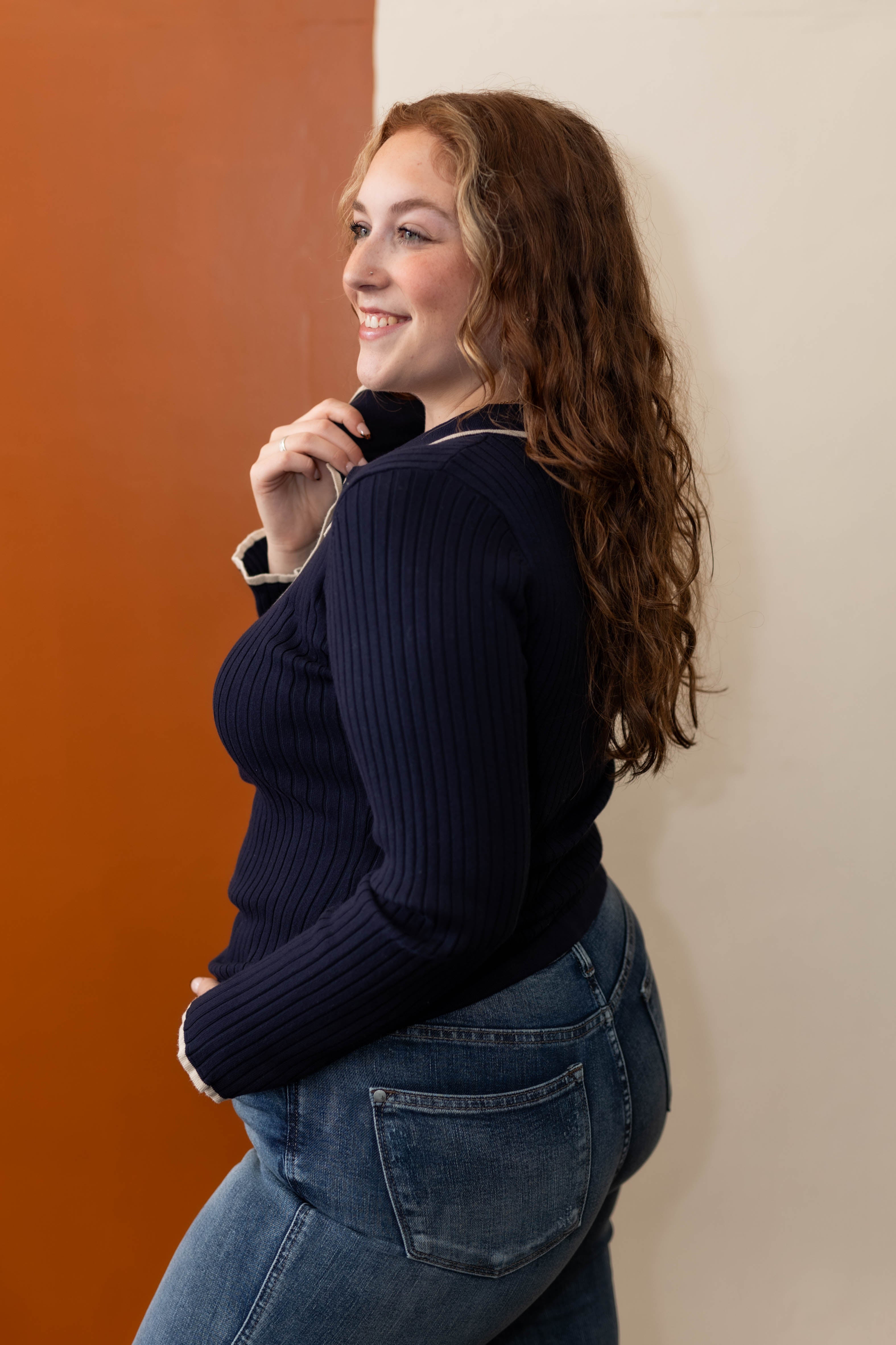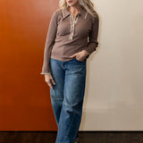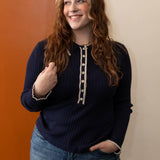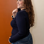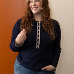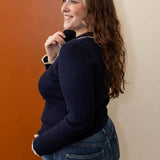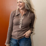 It's time to just stop and enjoy the moment. You can make dressing simple and easy with this ribbed knit collard long sleeve top. With button up detail and contrast trip detail, this lightweight knit top is going to be a favorite with all you blue or colored denim.